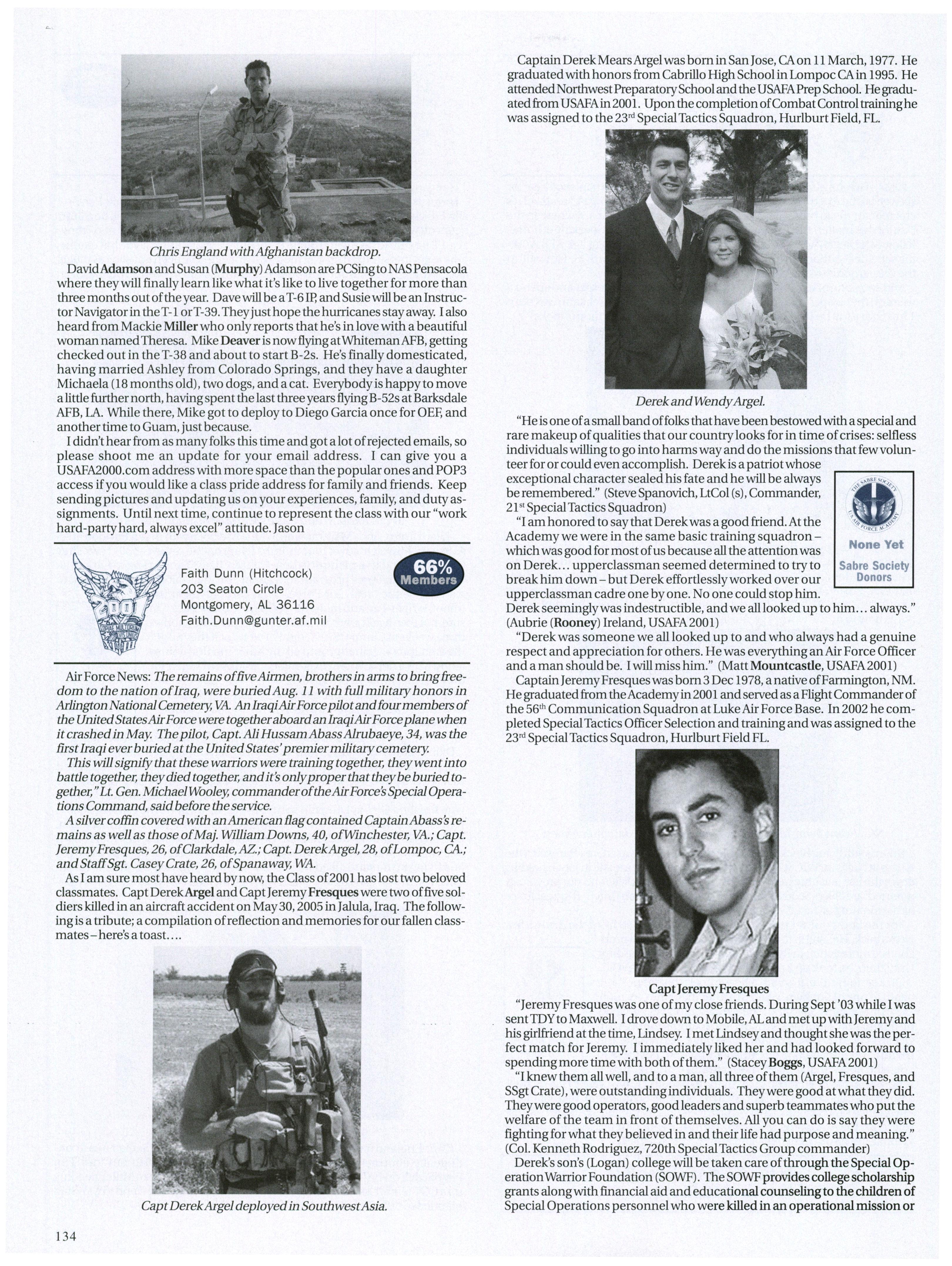 As I am sure most have heard by now, the Class of2001 has lost two beloved classmates. CaptDerekArgel and CaptJeremyFresques were two offive soldiers killed in an aircraft accident on May30,2005 in Jalula, Iraq. The followingis a tribute; a compilation ofreflection and memories for our fallen classmates - here’s a toast....