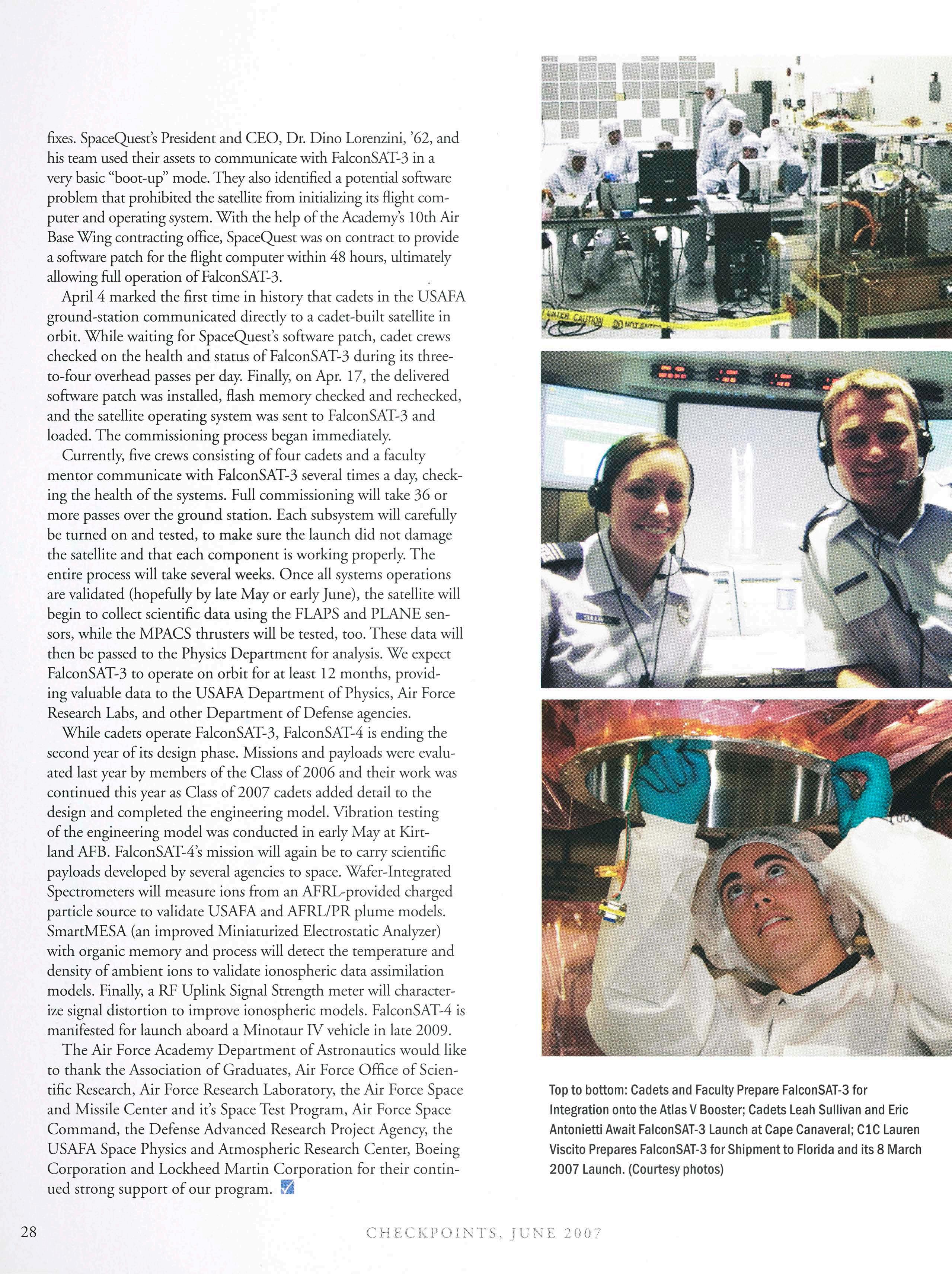 I1 lo june 2007 co umns LETTERS 4 FROM THE BOARD CHAIR 6 LETTER FROM THE ATHLETIC DIRECTOR 10 features 21 AFGHANS TAKEN UNDER WING Grad faculty members help Afghanistan create an Air Force Academy of their own. 26 FALCONSAT PROGRAM REACHES NEW HEIGHTS