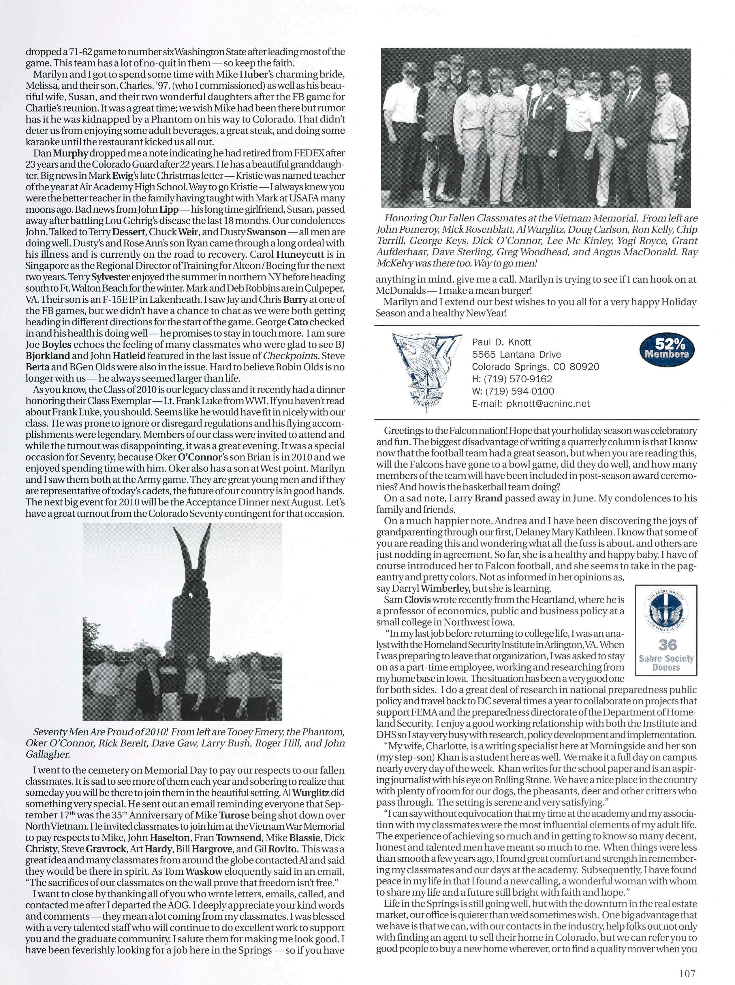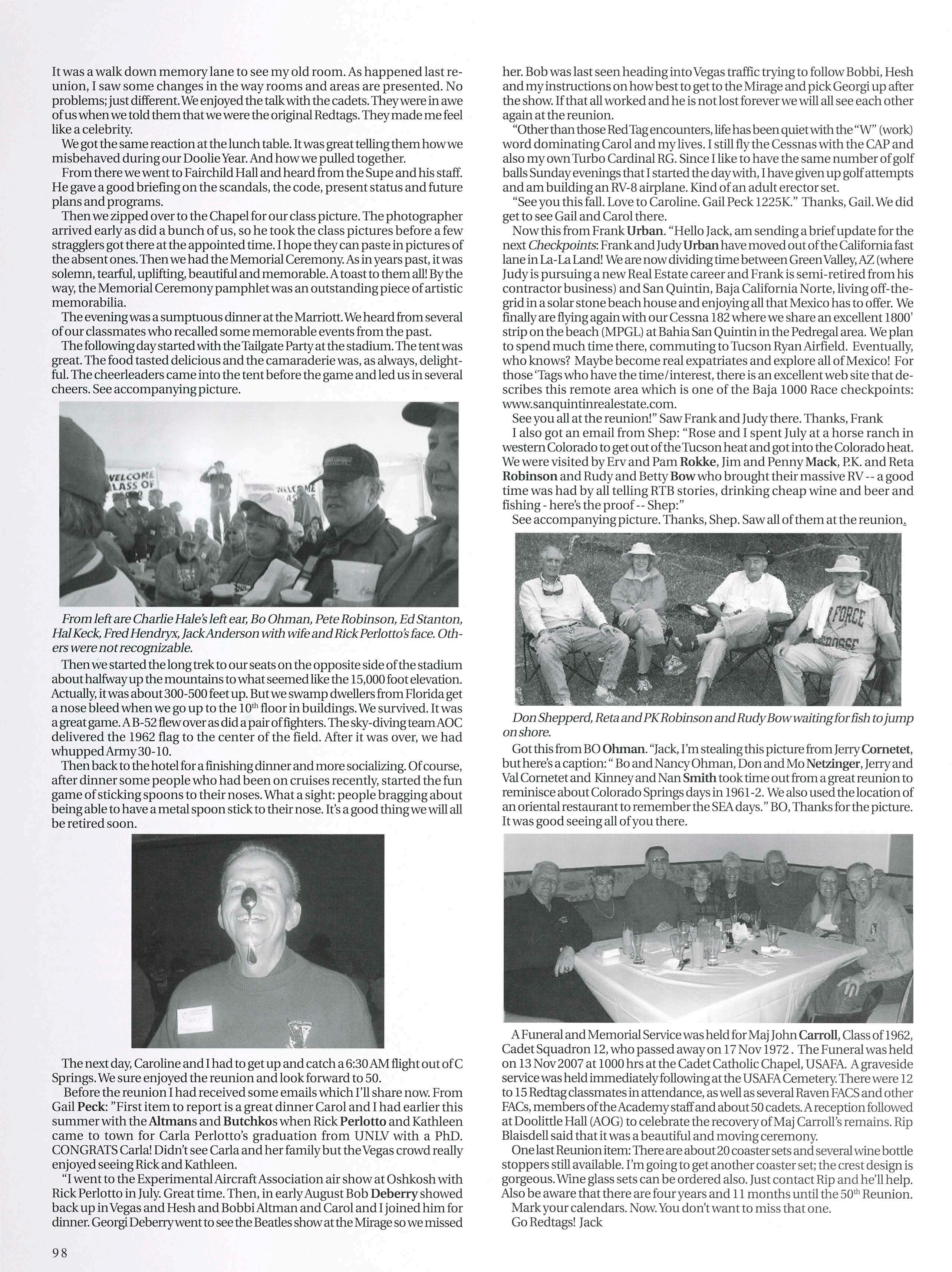 Ruth Whitaker. Attendees arrived Wednesday, Oct. 17. The first official gathering was at 8:30 a.m. for a continental breakfast provided by Kirk. A short meeting was held to elect Stan Keck to a 1-year term as vice president. Then it was off to the AOG where the group was briefed and given a tour by Constituent Liaison MartyMarcolongo, 88 Lunch followed on the StaffTower in Mitchell Hall. After lunch, an Admissions Update Briefing was given by Director ofEnrollment Programs Lt. Col. Steve Orie, ’90, and then on to a tour ofthe Cadet Airfield facilities. Dinner that night was at the Tavern Restaurant at The Broadmoor. Friday started offwith a continental breakfast before heading to the Cadet Library for a briefing and tour by Head Librarian Dr. Ed Scott. As in the past couple of years, 90 minutes flew by. There is never a dull moment when you are with Ed Scott! Then off to the Falcon Stadium Press Box for the Football Rally Luncheon, including remarks by the new HeadFootball Coach Troy Calhoun, 89. Then back to Fairchild Hall, where the superintendent gave an update on what’s happening at USAFA. Dinner was at the Elephant Bar Restaurant where everybody had a great meal and a great time together. Saturday morning before the game, Kirk and Jill set up and hosted a tailgate lunch and everybody got revved up for the football game, in which Air Force beat Wyoming. That night we said farewell to each other at the Flying W Ranch Winter Steak House and started making plans for next years convention which will be held in Sept, or Oct. Pictures were taken and they will be on the AOG Silver Falcon Web site for everybody to see. Hope to see more ofyou next year.