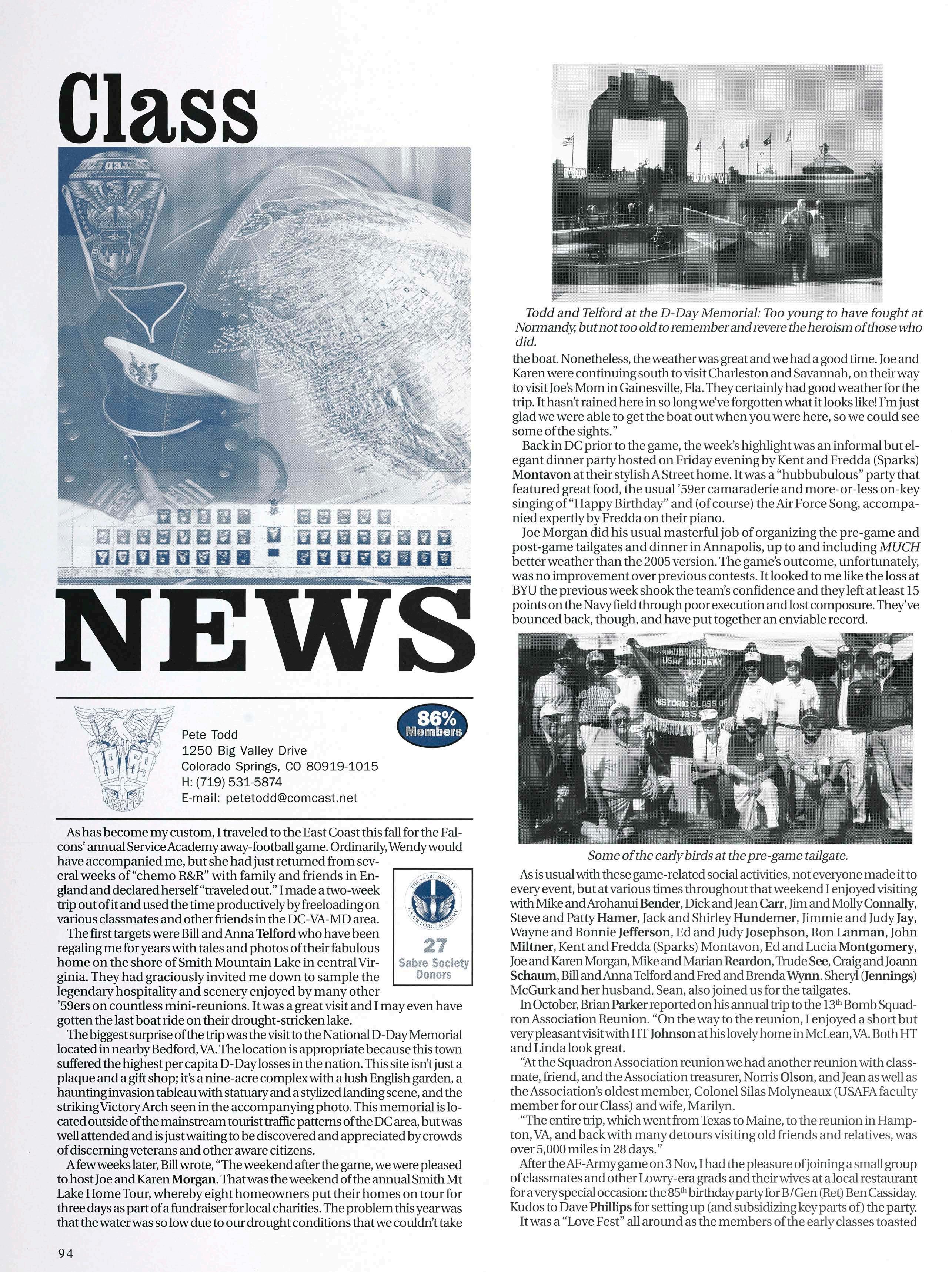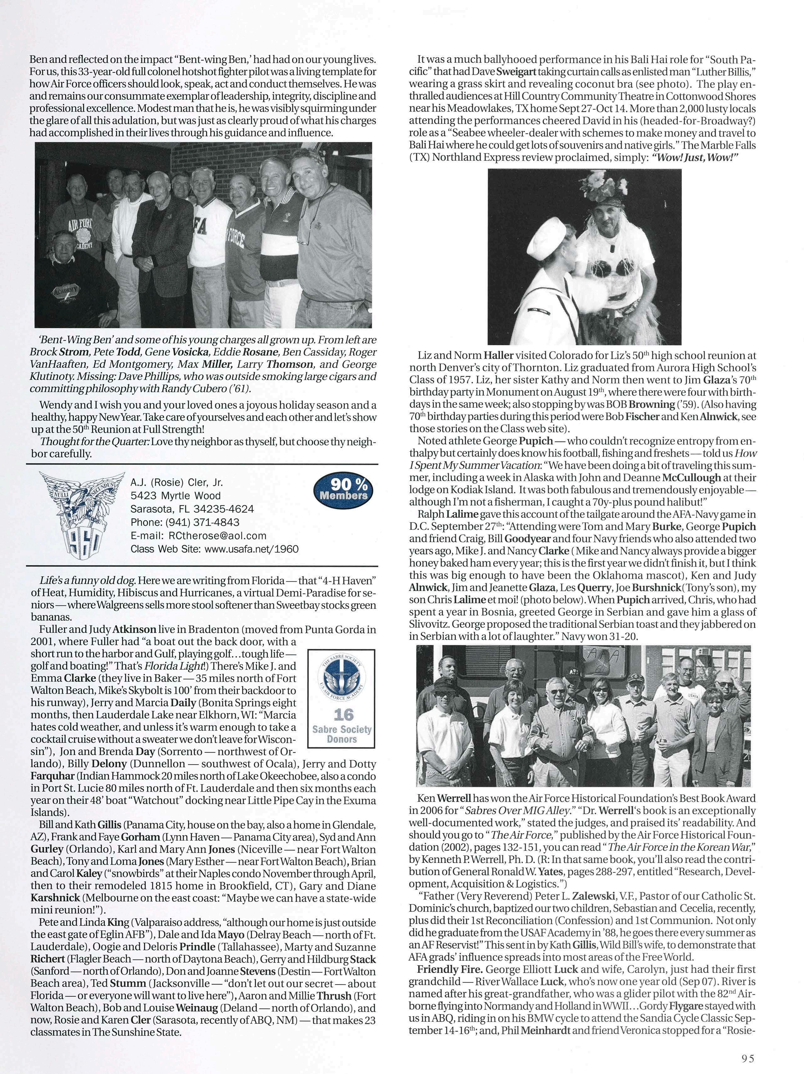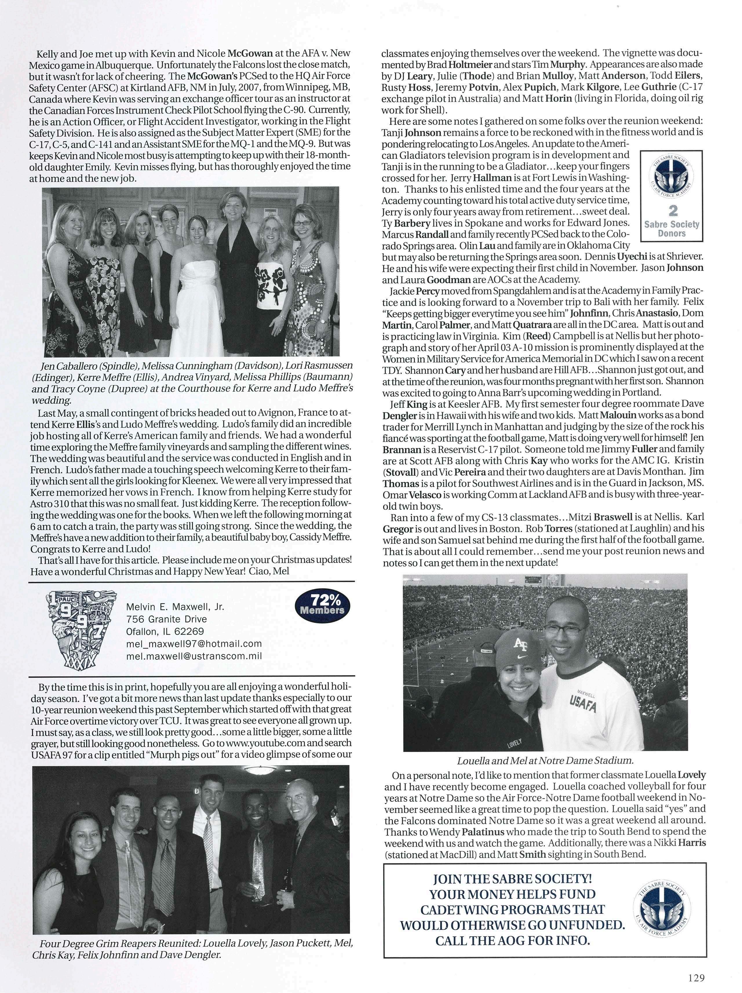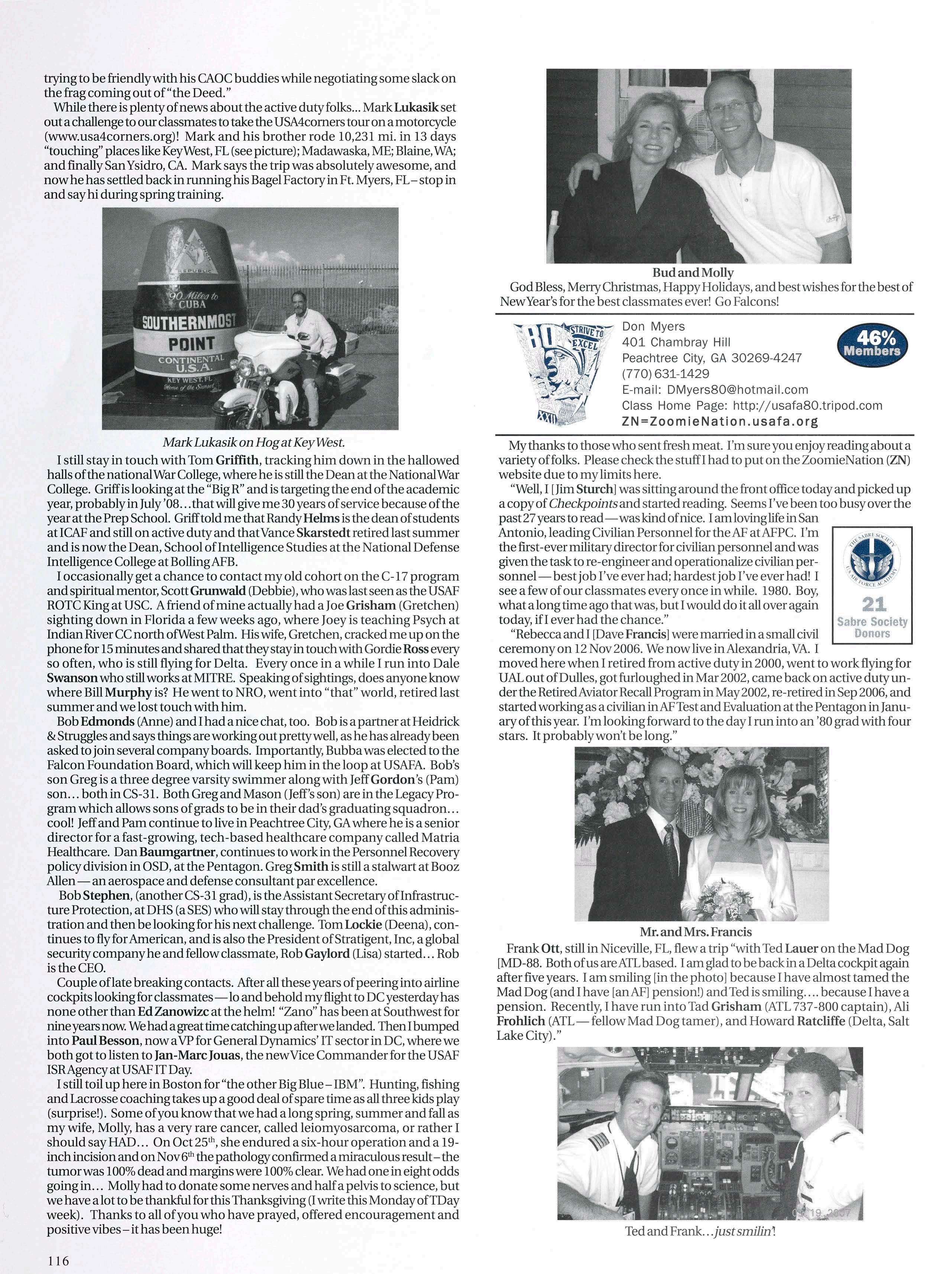 Second, we have news ofmore classmates seeing theworldthrough theAF lens. Chris Marslender and Chris High are flyingF-16s out ofSpangdahlem AB, Germany and Chris is also currentlyengaged. Justin Banez recently returned fromhissecond deploymentinIraq—welcomehome! LeeAlexander is flying C- 17s and incredibly difficult to get a hold ofbecause he is always