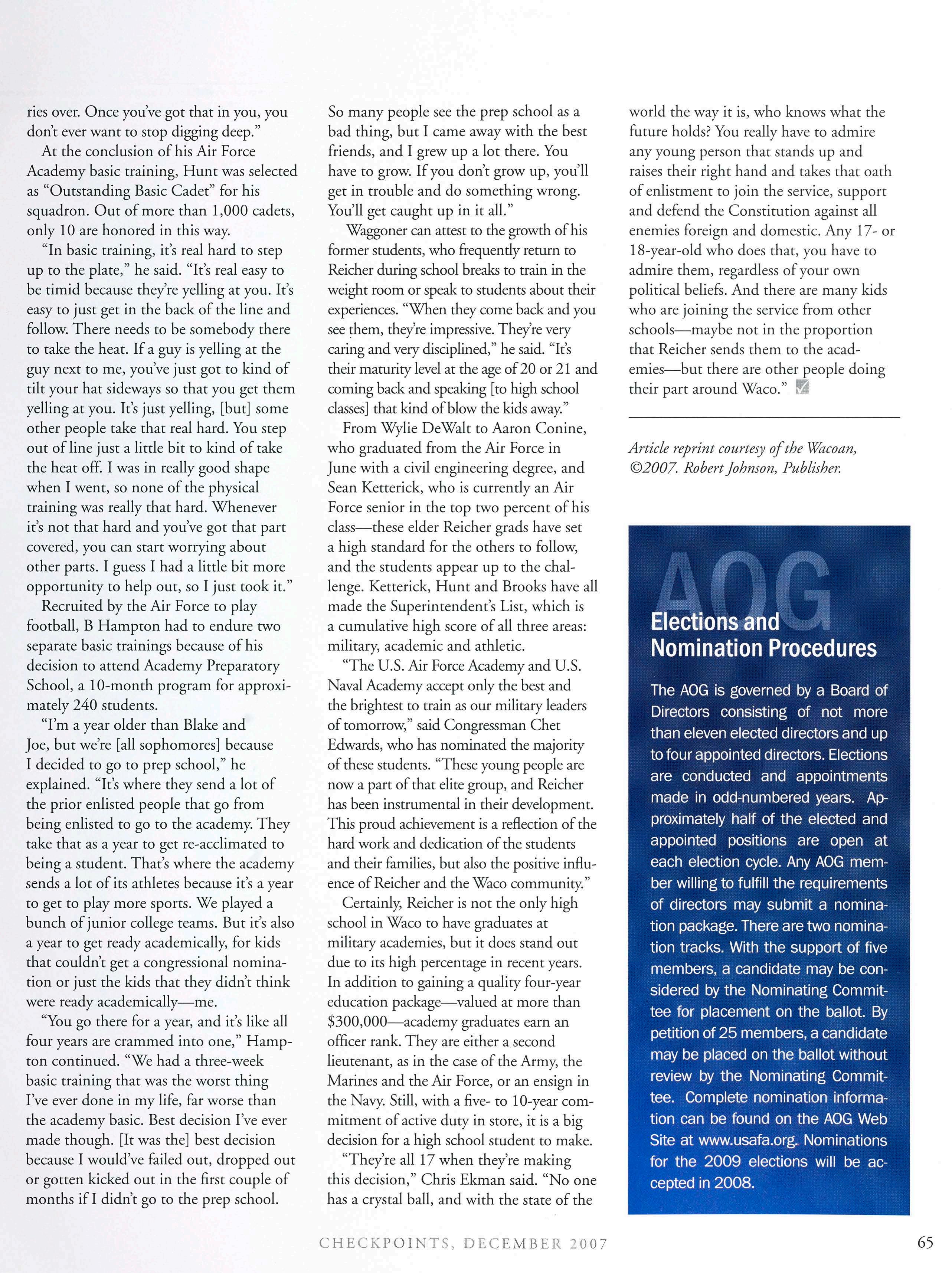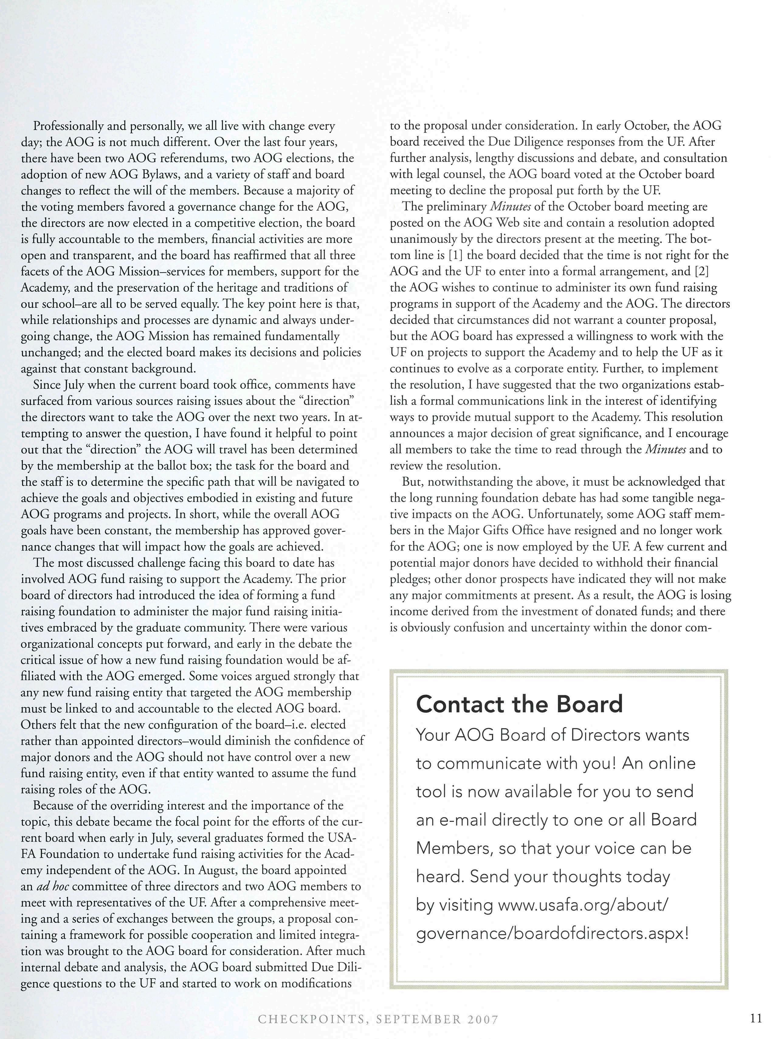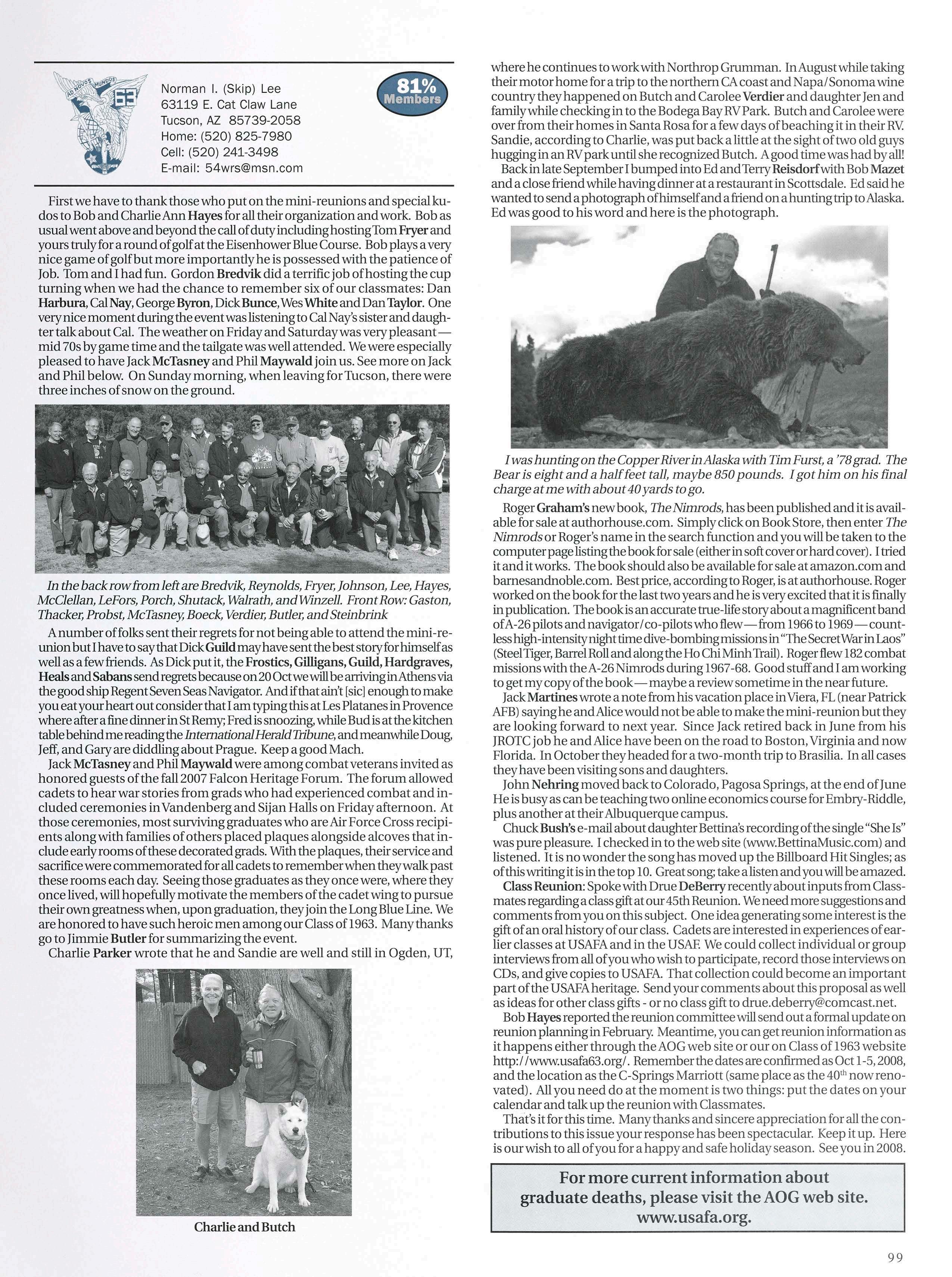 ► ► ► ► Receive up-to-date information on your reunion and alumni chapters Ensure you receive the latest issue of Checkpoints magazine and AOG information Keep in touch with the current events and activities at the Air Force Academy Keep in touch with your classmates visit the AOG Web site (719) 472-0300 to update your bio today