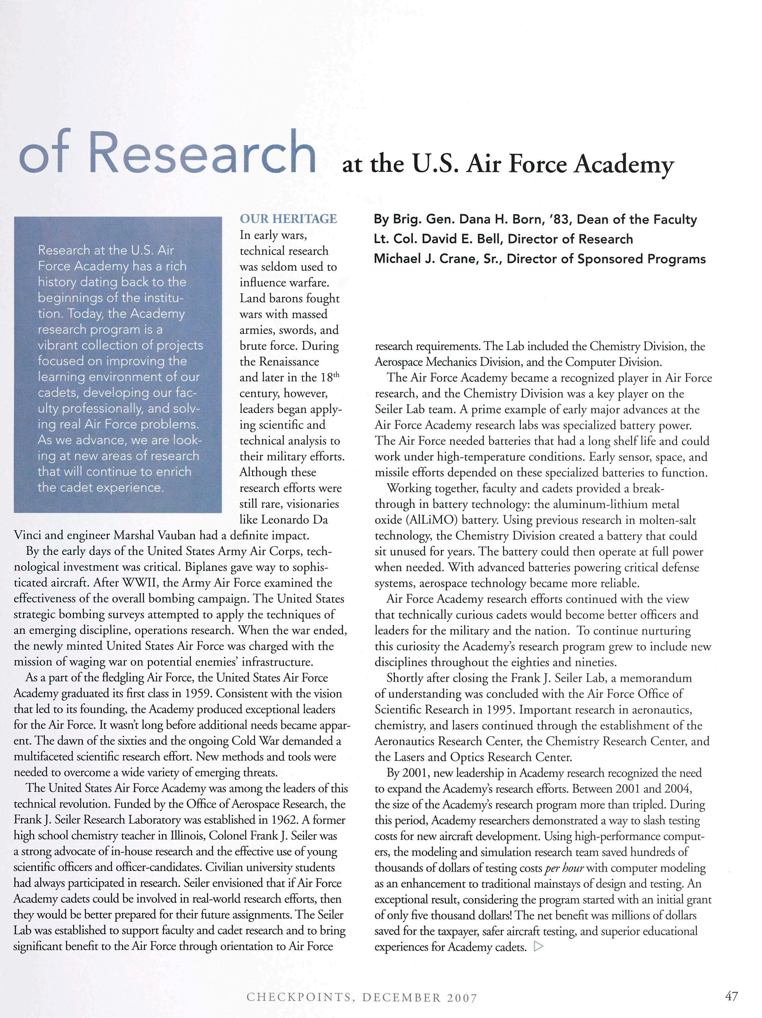 In Oct., the USAFA faculty, led by Col. Dave Swanson, reviewed the most significant space-related activities at the Academy with Space Group leadership. A highlight ofthat meeting was the opening of contacts between the group and the Academy’s Eisenhower Center for Space and Defense Studies, represented by Maj. Deron Jackson, the center’s deputy director. The center has organized several significantworkshops on key space topics, such as the future ofspace commerce and the potential for space-delivered solar power, and publishes Space andDefense, a new journal that emphasizes original works in the field (including cadet papers). The center will also continue to hold issue-specific forums, including a planned activity that will focus on new space policy issues for the next administration. The AOG andthe Space Group will continue to provide support to the center.