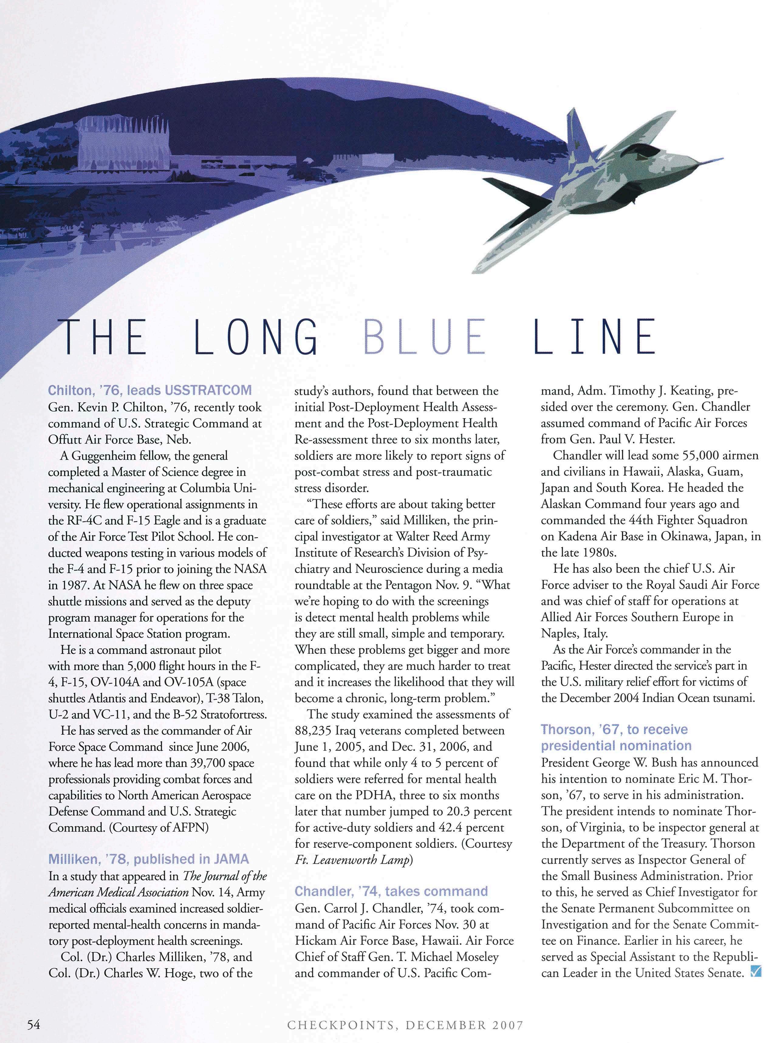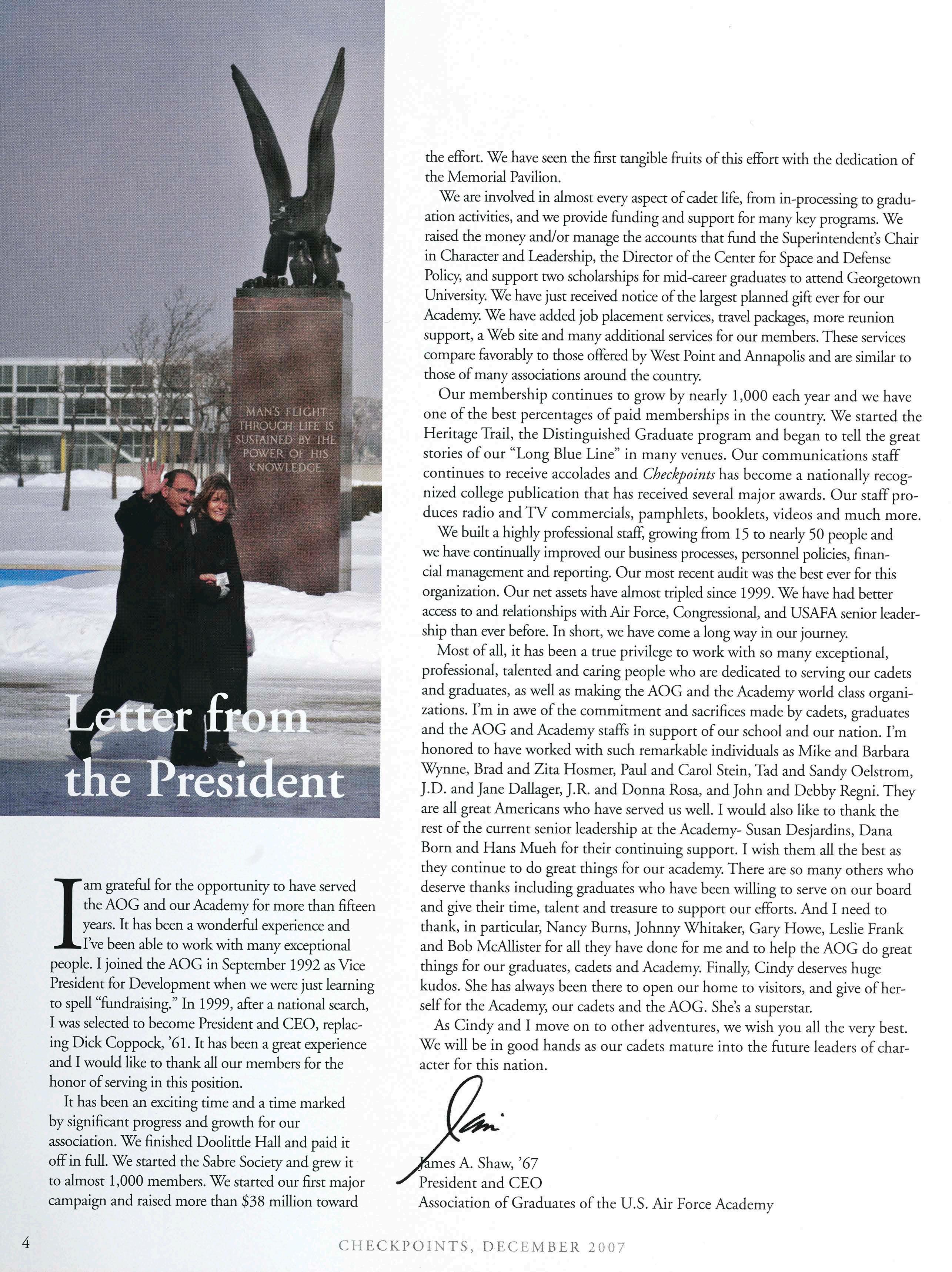 The chapter is proud to support the Academy on multiple levels. Nancy (Mariano) Kudla, ’80, is serving as one of the two graduate Presidential appointees to the Board ofVisitors. Jim Wheeler, ’64, was recently elected as a member and Chairman of the AOG Board of Directors.