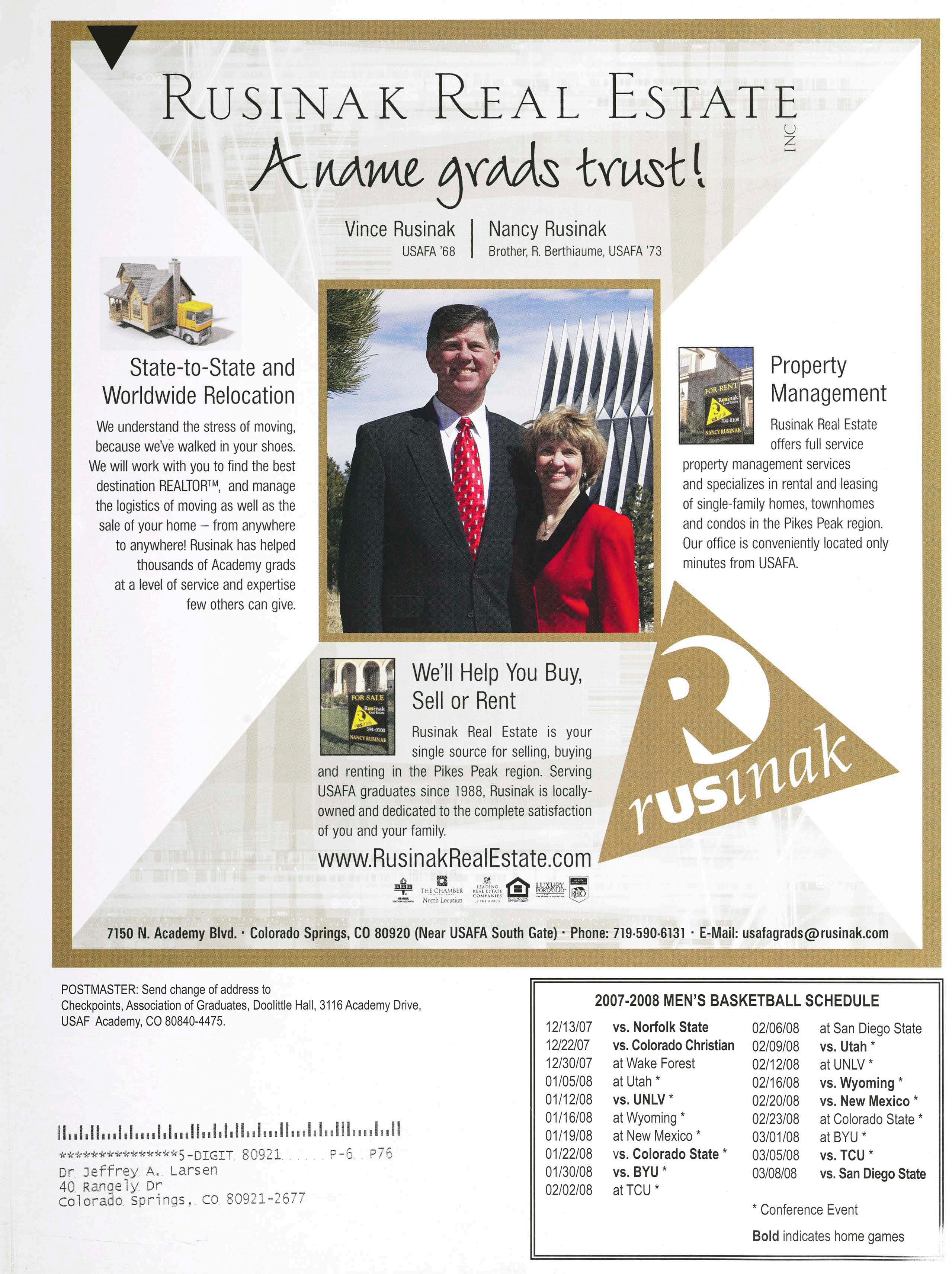 SINAK m SpIfIIJ Rusinak Real Estate »E....JSaBi 0ffers fUn service property management services and specializes in rental and leasing of single-family homes, townhomes and condos in the Pikes Peak region. Our office is conveniently located only minutes from USAFA. U || iiMSHB Rusinak Real Estate is your IllIBilli single source for selling, buying and renting in the Pikes Peak region. Serving USAFA graduates since 1988, Rusinak is locallyowned and dedicated to the complete satisfaction of you and your family. www.RusinakRealEstate.com LUXURY PORTA3IJO UADSNO REAL ESTATE COMPANIES' I HE CHAMBER North location Colorado Springs, CO 80920 (Near USAFA South Gate) Phone: 719-590-6131 E-Mail: usafagrads@rusinak.com POSTMASTER: Send change of address to Checkpoints, Association of Graduates, Doolittle Hall, 3116 Academy Drive, USAF Academy, CO 80840-4475. 2007-2008MEN’S BASKETBALL SCHEDULE 12/13/07 vs. Norfolk State 12/22/07 vs. ColoradoChristian 12/30/07 at Wake Forest 01/05/08 at Utah 01/12/08 vs. UNLV 01/16/08 at Wyoming 01/19/08 at NewMexico 01/22/08 vs. Colorado State 01/30/08 vs. BYU 02/02/08 at TCU 02/06/08 at San Diego State 02/09/08 vs. Utah 02/12/08 at UNLV 02/16/08 vs. Wyoming 02/20/08 vs. New Mexico 02/23/08 at Colorado State 03/01/08 at BYU 03/05/08 vs. TCU 03/08/08 vs. San Diego State Conference Event Bold indicates home games
