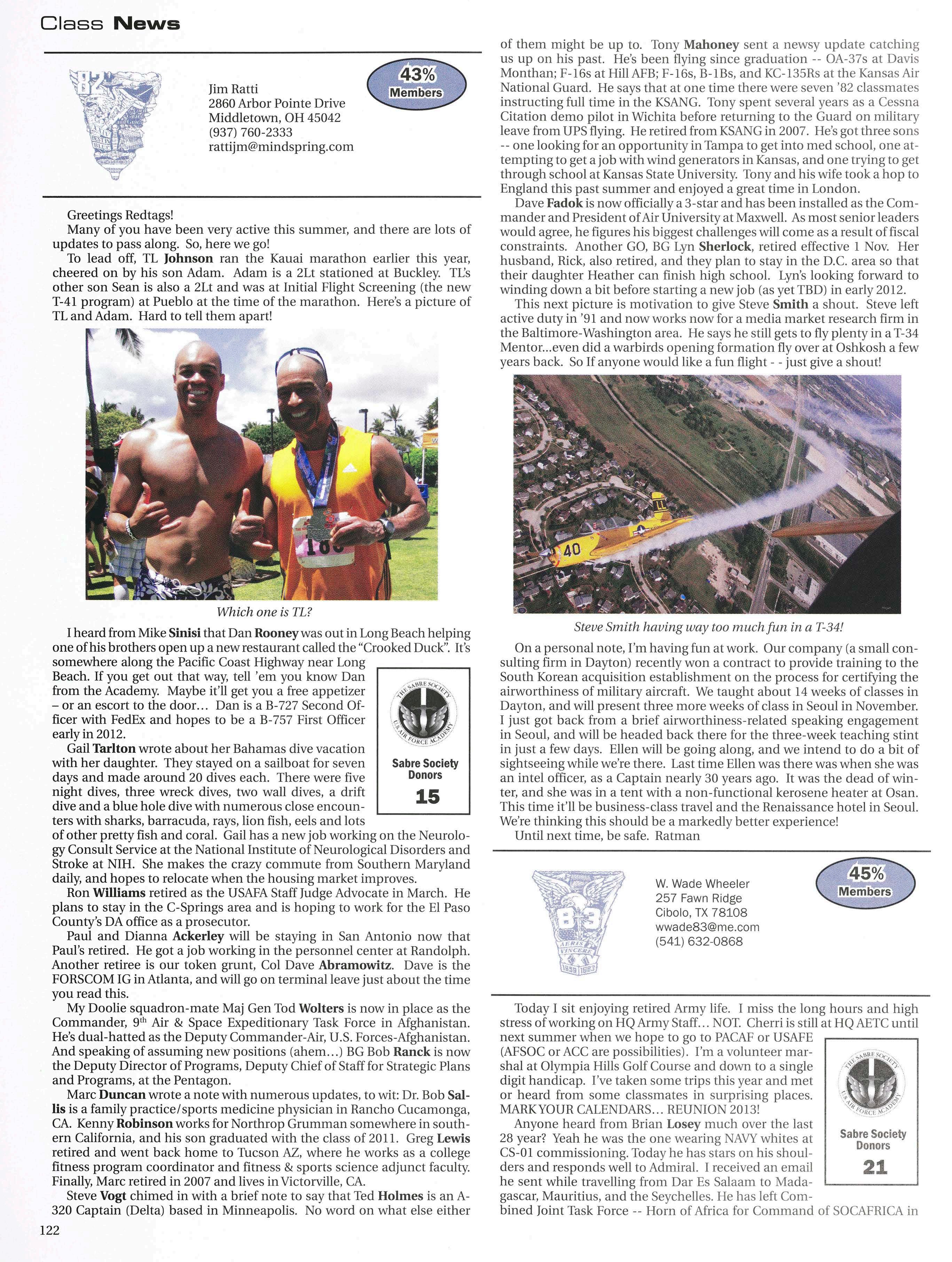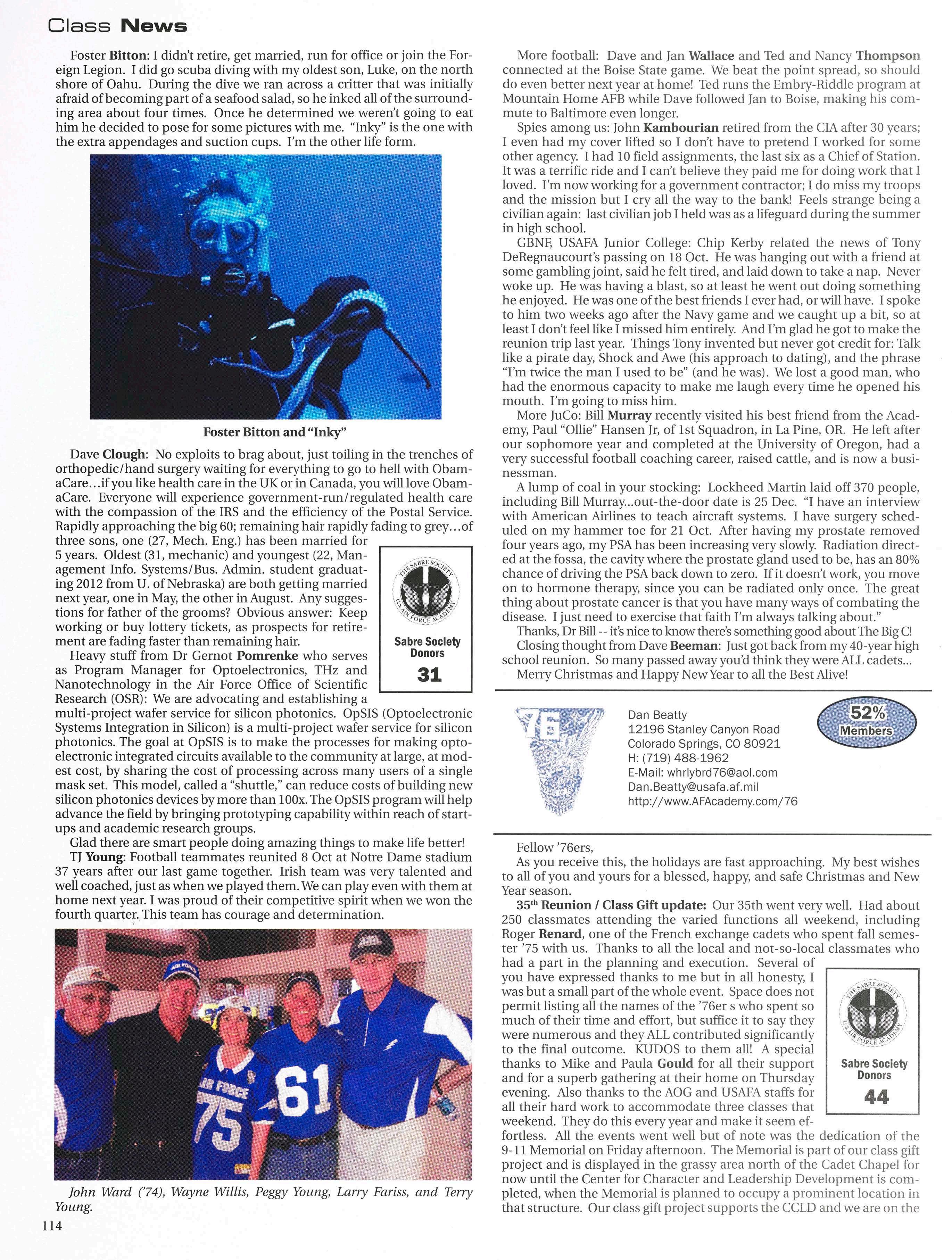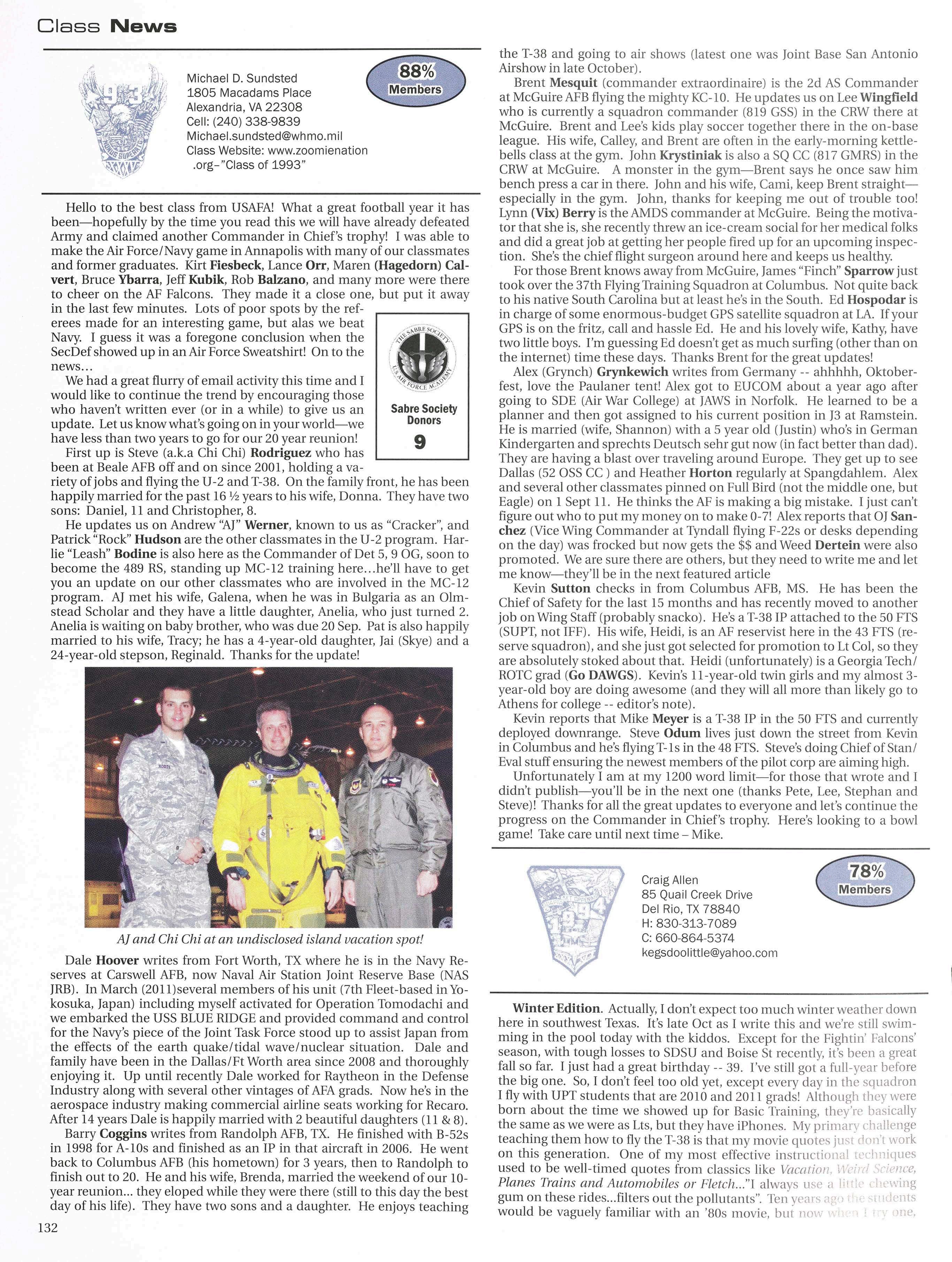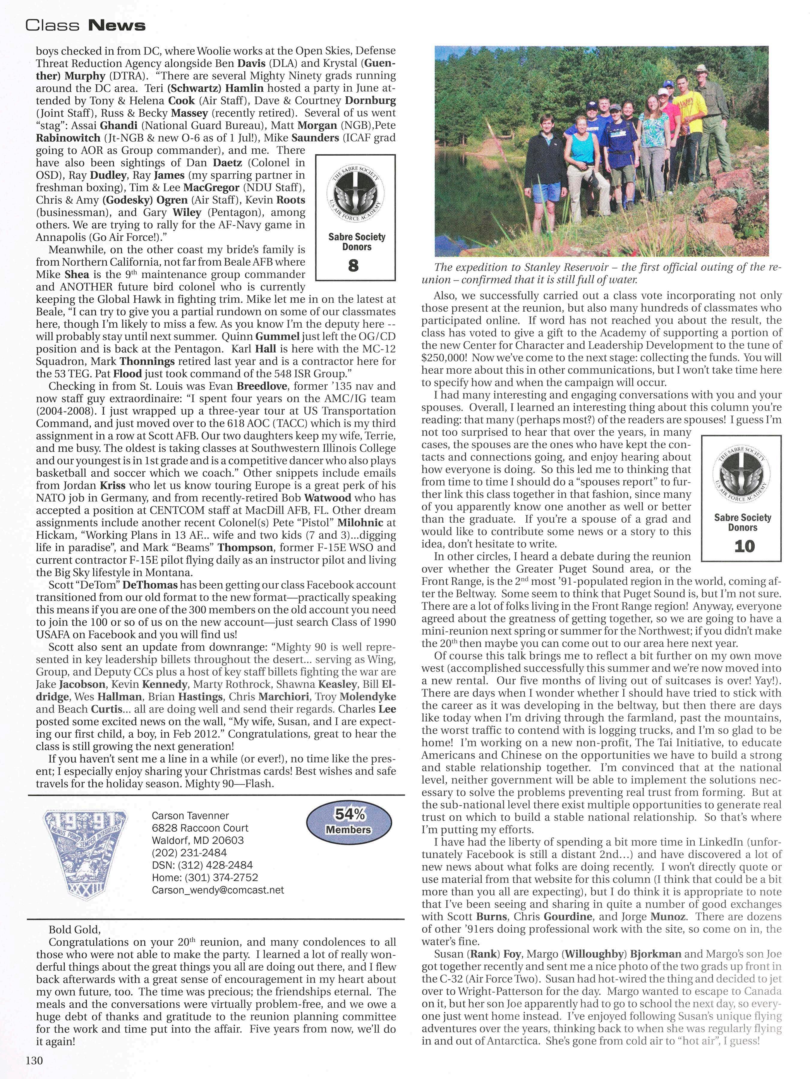 graduates. In conjunction with the Navy football game we sponsored a tailgate that was attended by over 1,000 folks. Along with Bethany and Joey Plank, ’03, and Alex Granados, ’04, we also sponsored a golf outing at the ArmyNavy Country Club and worked with the Endowment to do a donor appreciation dinner at the same venue. Back in Colorado, we held both wine tasting and Scotch tasting events at Doolittle Hall and an AF-Notre Dame Game Watch at the Denver Athletic Club. We also sponsored a well attended AOG night with the Colorado Rockies. The AOG also held a tailgate at Boise State and a well attended Fan Fest at New Mexico this past season. We sponsored a golfouting at the SeaCliffCountry Club in Southern California and assisted the Endowment with a golfouting and dinner in Chicago. All ofthese events have given our membersthe opportunity to get together, connect or re-connect, socialize, network, and just enjoy being in the company offellow Air Force Academygraduates.