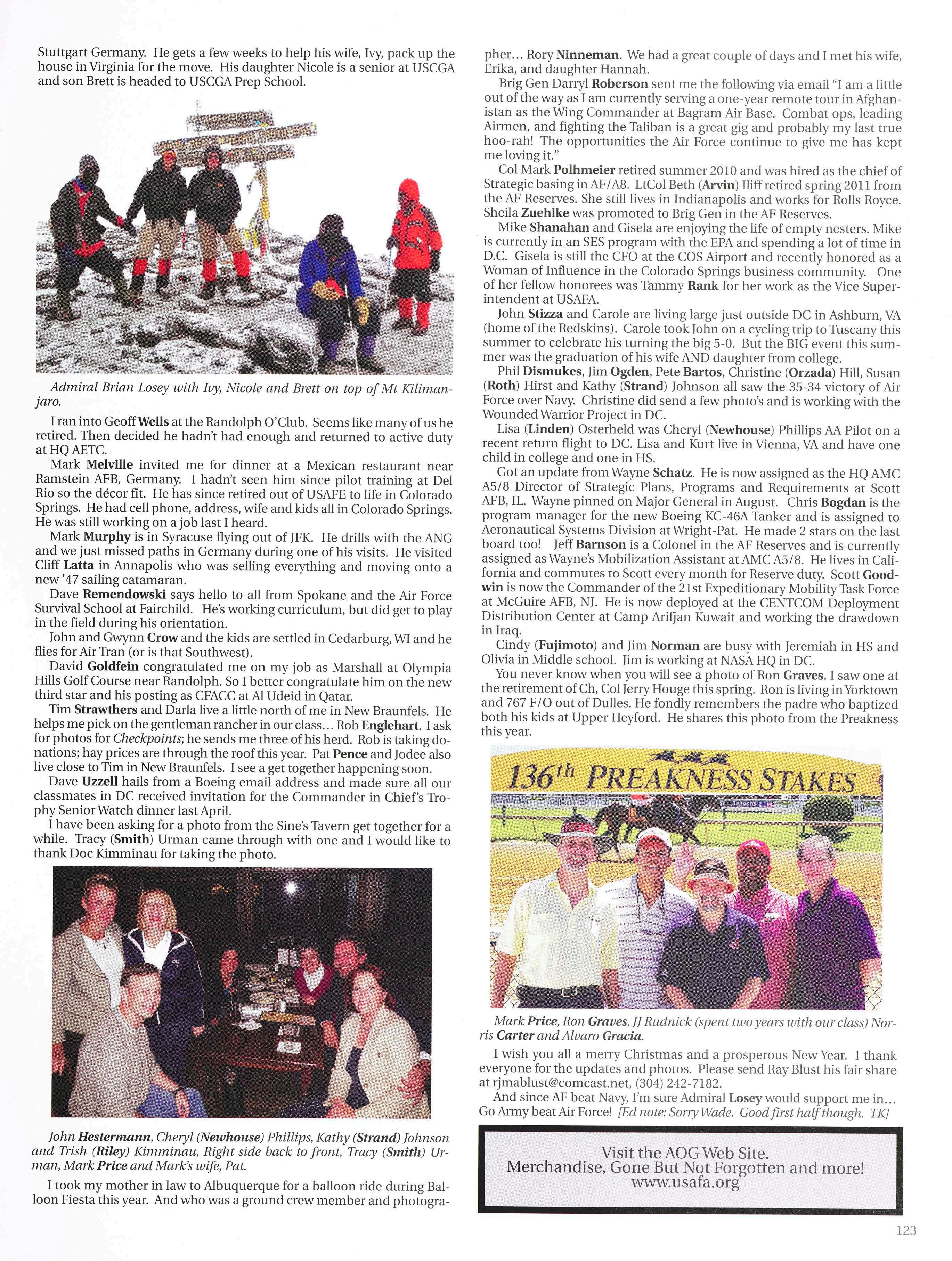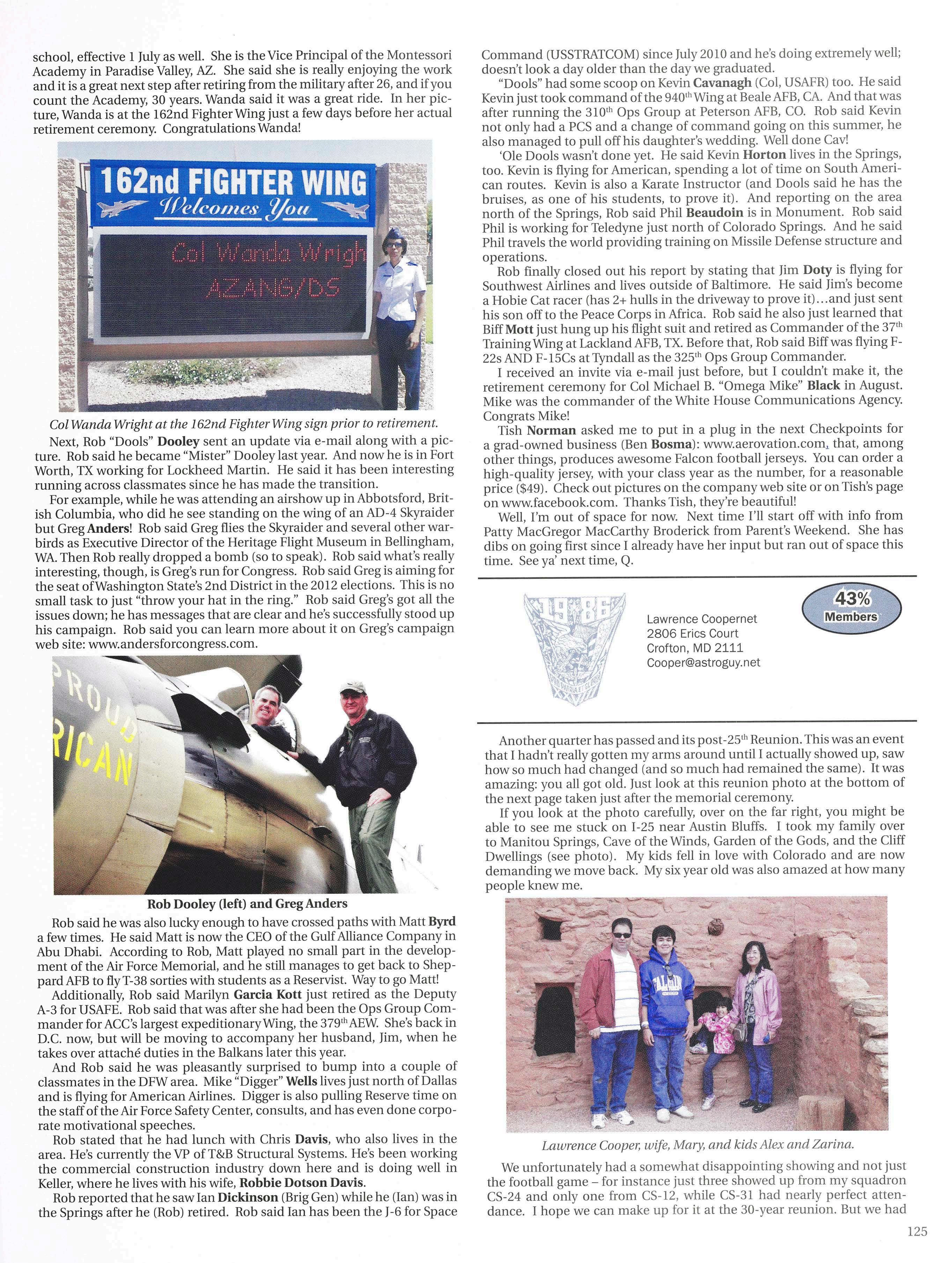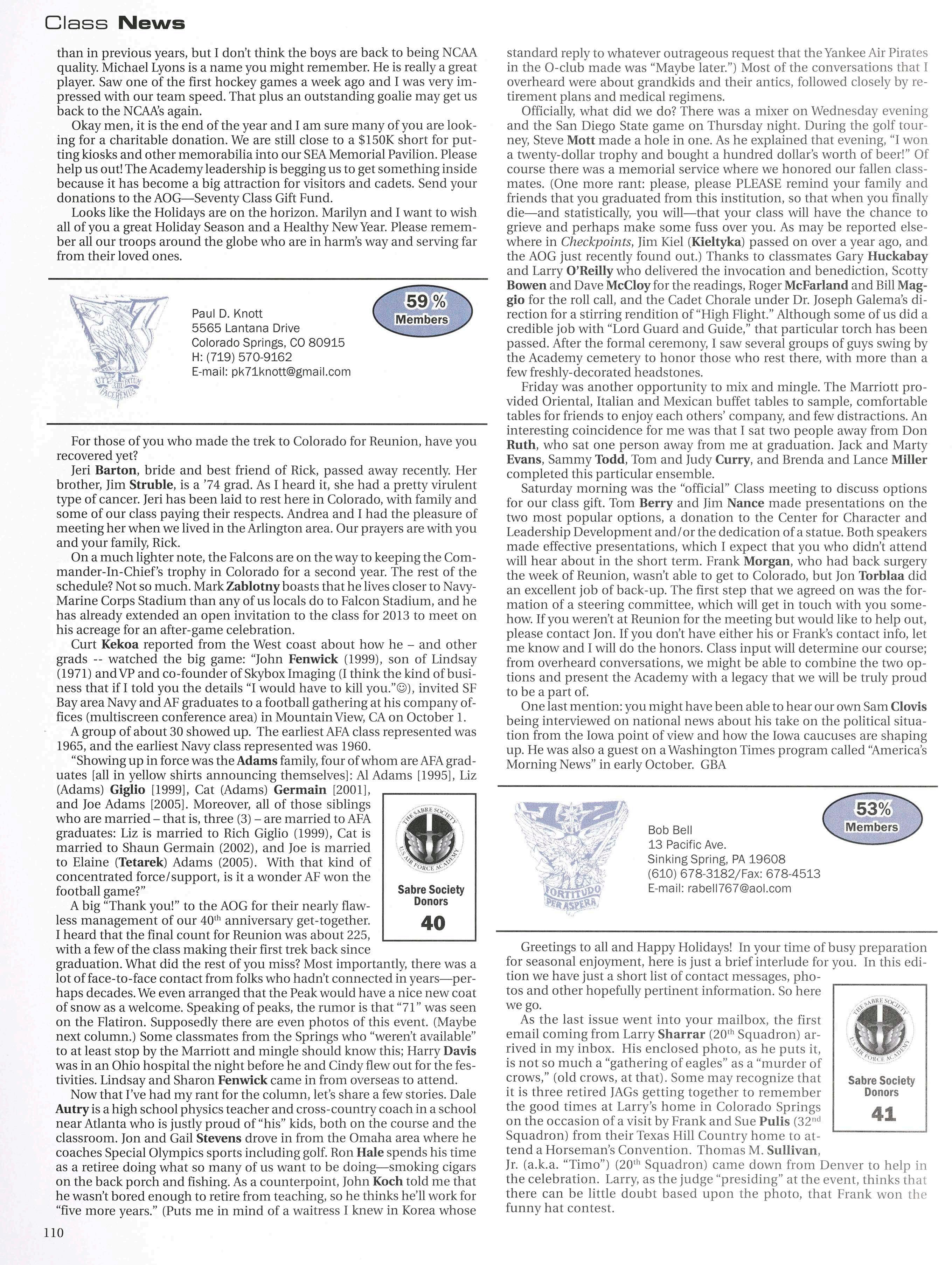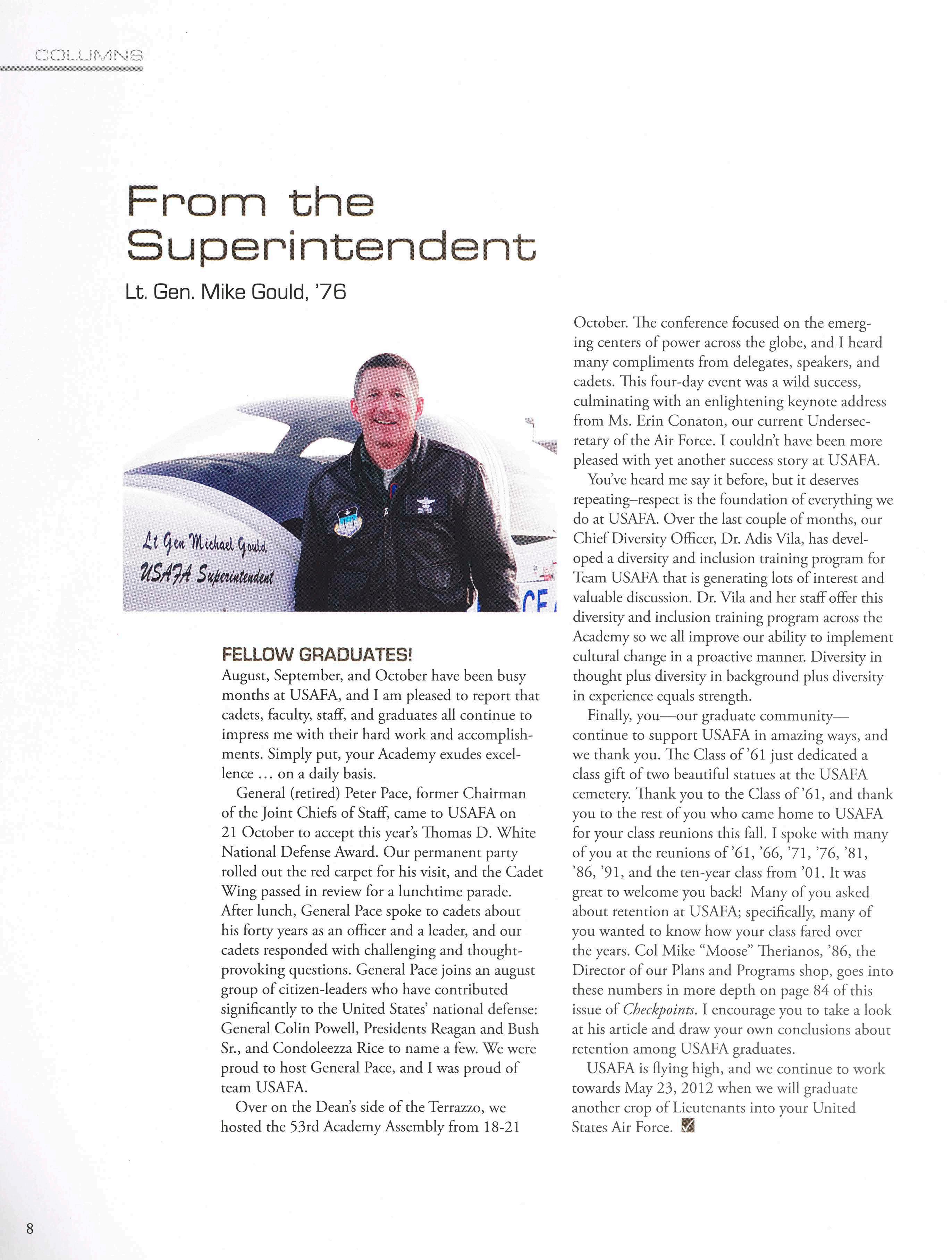 Finally, you—our graduate community— continue to support USAFA in amazing ways, and we thank you. The Class of’61 just dedicated a class gift of two beautiful statues at the USAFA cemetery. Thank you to the Class of’61, and thank you to the rest ofyou who came home to USAFA for your class reunions thisfall. 1 spoke with many ofyou at the reunions of’61, ’66, ’71, ’76,’81, ’86, ’91, and the ten-year class from 01. It was great to welcome you back! Many ofyou asked about retention at USAFA; specifically, many of you wanted to know how your class fared over the years. Col Mike “Moose” Therianos, ’86, the Director of our Plans and Programs shop, goes into these numbers in more depth on page 84 of this issue of Checkpoints. I encourage you to take a look at his article and draw your own conclusions about retention among USAFA graduates.