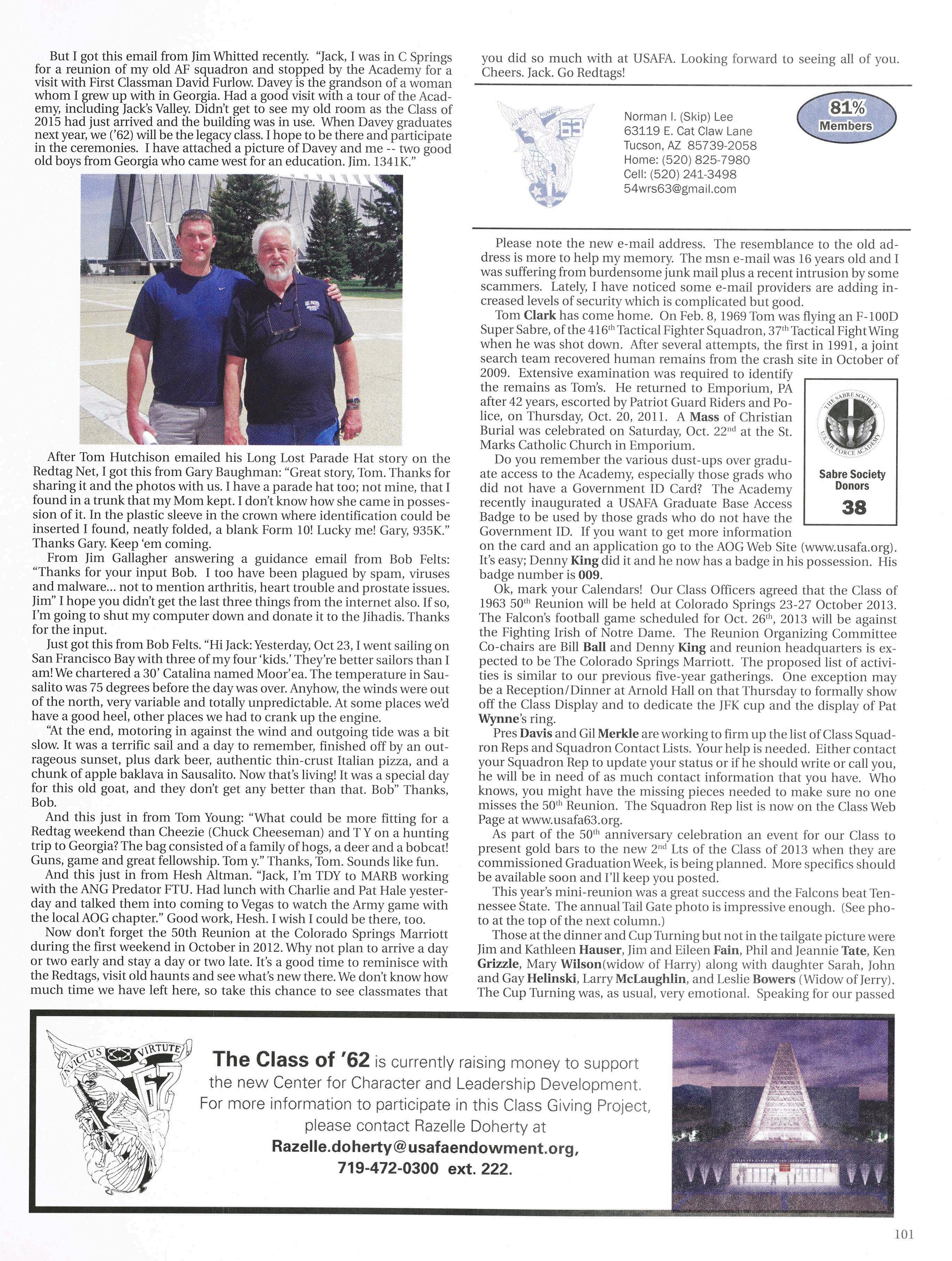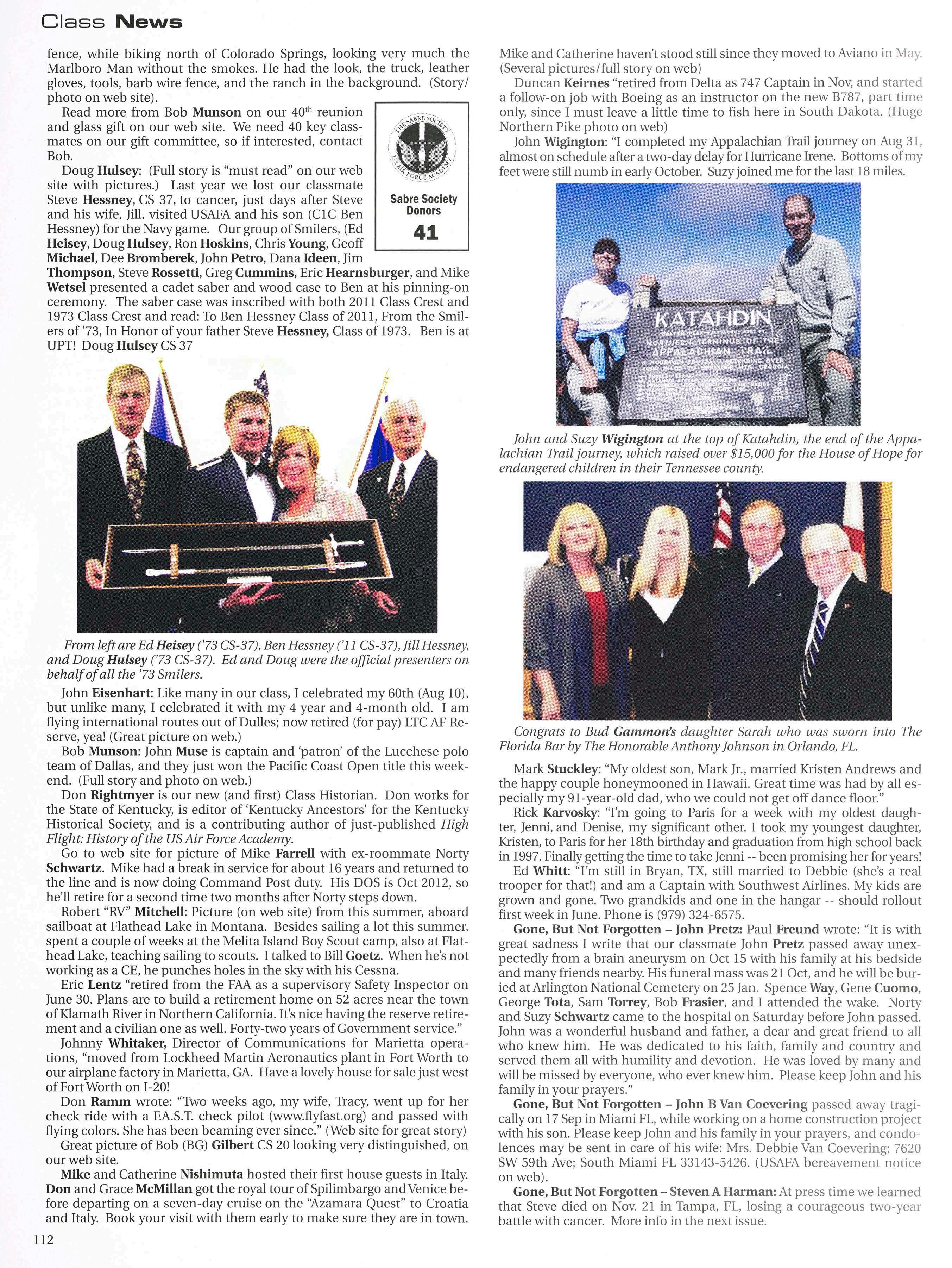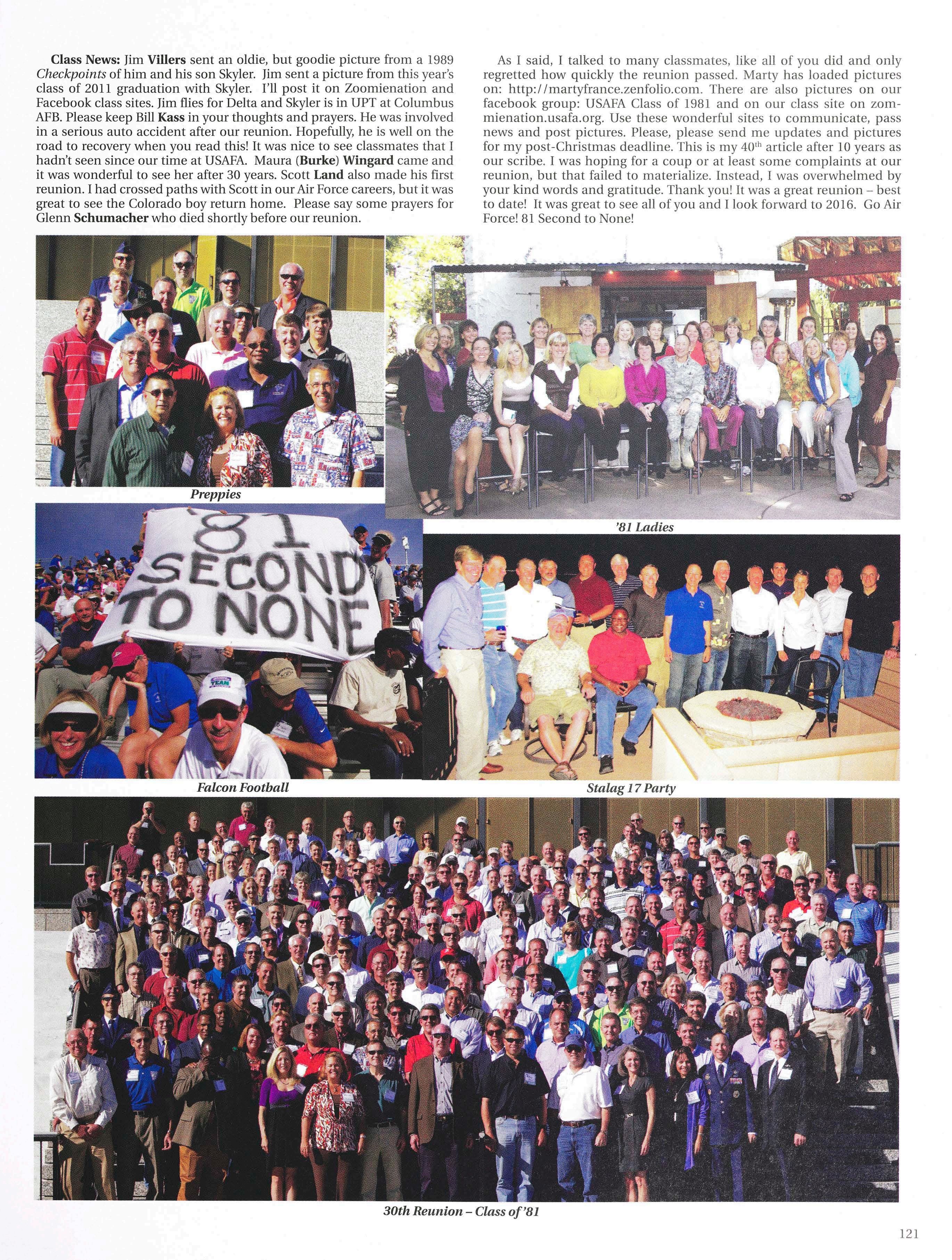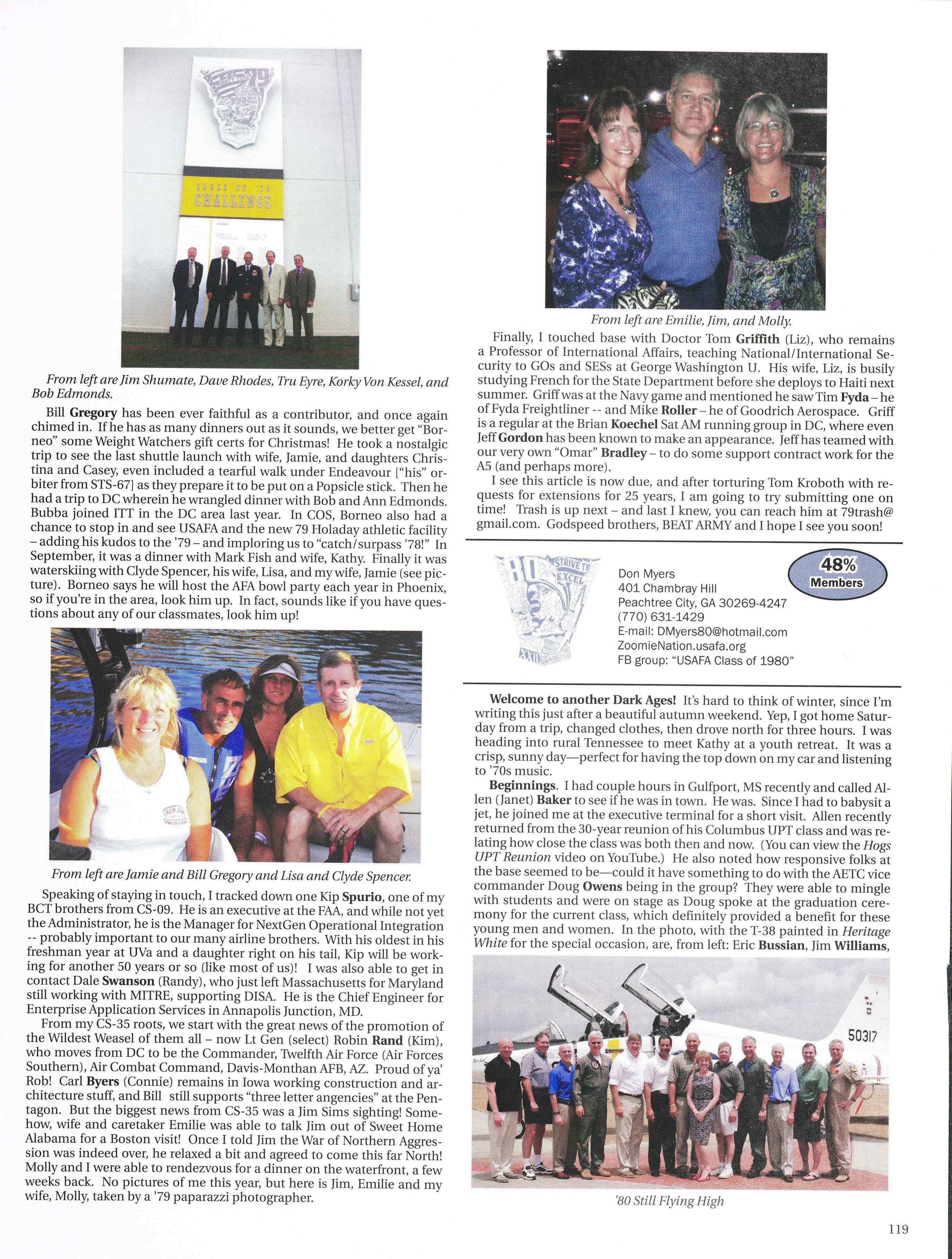 Finally, you—our graduate community— continue to support USAFA in amazing ways, and we thank you. The Class of’61 just dedicated a class gift of two beautiful statues at the USAFA cemetery. Thank you to the Class of’61, and thank you to the rest ofyou who came home to USAFA for your class reunions thisfall. 1 spoke with many ofyou at the reunions of’61, ’66, ’71, ’76,’81, ’86, ’91, and the ten-year class from 01. It was great to welcome you back! Many ofyou asked about retention at USAFA; specifically, many of you wanted to know how your class fared over the years. Col Mike “Moose” Therianos, ’86, the Director of our Plans and Programs shop, goes into these numbers in more depth on page 84 of this issue of Checkpoints. I encourage you to take a look at his article and draw your own conclusions about retention among USAFA graduates.