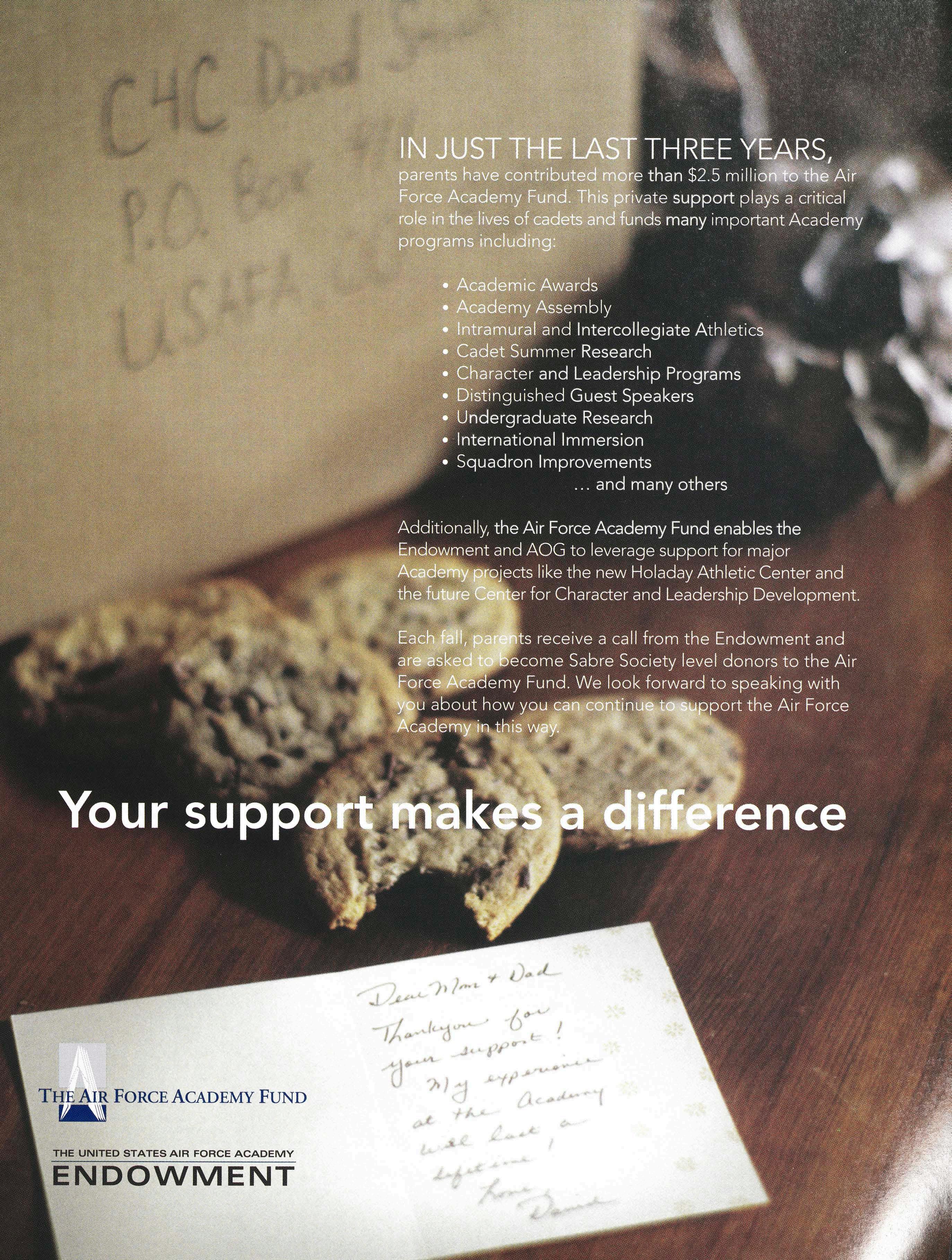 emy are enduring. The continued collaboration of the AOG and the Endowment in striving for our mutual goals of graduate and USAFA support, friendraising and fundraising, should further encourage our contributors, both graduates and others, to increase the financial support that is necessary to assist the Academy with funding that the federal government cannot provide and enhance The Long Blue Line that we all envision. The members of the Joint Coordinating Committee, as established in our MOU, have professionally performed in an outstanding manner and in the best interests of everyone in the USAFA community; we owe them our heartfelt gratitude.