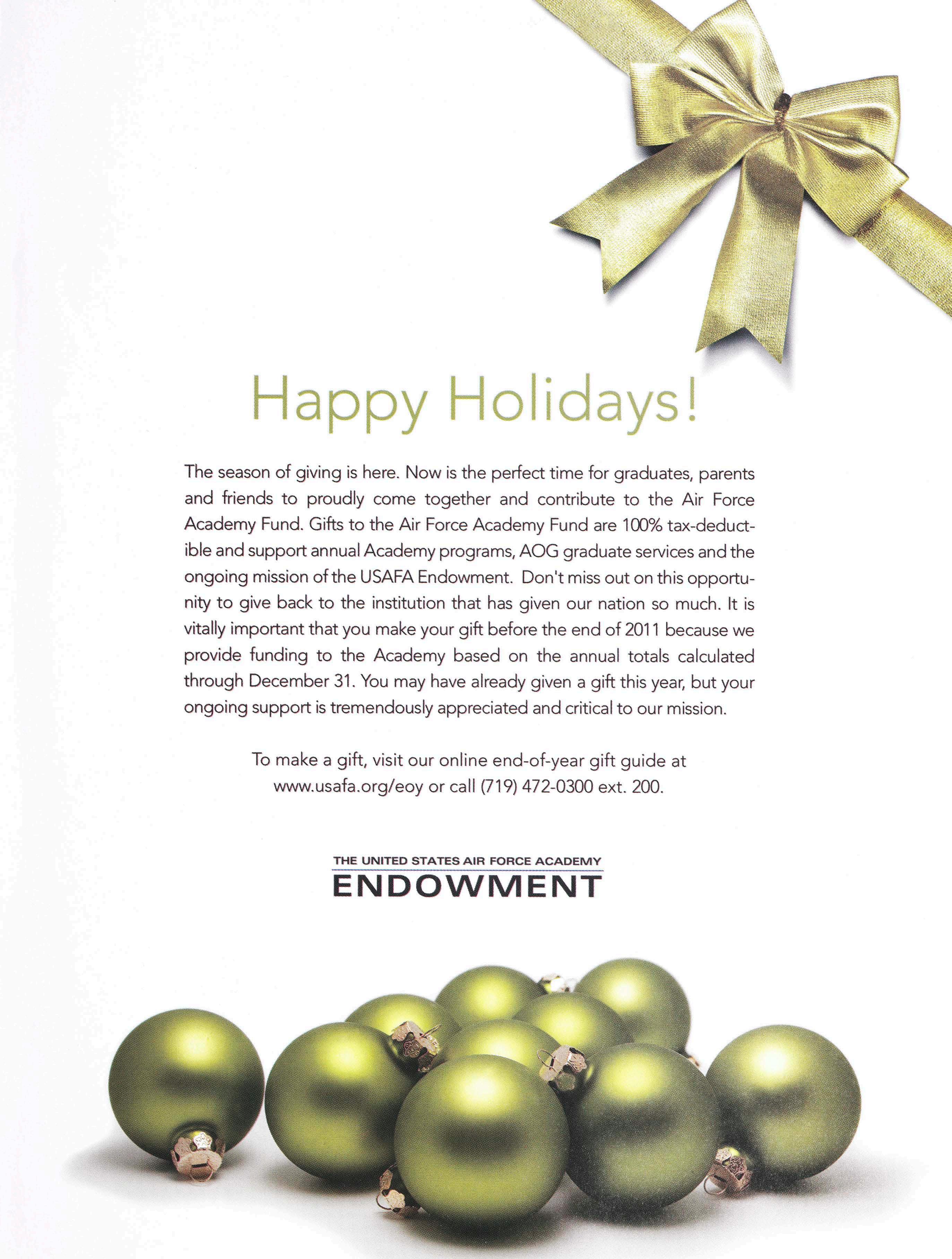 he holiday season is upon us and, with it, the hustle and bustle ofdecorating, shopping, traveling and, in my case, eating too much. Winter has arrived in Colorado and has brought its spectacular snow capped mountains and crystal clear blue skies. The Cadet Area sits majestically in view from Doolittle Hall and encourages reflection on the days when we walked the halls of our dorms and spent endless hours in Fairchild.