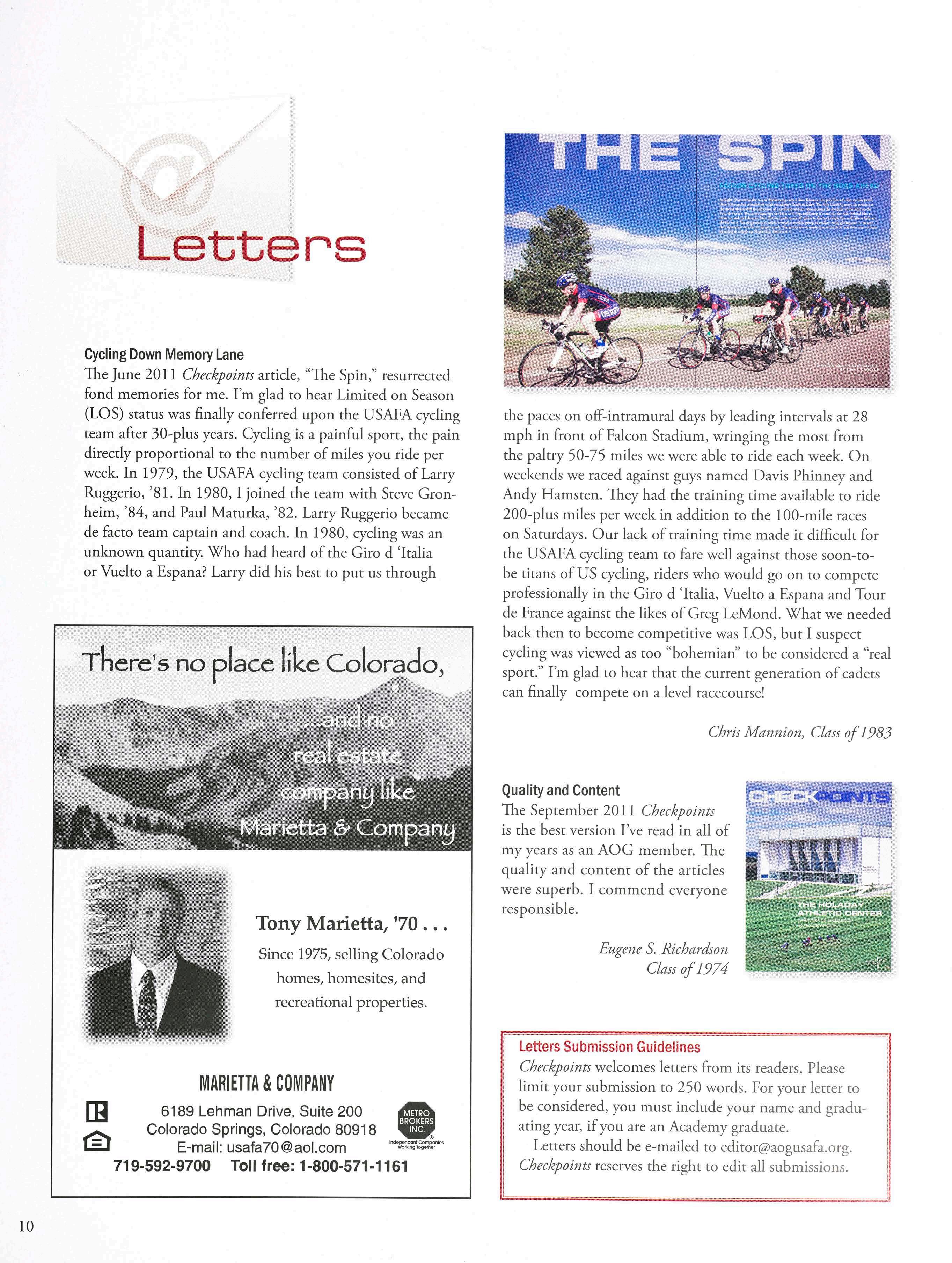 The June 2011 Checkpoints article, “The Spin,” resurrected fond memories for me. I’m glad to hear Limited on Season (LOS) status was finally conferred upon the USAFA cycling team after 30-plus years. Cycling is a painful sport, the pain directly proportional to the number of miles you ride per week. In 1979, the USAFA cycling team consisted of Larry Ruggerio, ’81. In 1980, I joined the team with Steve Gronheim, ’84, and Paul Maturka, ’82. Larry Ruggerio became de facto team captain and coach. In 1980, cycling was an unknown quantity. Who had heard of the Giro d ‘Italia or Vuelto a Espana? Larry did his best to put us through