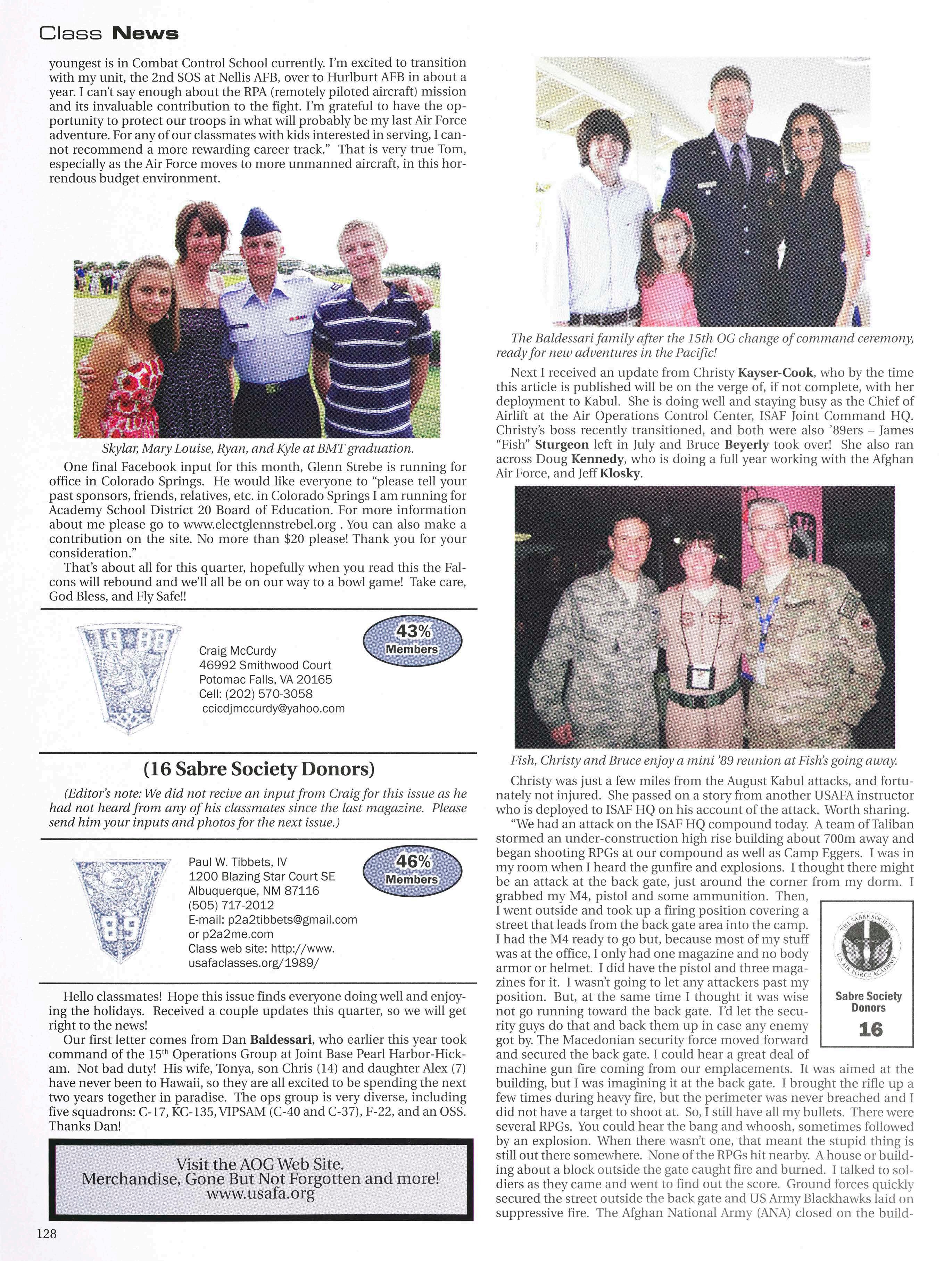Classmates! We sunk Navy again and hopefully, by the time you are reading this, we have beaten Army and the Commander-in-Chief’s trophy remains where it belongs in Colorado. Our classmates are returning from deployments, PCSing, getting new assignments, and making some incredible contributions! We have proud parents, happy spouses, and our family continues to grow every day. Continue doing all of the incredible work you’ve been doing; it’s amazing to watch as our class matures into the future leaders of our Air Force, industries, and various other capacities. Keep sending updates on where you are, what you’re doing, and I’ll continue to post!