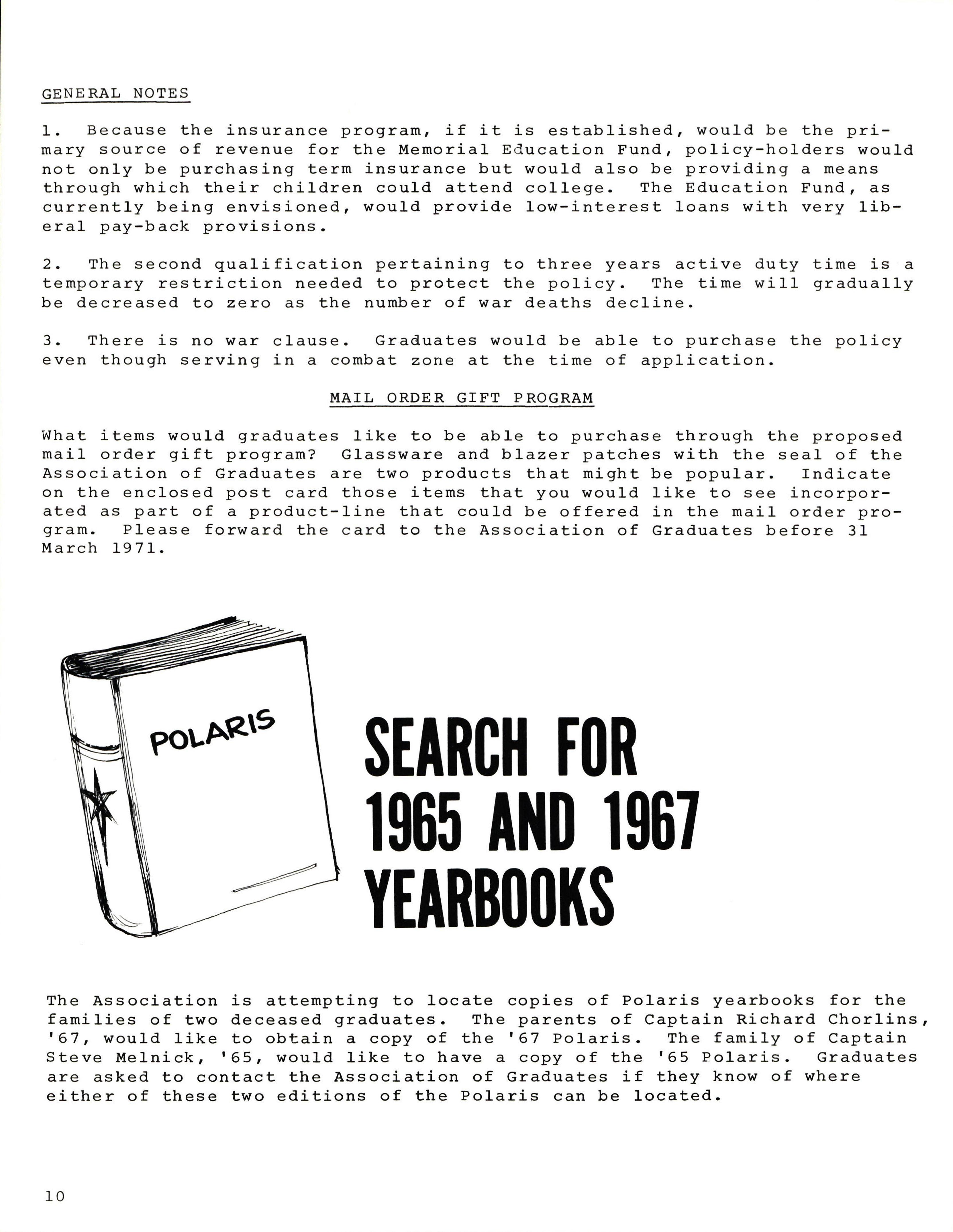 The Association is attempting to locate copies of Polaris yearbooks for the families of two deceased graduates. The parents of Captain Richard Chorlins, '67, would like to obtain a copy of the '67 Polaris. The family of Captain Steve Melnick, '65, would like to have a copy of the '65 Polaris. Graduates are asked to contact the Association of Graduates if they know of where either of these two editions of the Polaris can be located.