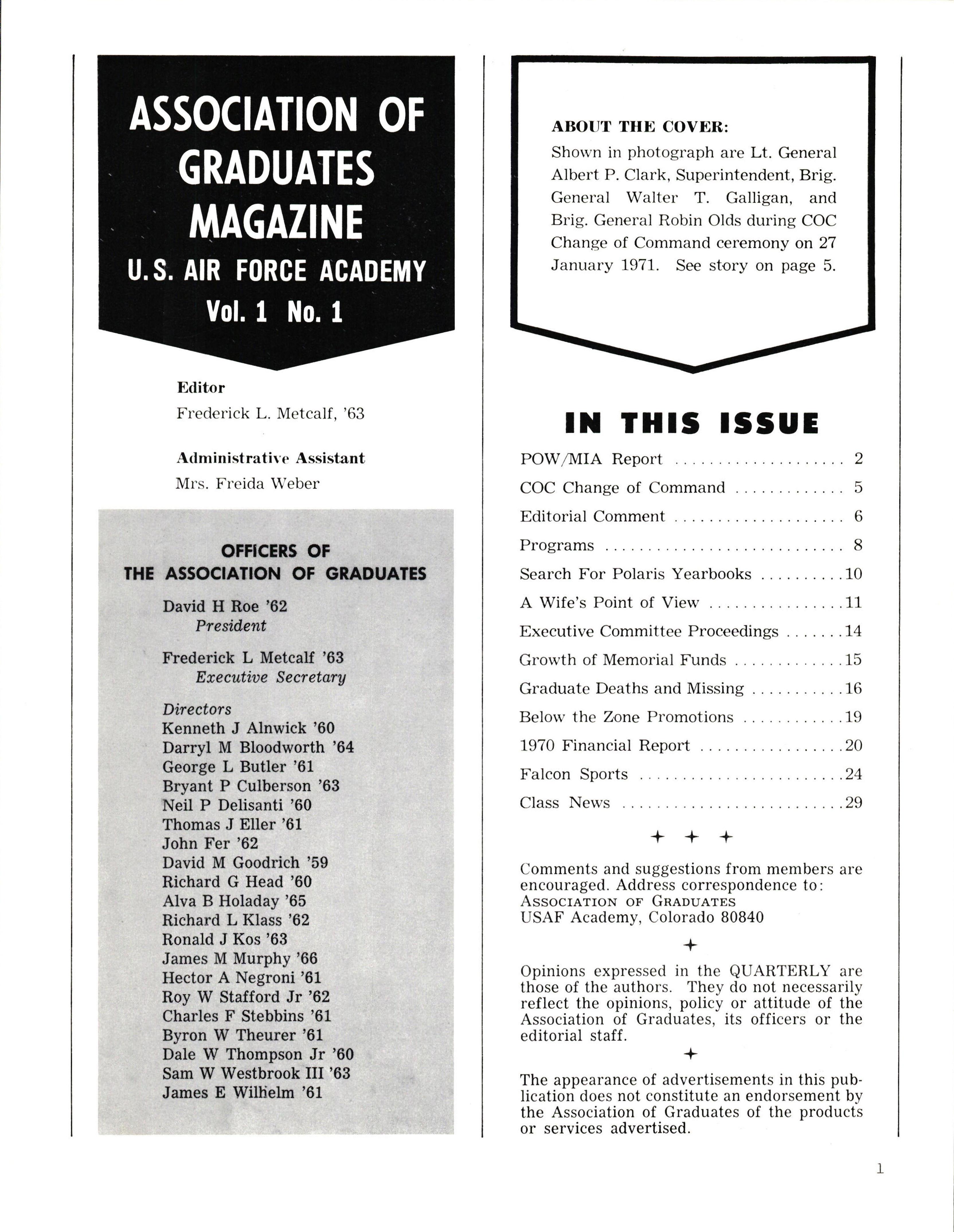 Comments and suggestions from members are encouraged. Address correspondence to: Association of Graduates USAF Academy, Colorado 80840 4
