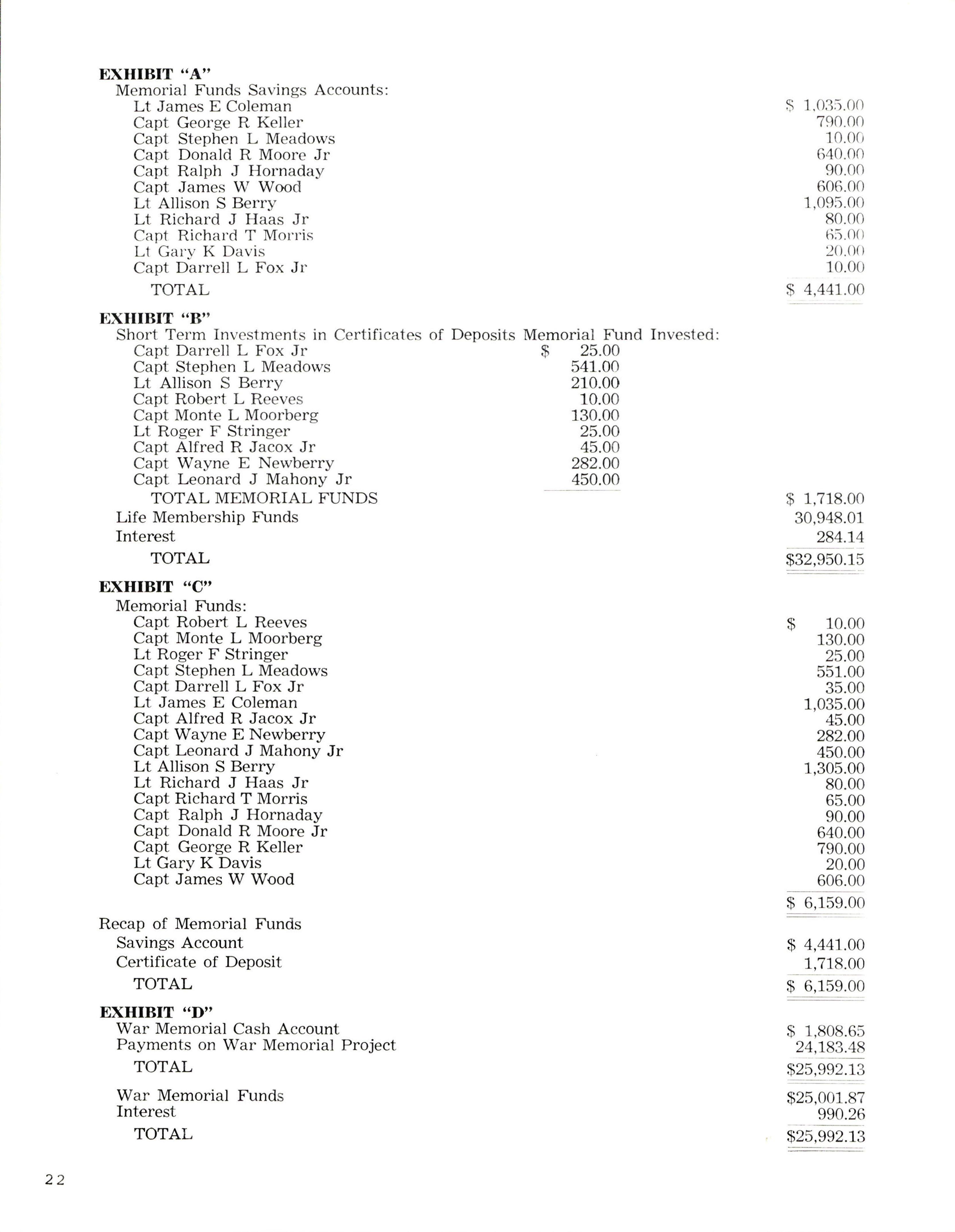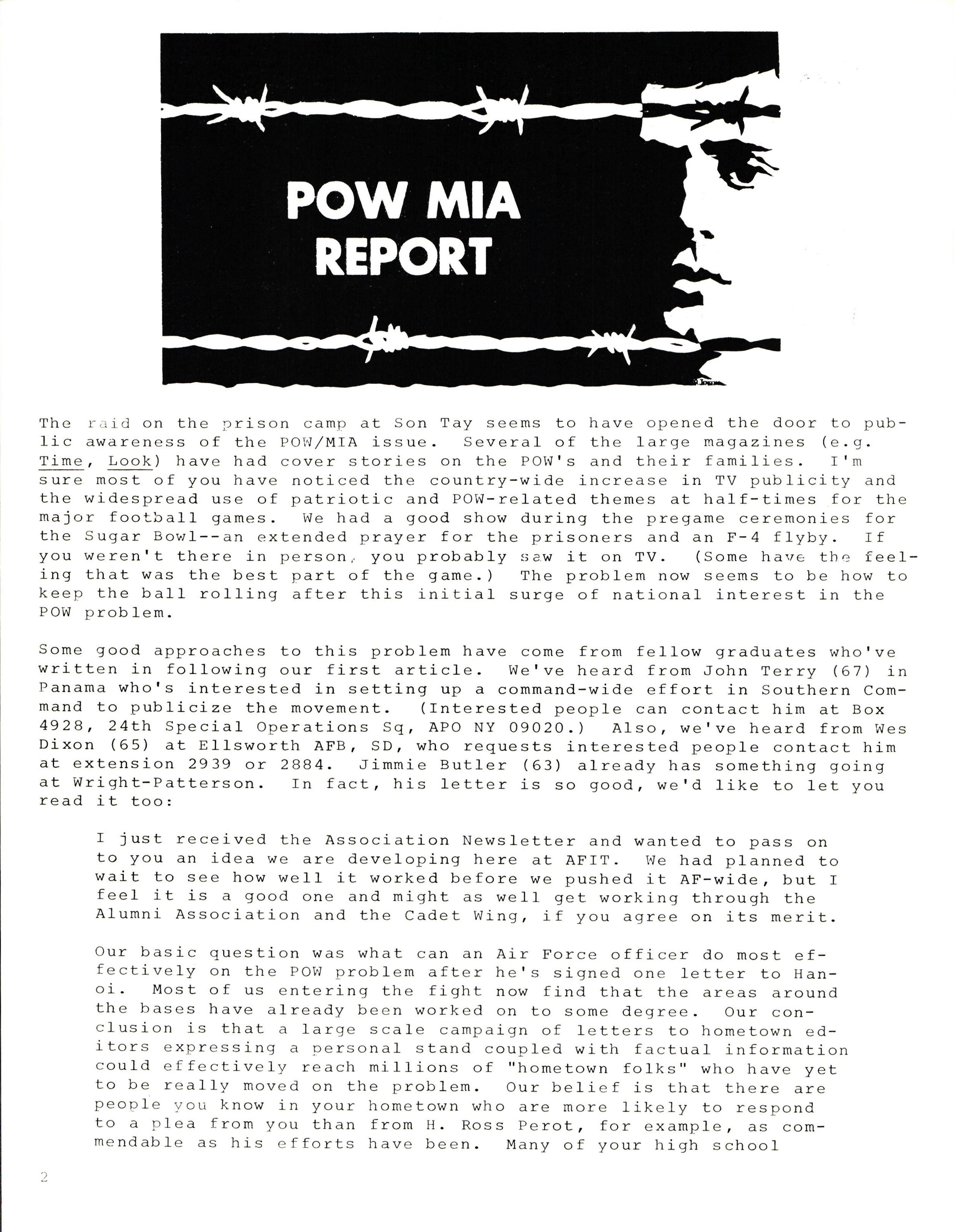 We are beginning our efforts to directly support these families by writing to each of the wives of POW MIA graduates and asking if they would like to be associated with an active group in their area. We are sending similar letters to the parents of these graduates. When they reply, we'll pass their names on to groups in the areas where they exist, and where they don't, we'll try to let graduates in the area know about it so maybe they can start something.