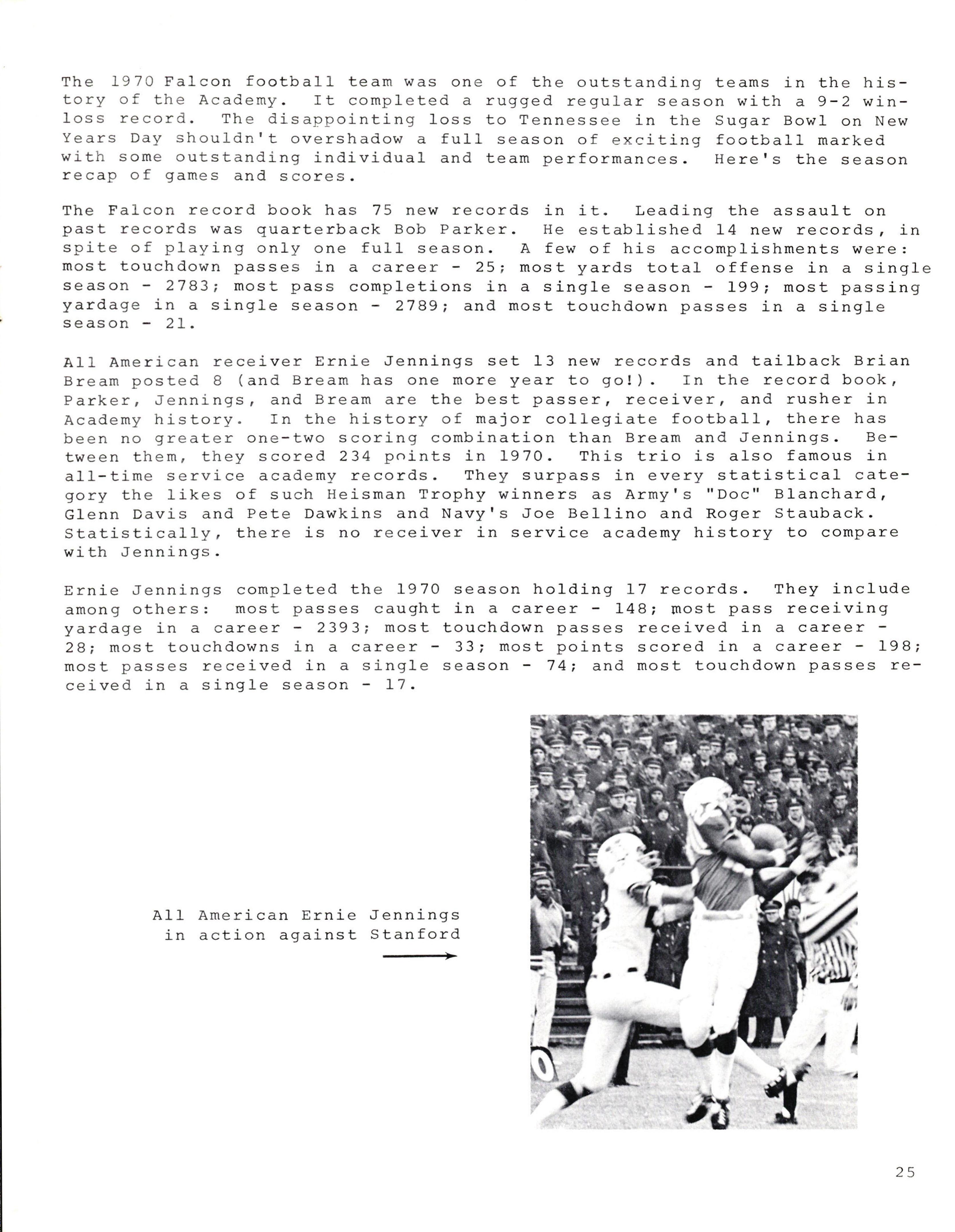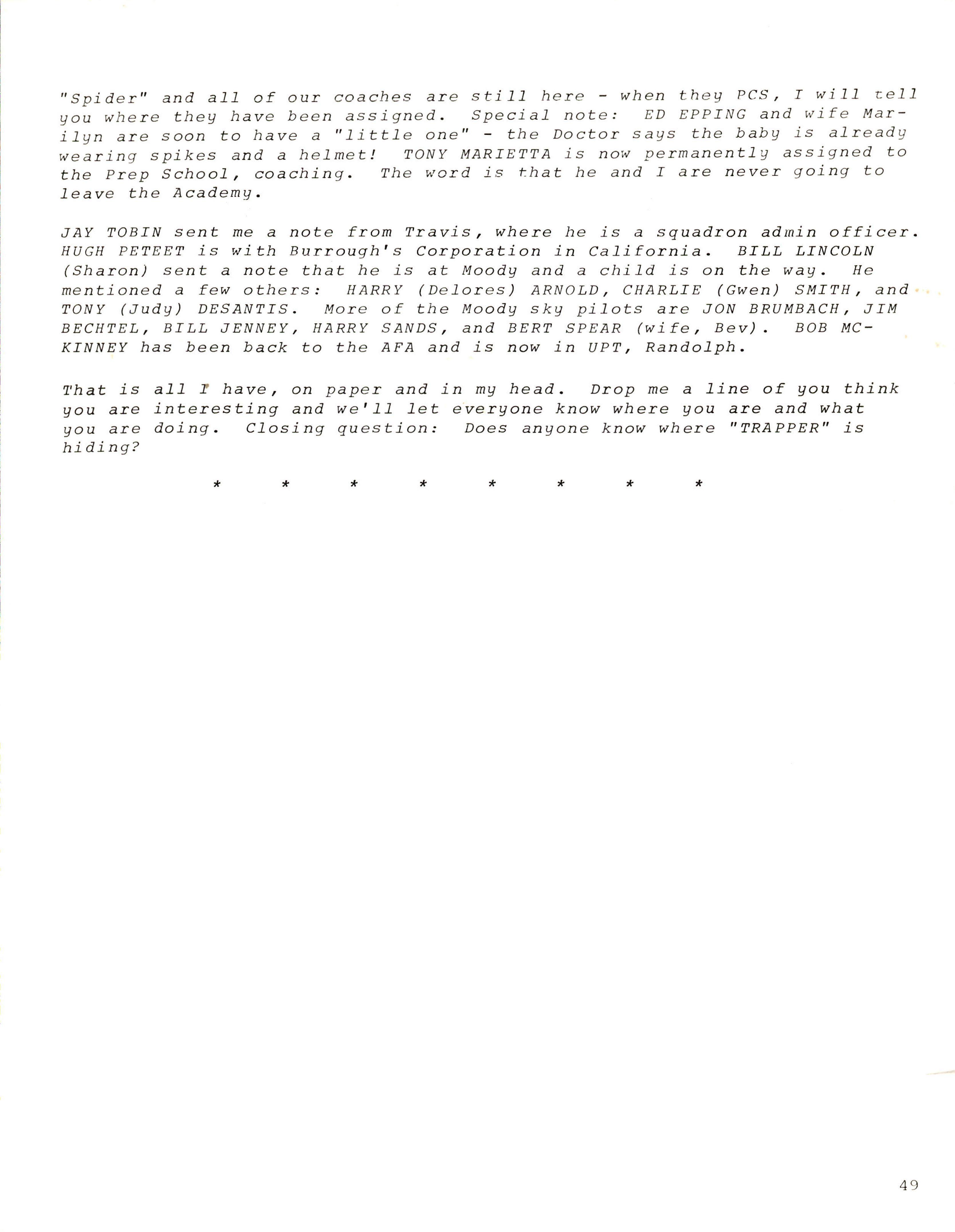 "Spider" and all of our coaches are still here - when they PCS, I will tell you where they have been assigned. Special note: ED EPPING and wife Marilyn are soon to have a "little one" - the Doctor says the baby is already wearing spikes and a helmet! TONY MARIETTA is now permanently assigned to the Prep School, coaching. The word is that he and I are never going to leave the Academy.