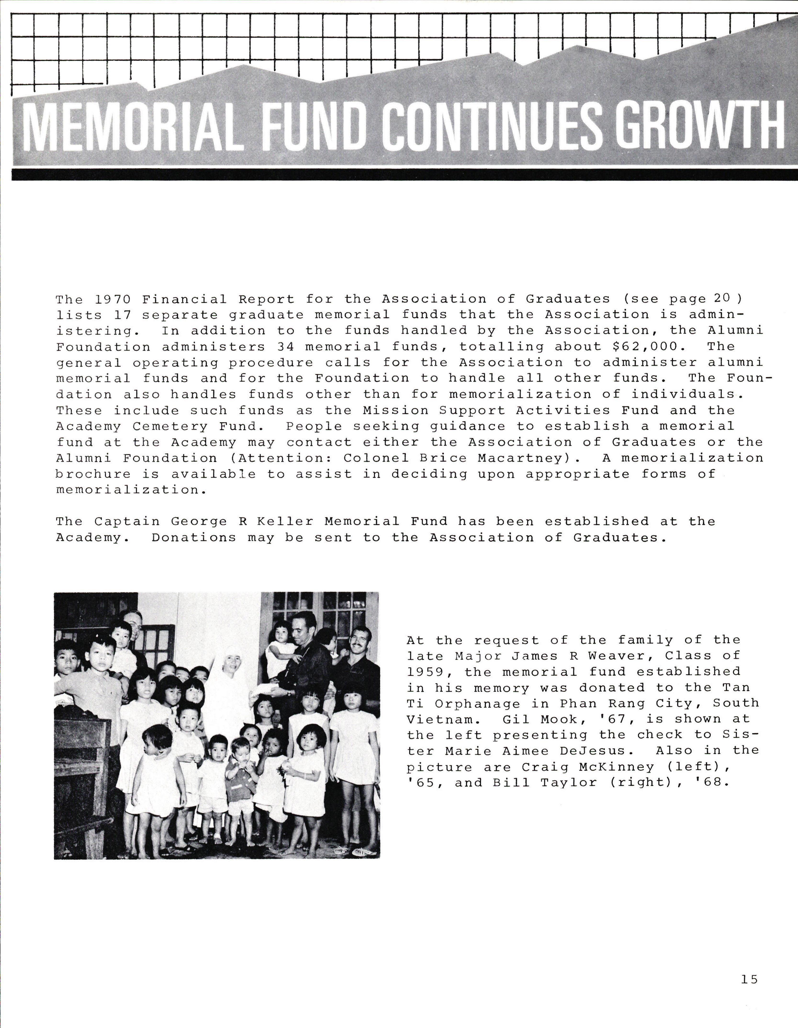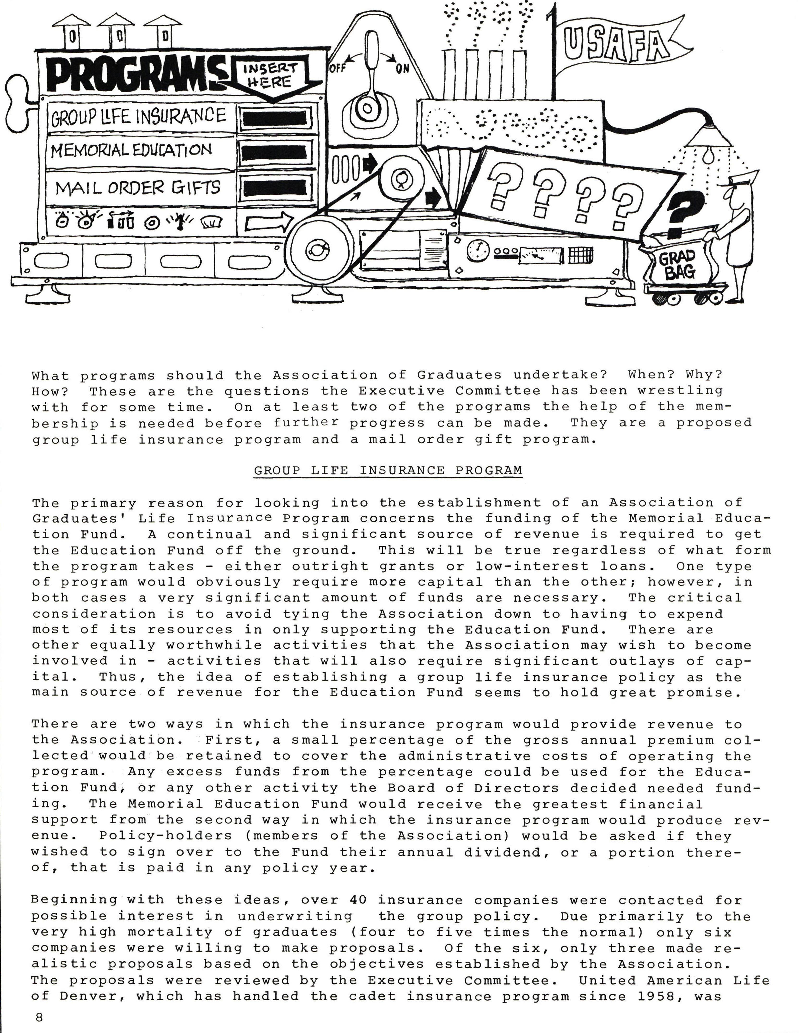 The primary reason for looking into the establishment of an Association of Graduates' Life Insurance Program concerns the funding of the Memorial Education Fund. A continual and significant source of revenue is required to get the Education Fund off the ground. This will be true regardless of what form the program takes - either outright grants or low-interest loans. One type of program would obviously require more capital than the other; however, in both cases a very significant amount of funds are necessary. The critical consideration is to avoid tying the Association down to having to expend most of its resources in only supporting the Education Fund. There are other equally worthwhile activities that the Association may wish to become involved in - activities that will also require significant outlays of capital. Thus, the idea of establishing a group life insurance policy as the main source of revenue for the Education Fund seems to hold great promise.