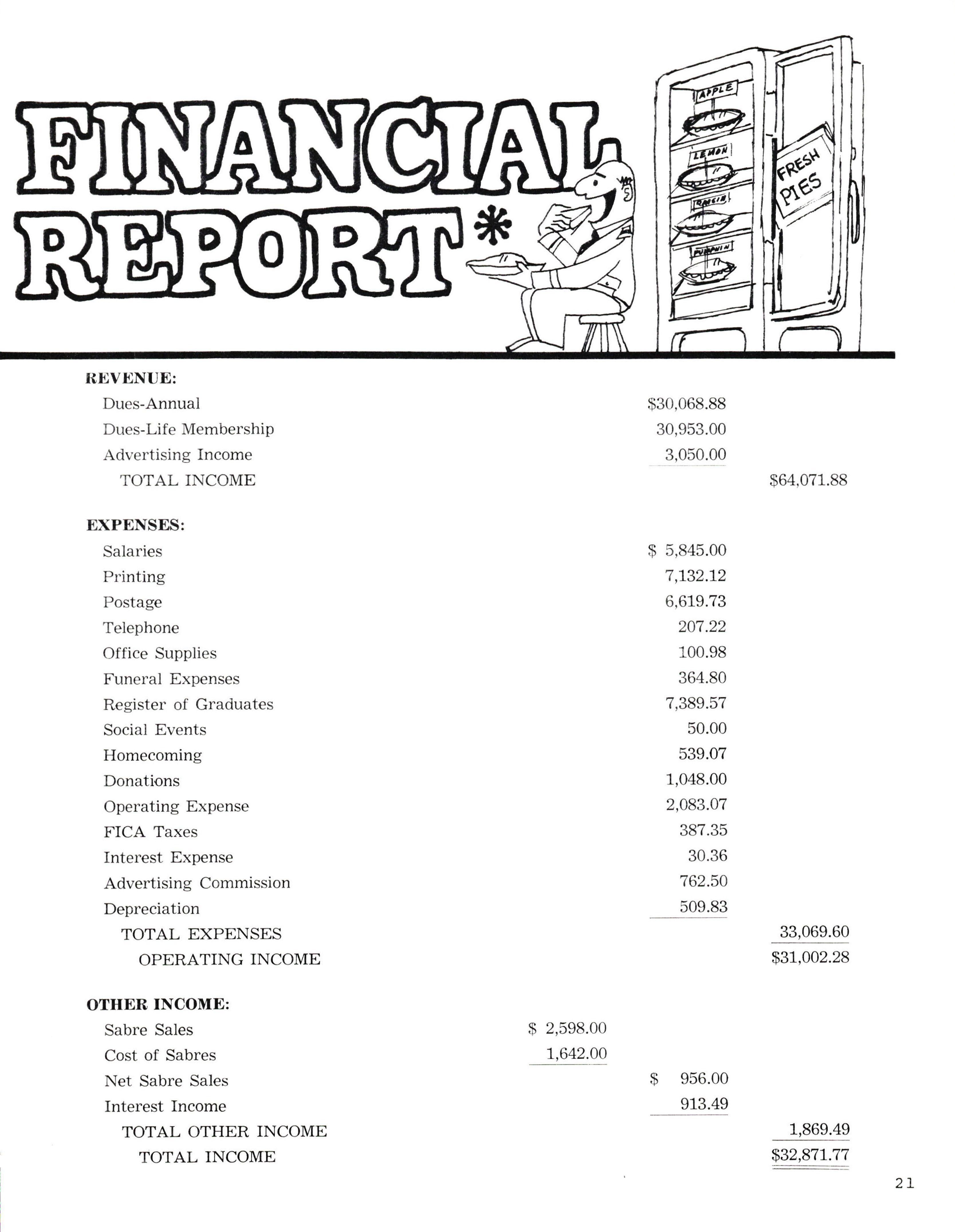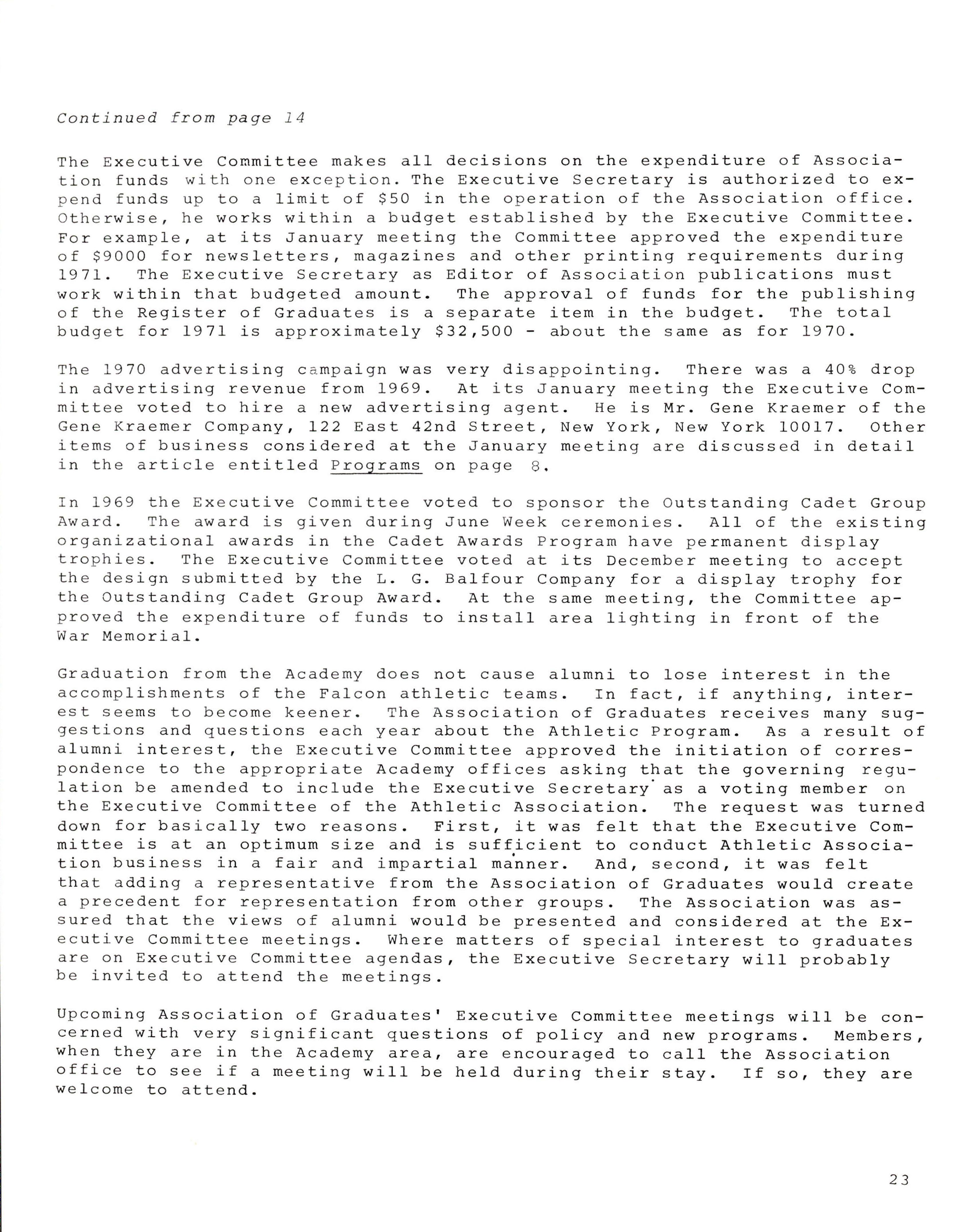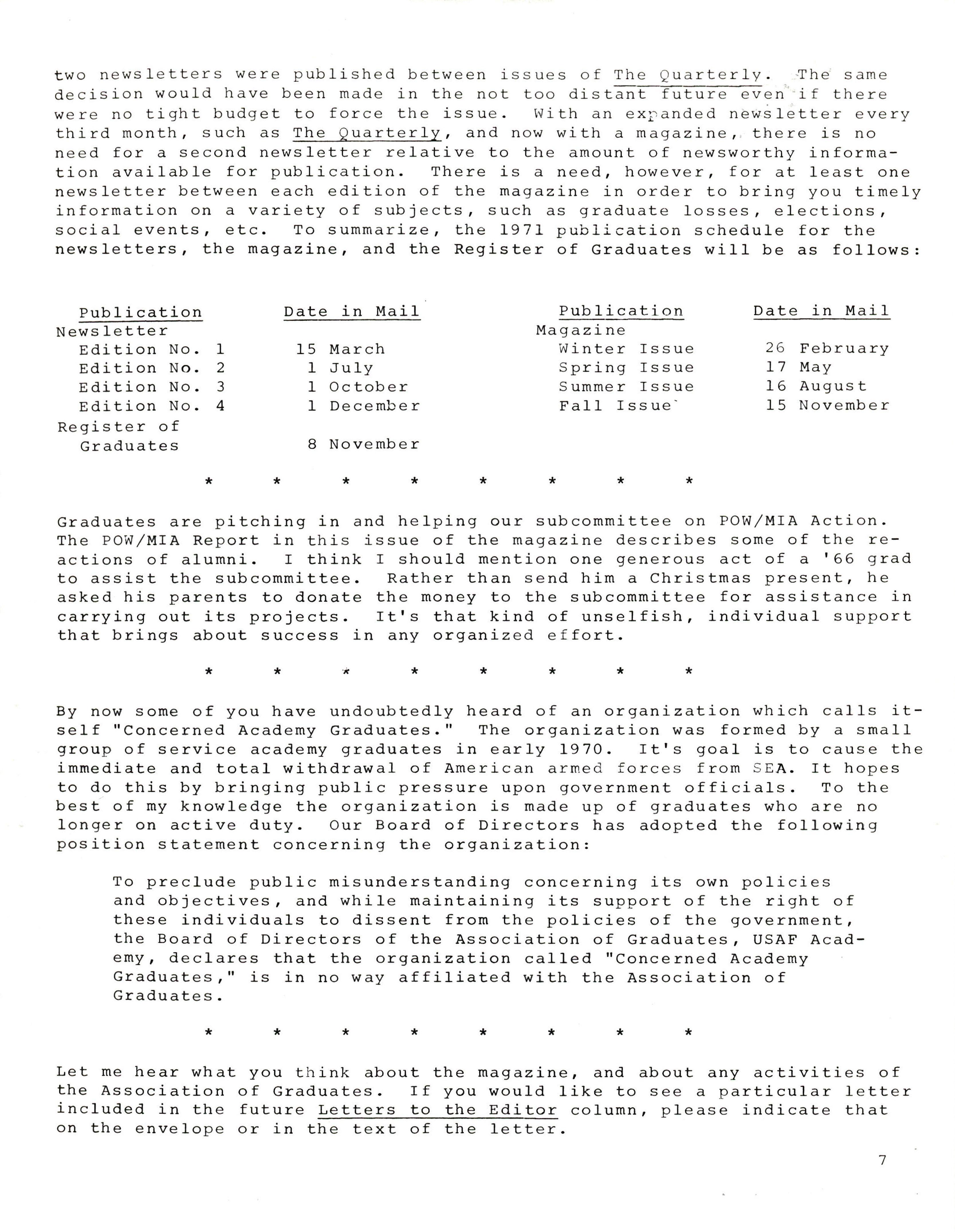 two newsletters were published between issues of The Quarterly. The same decision would have been made in the not too distant future even if there were no tight budget to force the issue. With an expanded newsletter every third month, such as The Quarterly and now with a magazine, there is no need for a second newsletter relative to the amount of newsworthy information available for publication. There is a need, however, for at least one newsletter between each edition of the magazine in order to bring you timely information on a variety of subjects, such as graduate losses, elections, social events, etc. To summarize, the 1971 publication schedule for the newsletters, the magazine, and the Register of Graduates will be as follows: