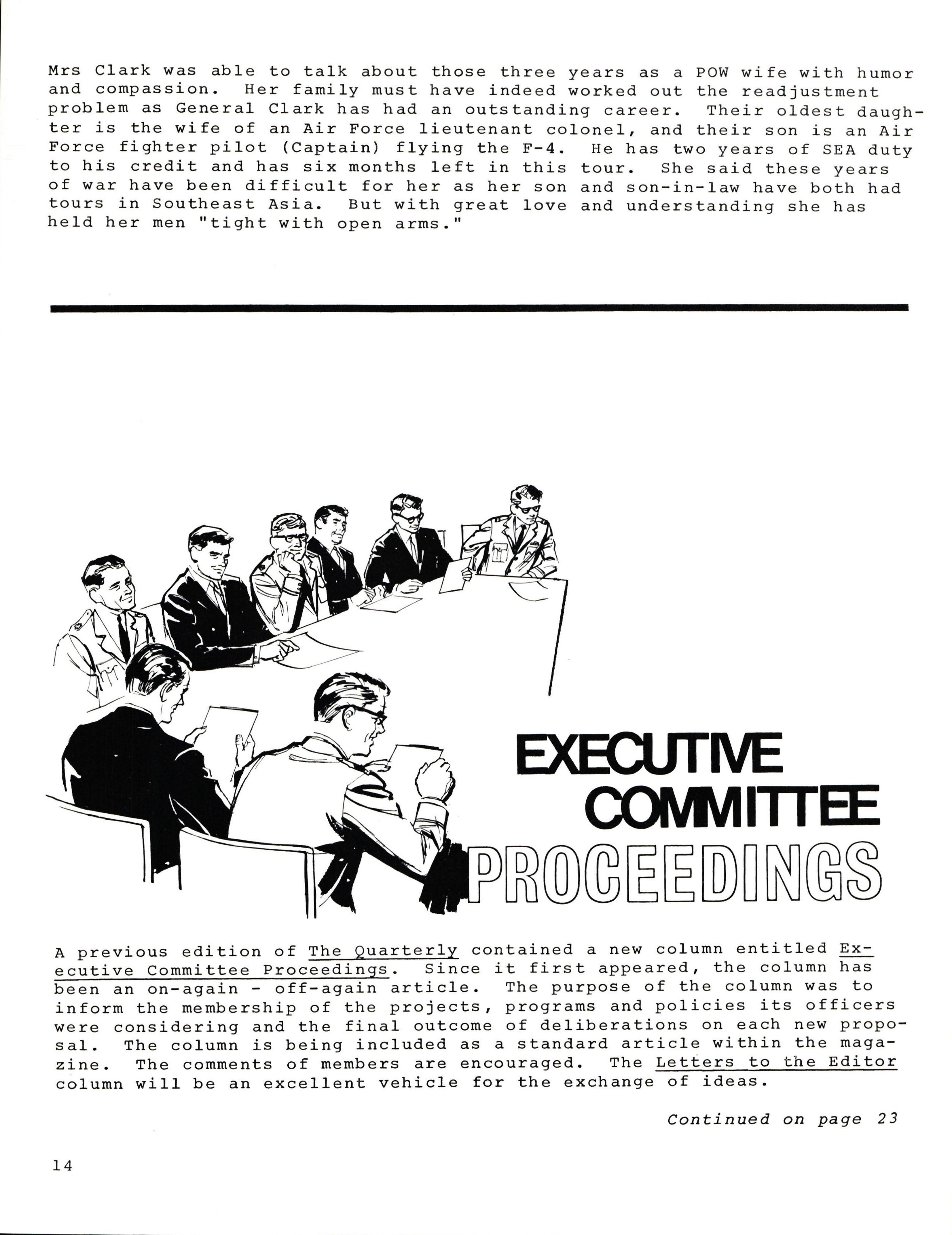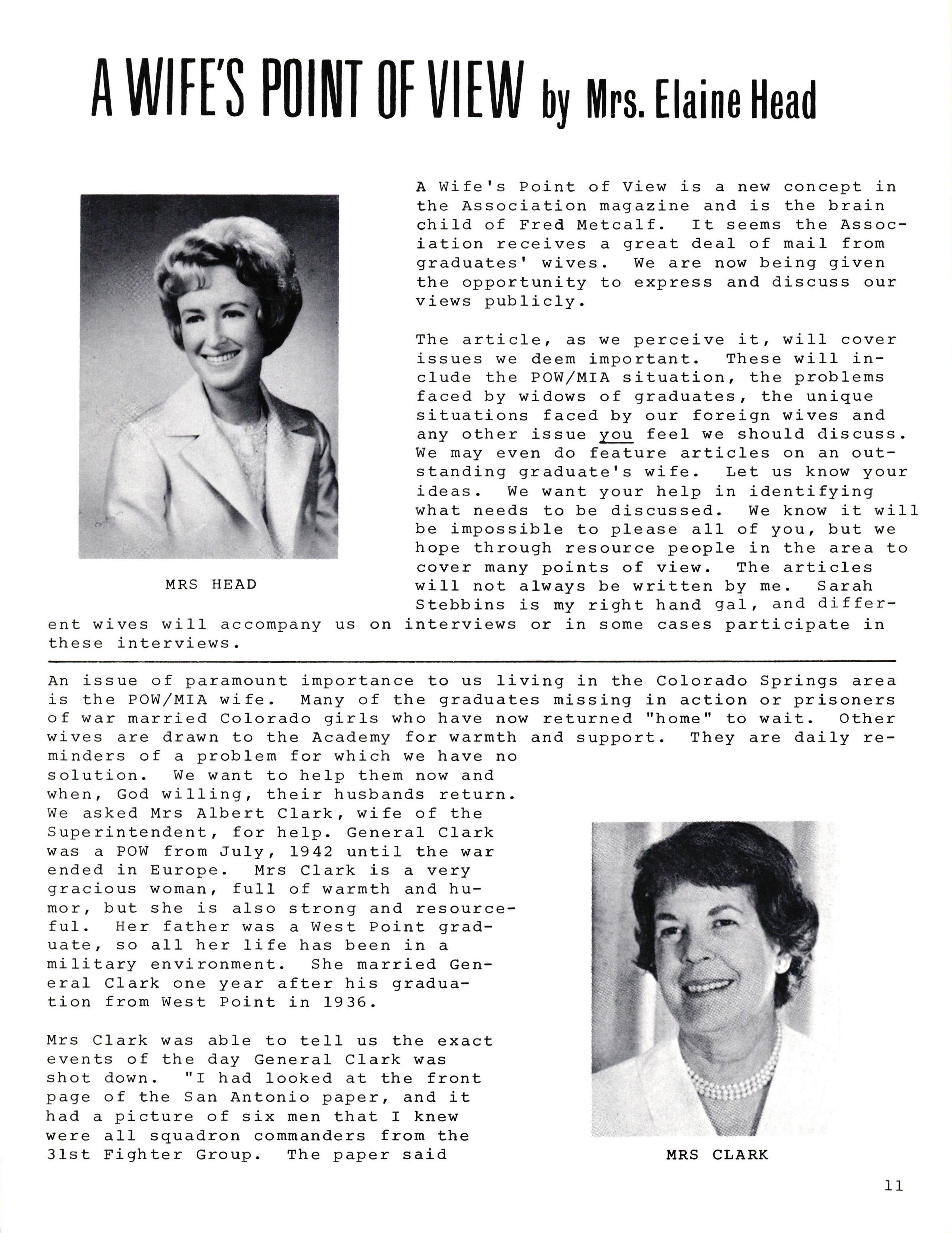 Besides developing public interest and public support for actions to get our buddies back, we feel that an equally important task is to support the families of the prisoners and missing men during their absence. Some of their problems are highlighted in the "Wives Point of View" column which makes its debut with this issue. Mrs. Clark, wife of the Academy's Superintendent and once a POW wife herself, discusses some of her thoughts and experiences with these problems.