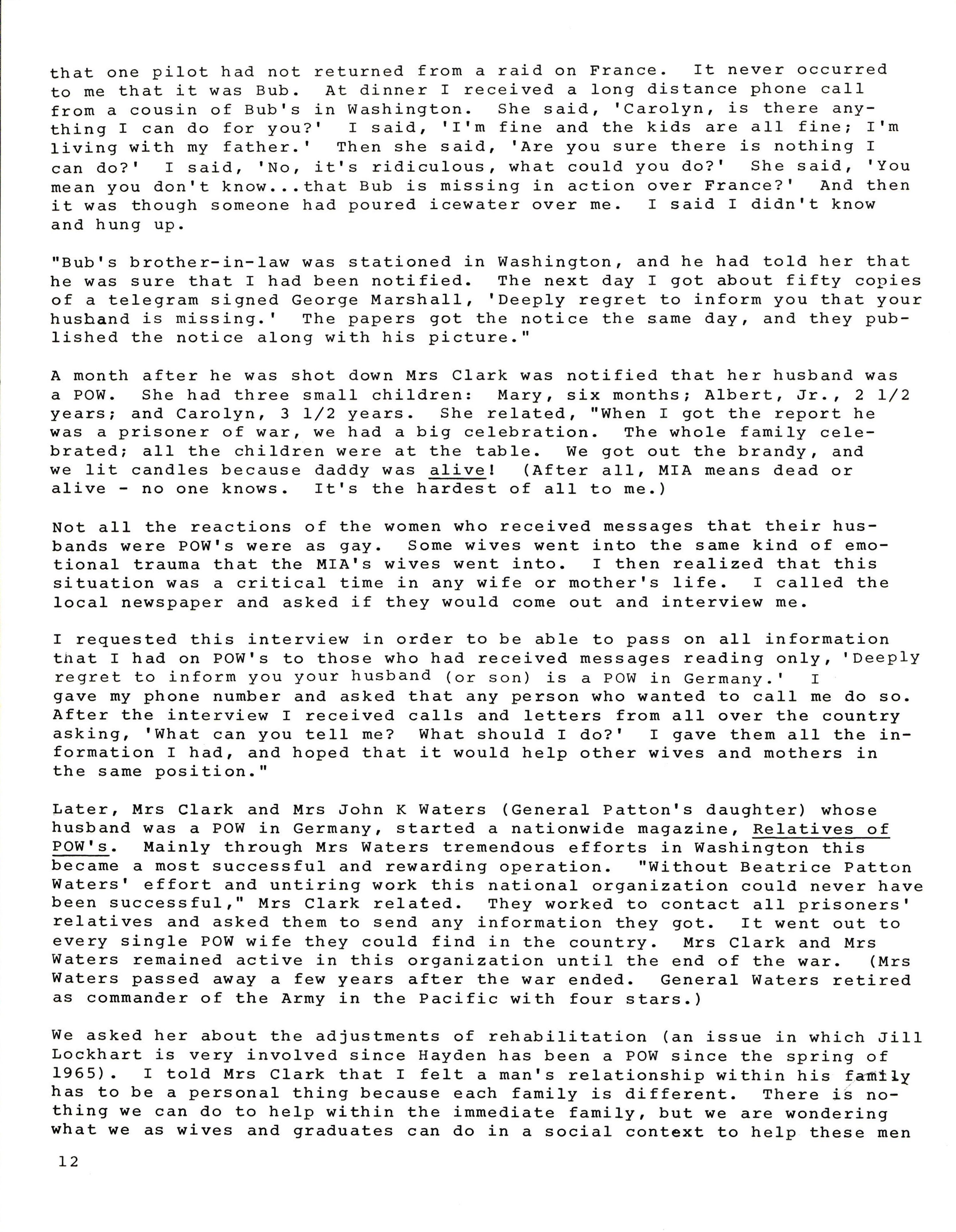 An issue of paramount importance to us living in the Colorado Springs area is the POW/MIA wife. Many of the graduates missing in action or prisoners of war married Colorado girls who have now returned "home" to wait. Other wives are drawn to the Academy for warmth and support. They are daily reminders of a problem for which we have no solution. We want to help them now and when, God willing, their husbands return. We asked Mrs Albert Clark, wife of the Superintendent, for help. General Clark was a POW from July, 1942 until the war ended in Europe. Mrs Clark is a very gracious woman, full of warmth and humor, but she is also strong and resourceful. Her father was a West Point graduate, so all her life has been in a military environment. She married General Clark one year after his graduation from West Point in 1936.