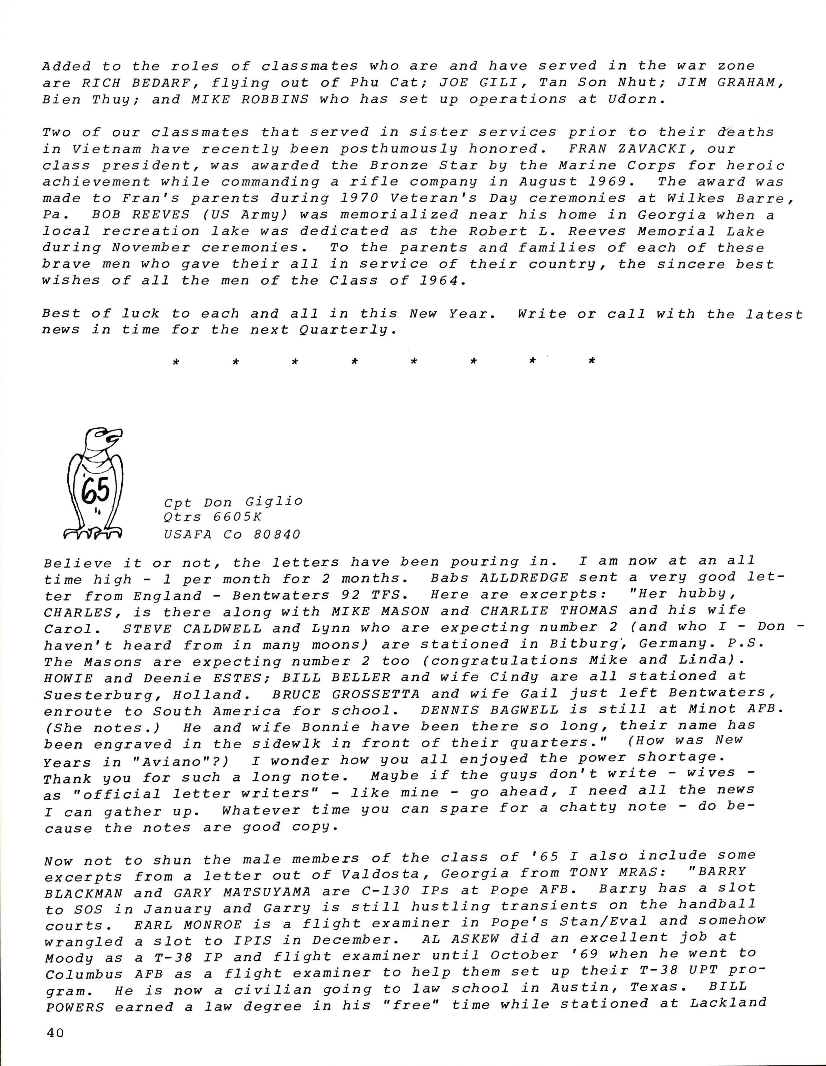 Two of our classmates that served in sister services prior to their deaths in Vietnam have recently been posthumously honored. FRAN ZAVACKI, our class president, was awarded the Bronze Star by the Marine Corps for heroic achievement while commanding a rifle company in August 1969. The award was made to Fran’s parents during 1970 Veteran's Day ceremonies at Wilkes Barre, Pa. BOB REEVES (US Army) was memorialized near his home in Georgia when a local recreation lake was dedicated as the Robert L. Reeves Memorial Lake during November ceremonies. To the parents and families of each of these brave men who gave their all in service of their country, the sincere best wishes of all the men of the Class of 1964.