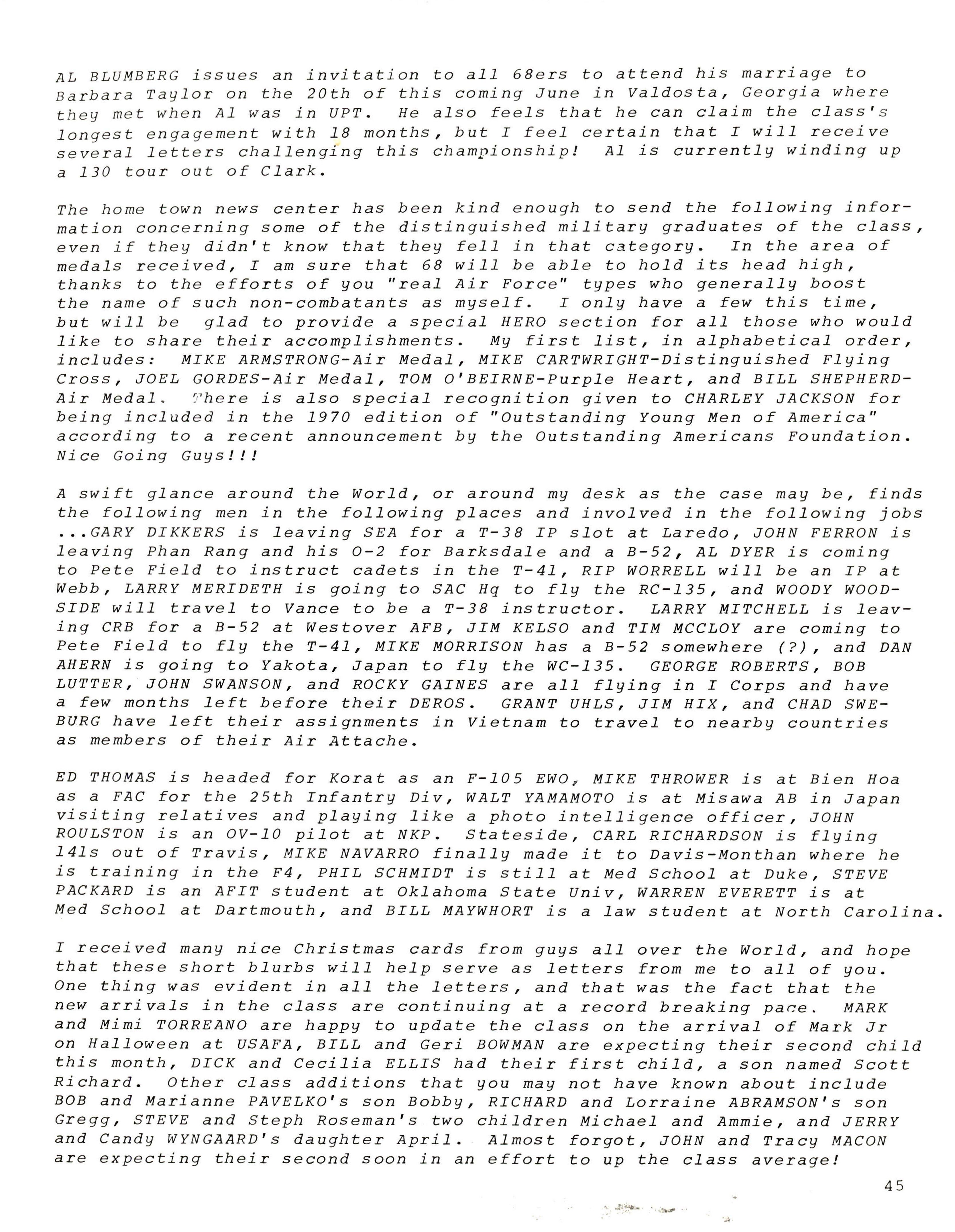 AL BLUMBERG issues an invitation to all 68ers to attend his marriage to Barbara Taylor on the 20th of this coming June in Valdosta, Georgia where they met when Al was in UPT. He also feels that he can claim the class's longest engagement with 18 months, but I feel certain that I will receive several letters challenging this championship 1 Al is currently winding up a 130 tour out of Clark.