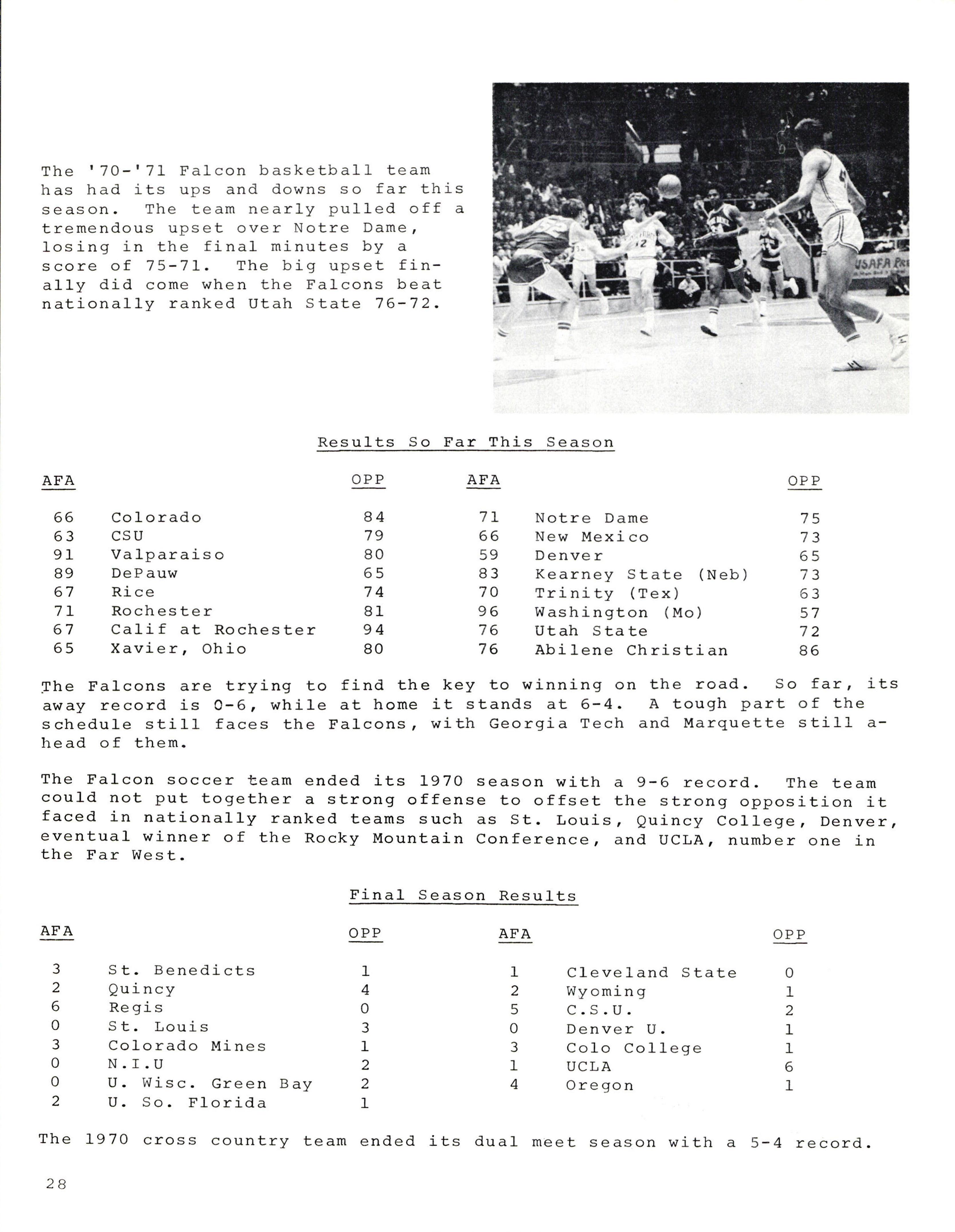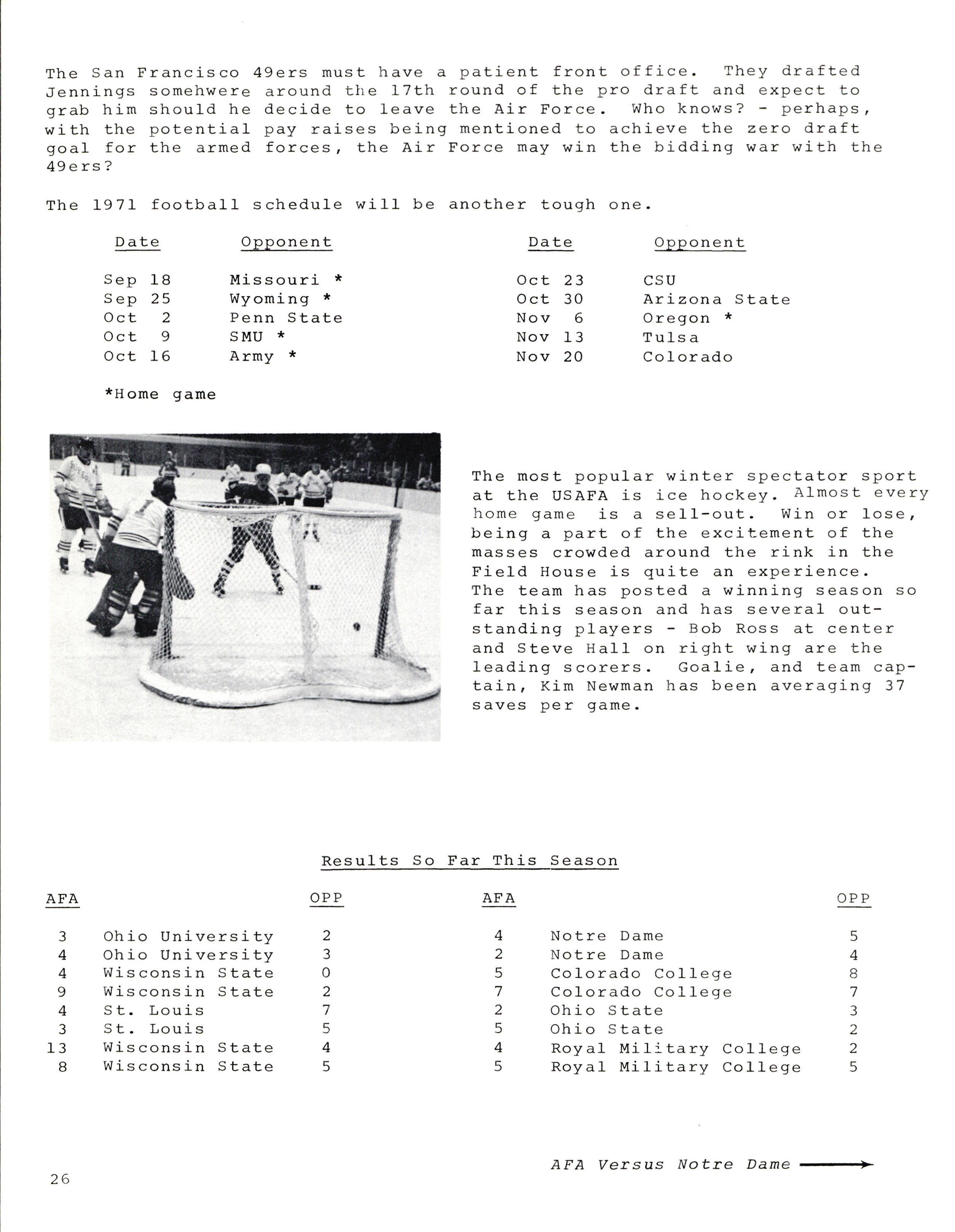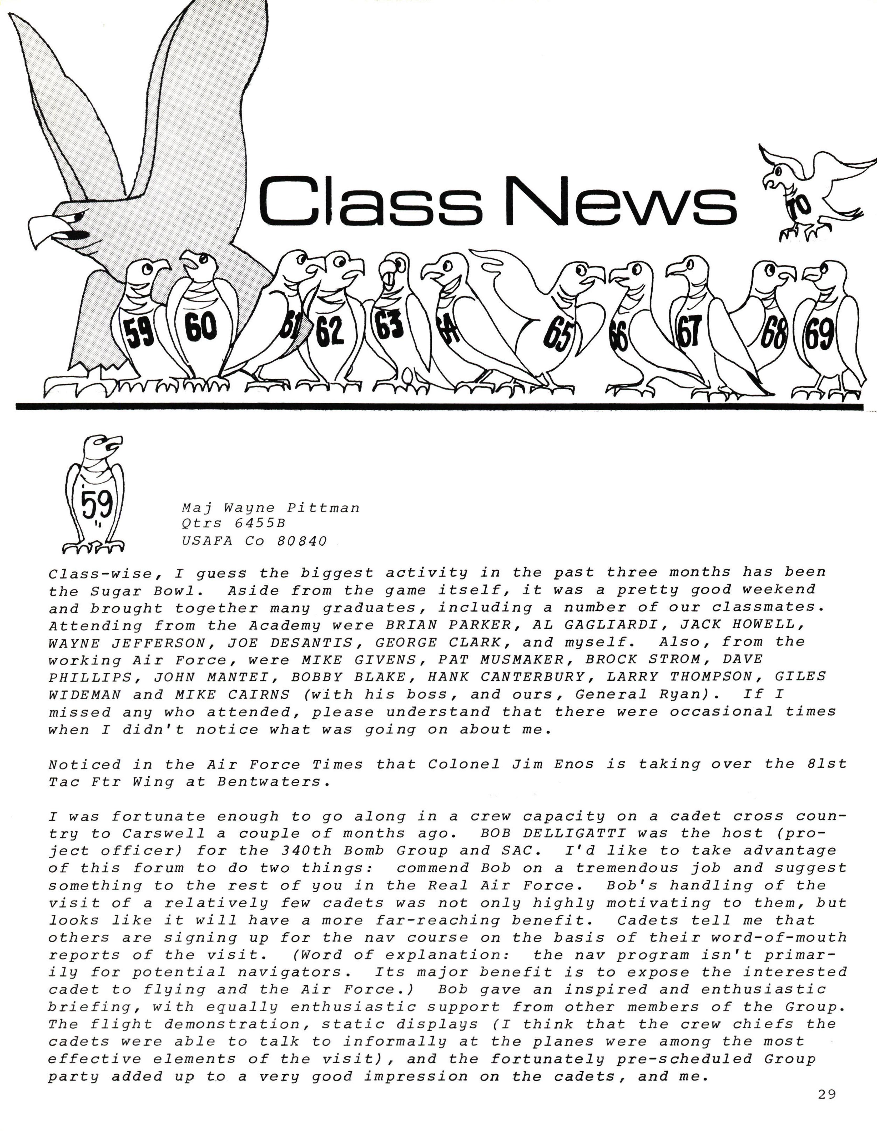 A belated Merry Christmas and Happy New Year to the Class of '69. May this New Year bring all of you that great big pie in the sky. Now that football season is over, the AFA is finally settling down (crashing down??) to the Dark Ages, nursing our hangovers and shattered hopes back to health. Things are changing a great deal on the hill, however, despite the advent of a real winter. Perhaps the most notable is an extensive new privilege package for all classes which gives the cadets much more freedom than in the past. It created such a havoc with the locals that it even made the local papers.