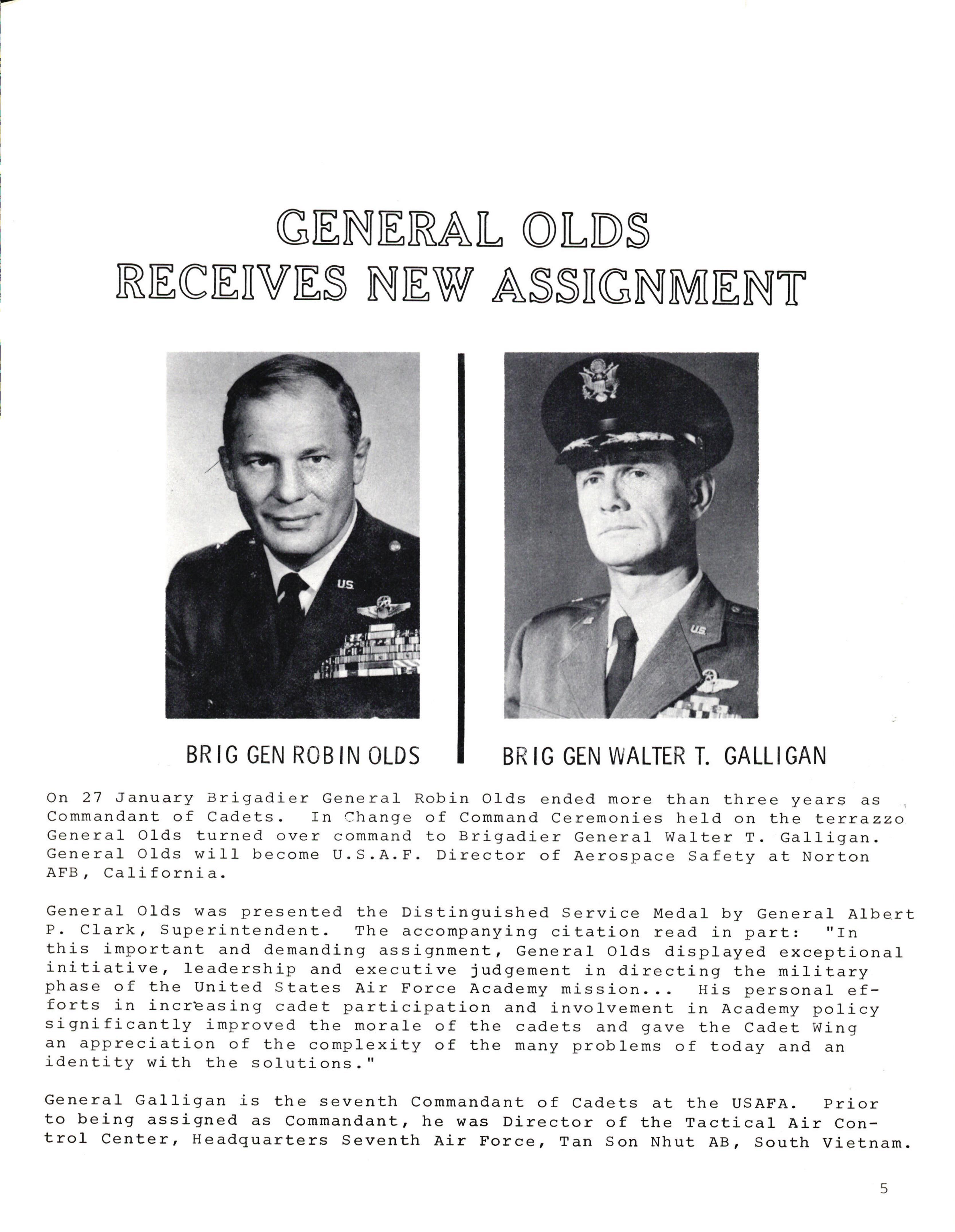 On 27 January Brigadier General Robin Olds ended more than three years as Commandant of Cadets. In Change of Command Ceremonies held on the terrazzo General Olds turned over command to Brigadier General Walter T. Galligan. General Olds will become U.S.A.F. Director of Aerospace Safety at Norton AFB, California.
