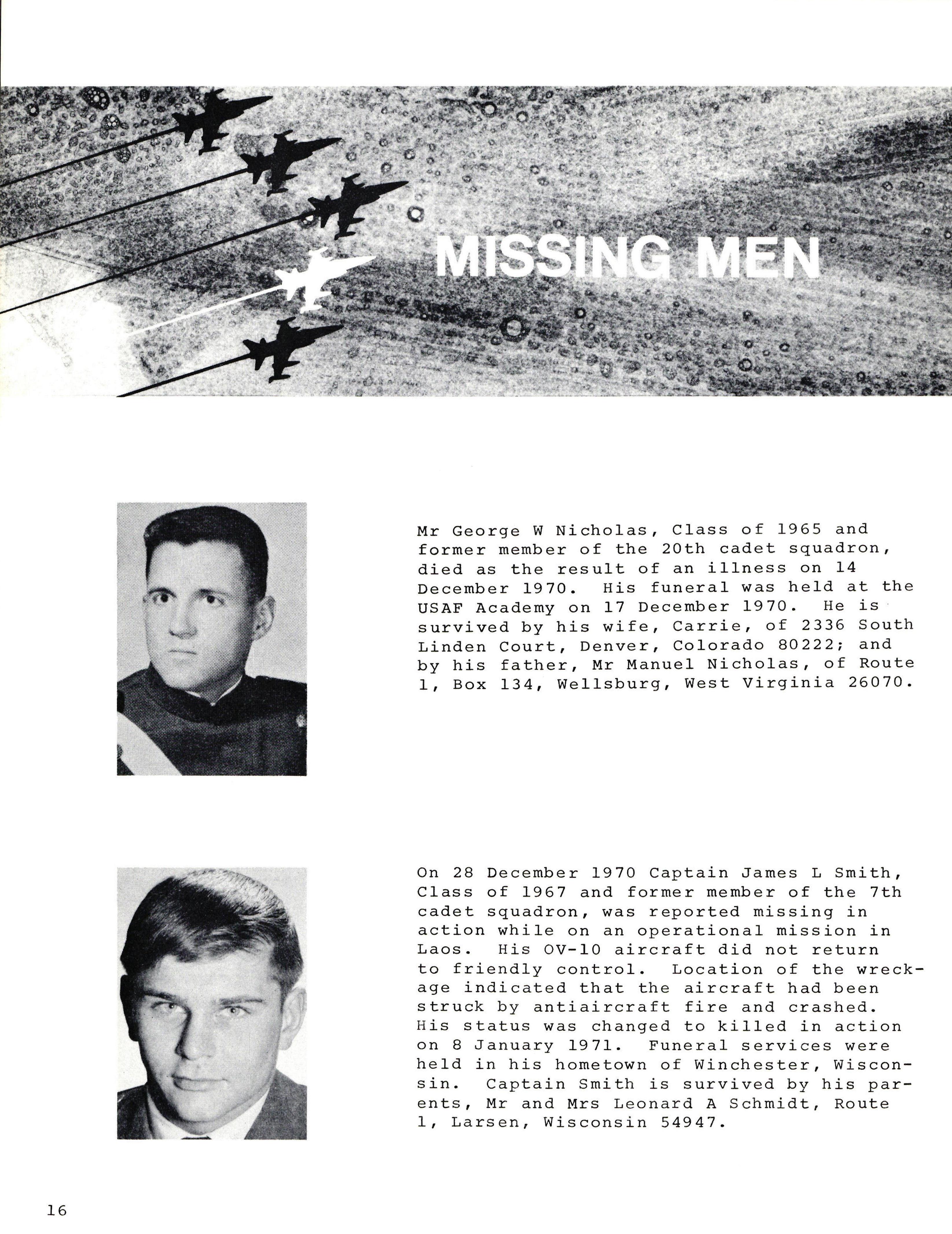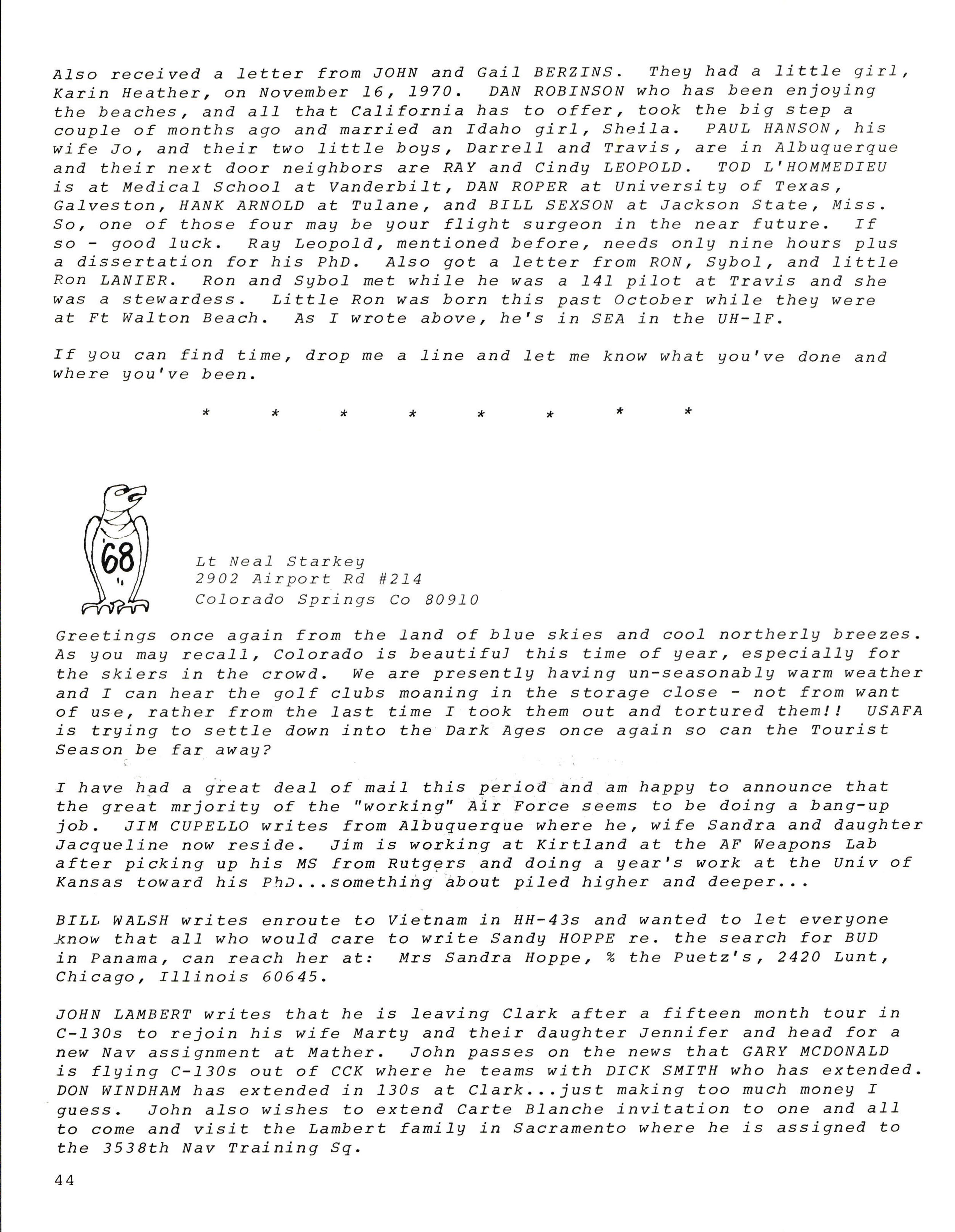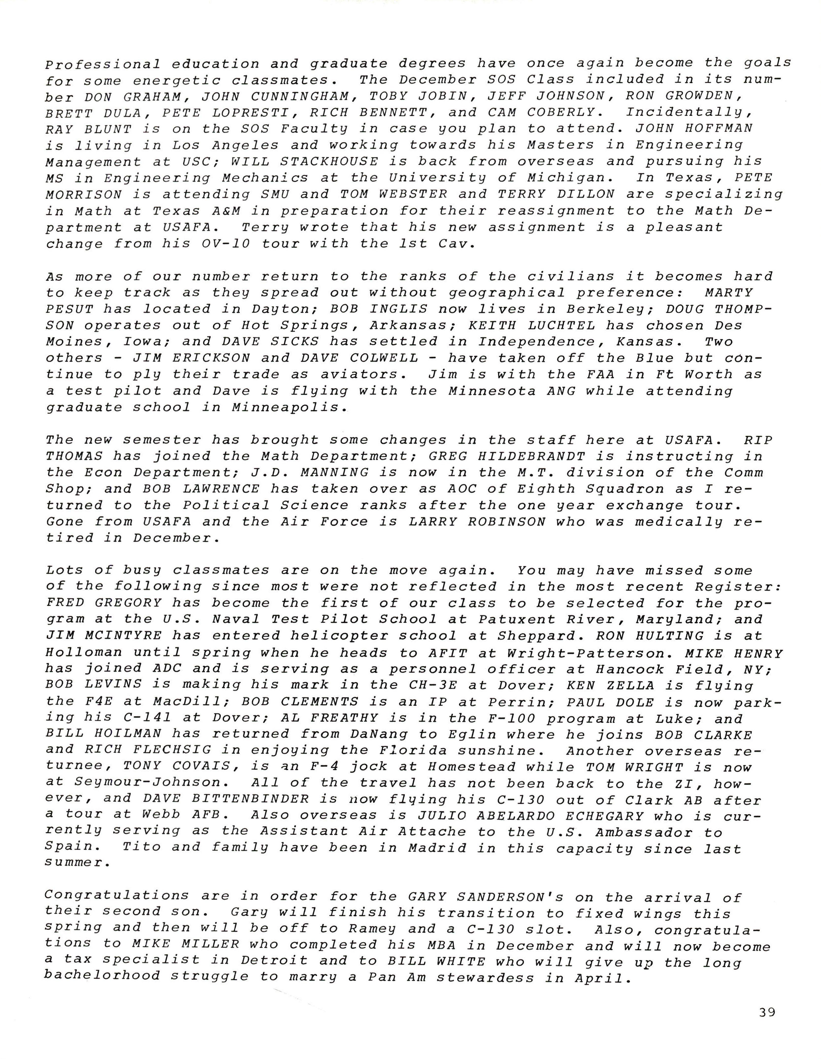 CHUCK HOSMER writes that he and TOM FLEMING are roommates at NKP flying the 0-2A, with the 23rd Tac Air Support Sq. JOHN YOUNG made his way over there; also at NKP in the 0-2. POO BEAR is at McClellan after UPT at Craig, MARK BOSE is in intelligence at Wright-Pat, and JOHN BRUMMITT is at McGuire in the right seat of the C-141. John says that he is still single, despite the hustling of a couple of a couple of fast ones at Willy. JEFF CAMPBELL is an IP at Keesler, BOB FRATT a student nav at Mather, STEVE HAMMOND is at Cannon "upgrading," and BOB HART is now at Castle. MIKE HAYNES is a B-52 co-pilot at Warner-Robins, DICK SPOONER a student nav at Mather, and ROD WOOD is "picnicing" at Shemya, Alaska, as a SSSO. GARY DEWEESE is a Space Object Identification Analyst at the SOI Center at Ent, and JOHN YOUNGHOUSE is at George in the back seat of the F-4.