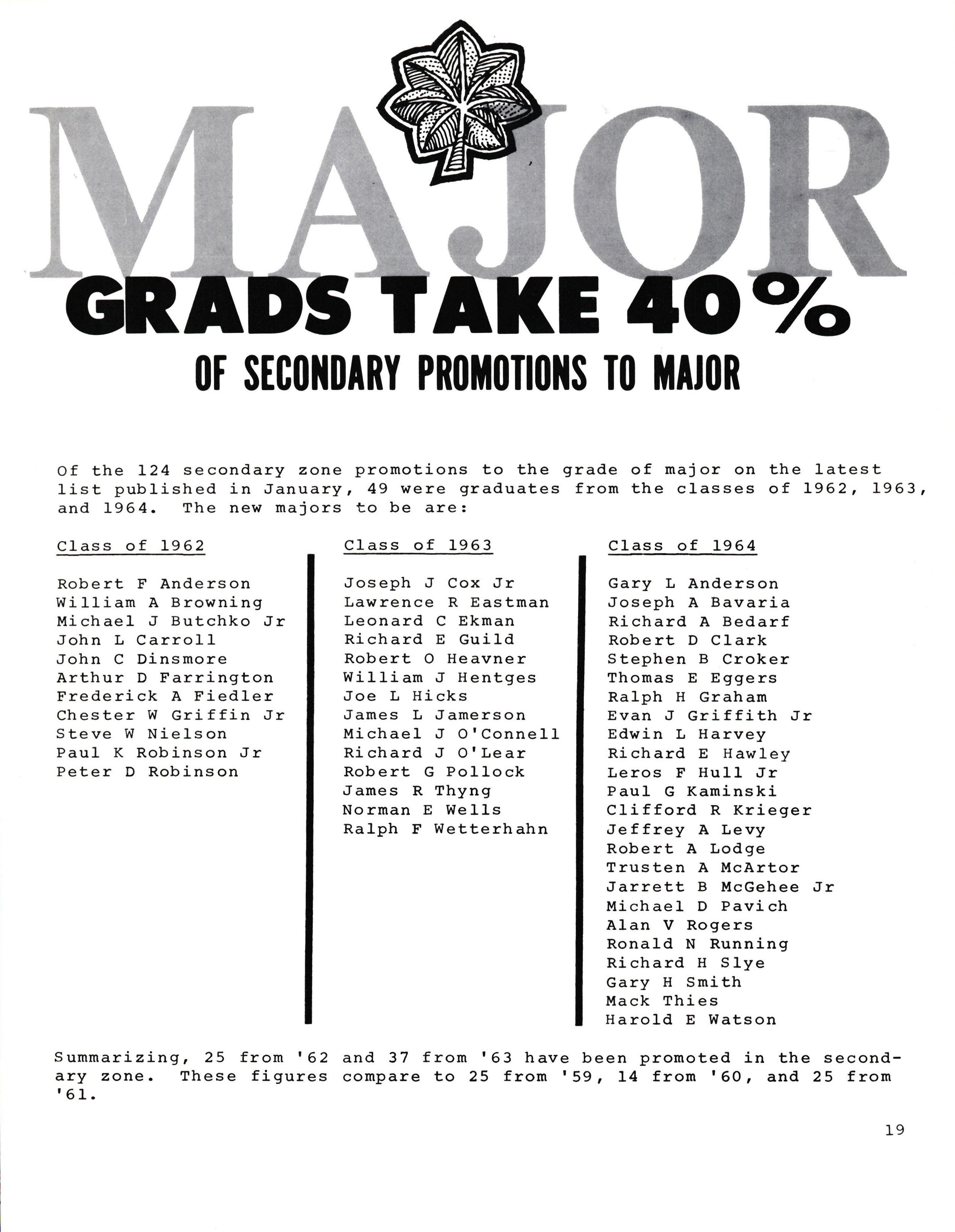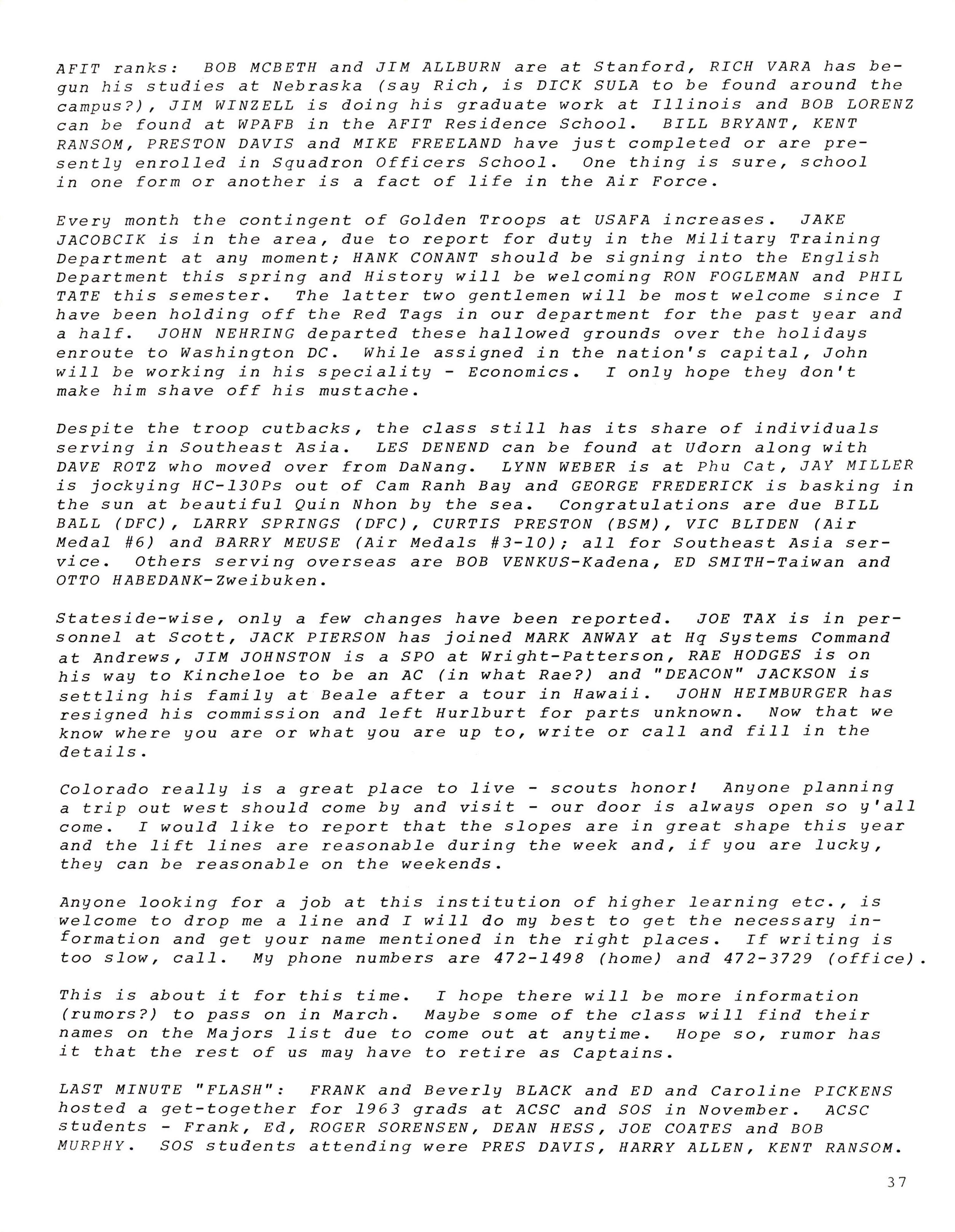 ED THOMAS is headed for Korat as an F-105 EWO, MIKE THROWER is at Bien Hoa as a FAC for the 25th Infantry Div, WALT YAMAMOTO is at Misawa AB in Japan visiting relatives and playing like a photo intelligence officer, JOHN ROULSTON is an OV-IO pilot at NKP. Stateside, CARL RICHARDSON is flying 141s out of Travis, MIKE NAVARRO finally made it to Davis-Month an where he is training in the F4, PHIL SCHMIDT is still at Med School at Duke, STEVE PACKARD is an AFIT student at Oklahoma State Univ, WARREN EVERETT is at Med School at Dartmouth, and BILL MAYWHORT is a law student at North Carolina.