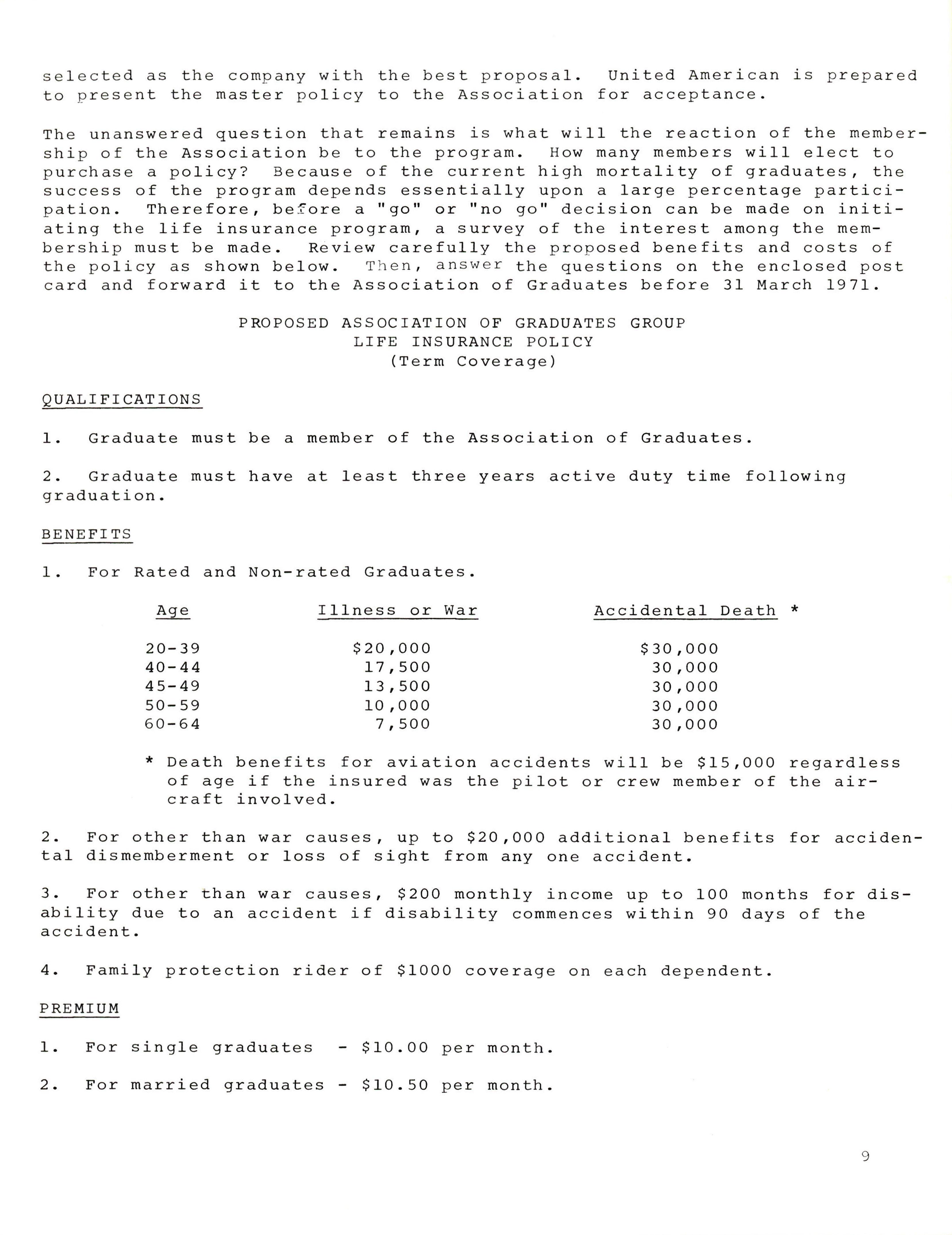 The unanswered question that remains is what will the reaction of the membership of the Association be to the program. How many members will elect to purchase a policy? Because of the current high mortality of graduates, the success of the program depends essentially upon a large percentage participation. Therefore, before a "go" or "no go" decision can be made on initiating the life insurance program, a survey of the interest among the membership must be made. Review carefully the proposed benefits and costs of the policy as shown below. Then, answer the questions on the enclosed post card and forward it to the Association of Graduates before 31 March 1971.