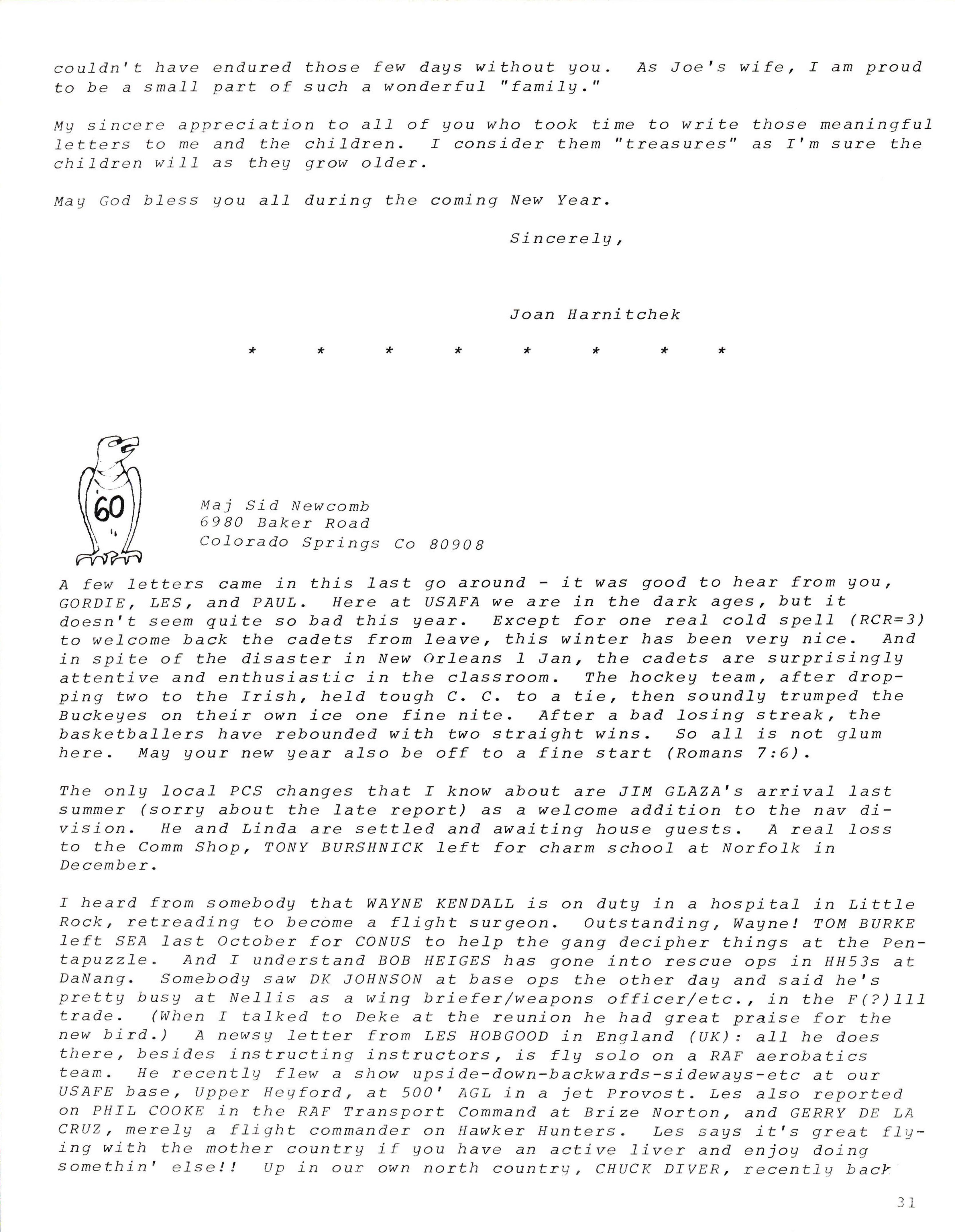 Believe it or not, the letters have been pouring in. I am now at an all time high - 1 per month for 2 months. Babs ALLDREDGE sent a very good letter from England - Bentwaters 9 2 TFS. Here are excerpts: "Her hubby, CHARLES, is there along with MIKE MASON and CHARLIE THOMAS and his wife Carol. STEVE CALDWELL and Lynn who are expecting number 2 (and who I - Don haven't heard from in many moons) are stationed in Bitburg', Germany. P.S. The Masons are expecting number 2 too (congratulations Mike and Linda). HOWIE and Deenie ESTES; BILL BELLER and wife Cindy are all stationed at Suesterburg, Holland. BRUCE GROSSETTA and wife Gail just left Bentwaters, enroute to South America for school. DENNIS BAGWELL is still at Minot AFB. (She notes.) He and wife Bonnie have been there so long, their name has been engraved in the sidewlk in front of their quarters." (How was New Years in "Aviano"?) I wonder how you all enjoyed the power shortage. Thank you for such a long note. Maybe if the guys don’t write - wivesas "official letter writers" - like minego ahead, I need all the news I can gather up. Whatever time you can spare for a chatty note - do because the notes are good copy.