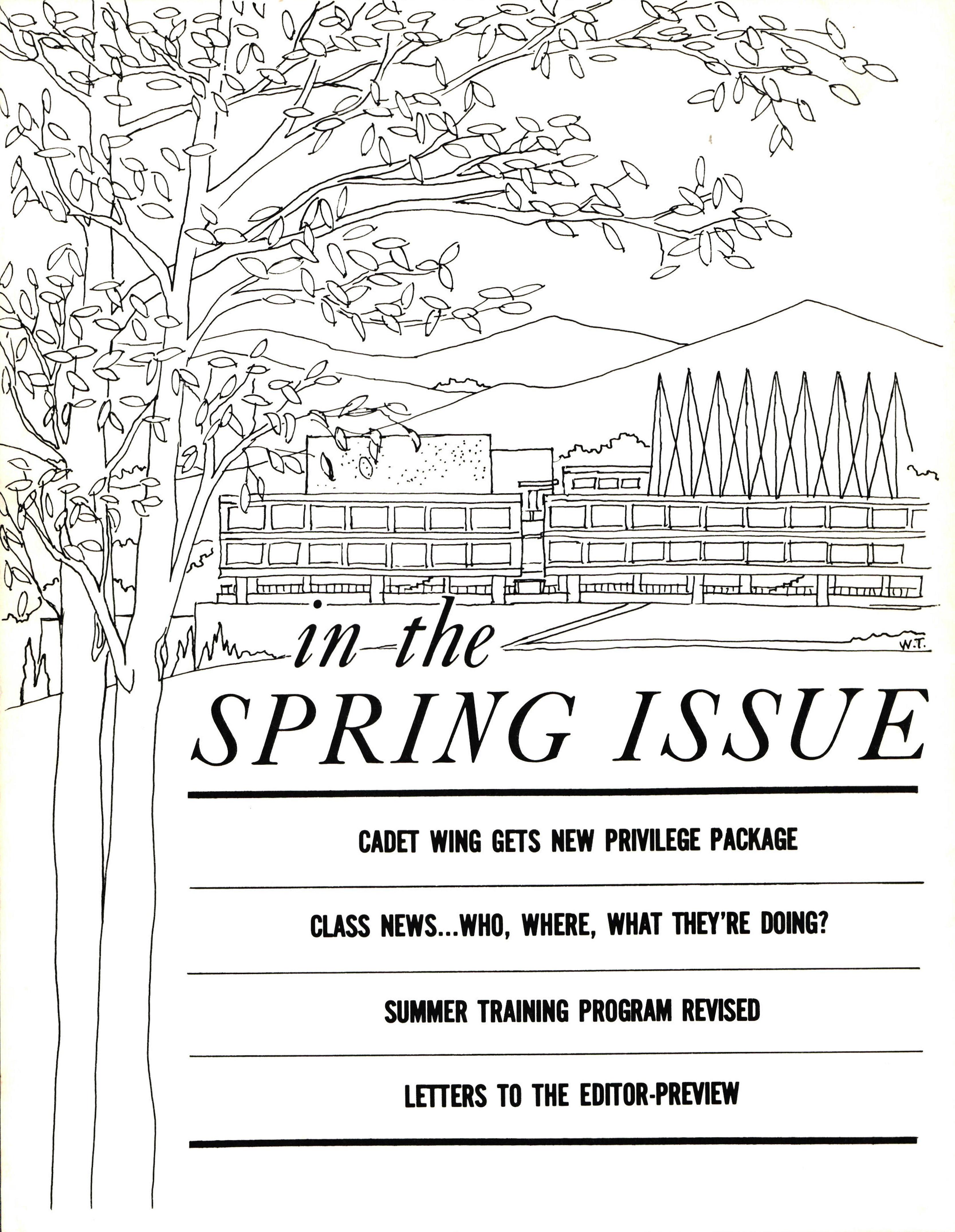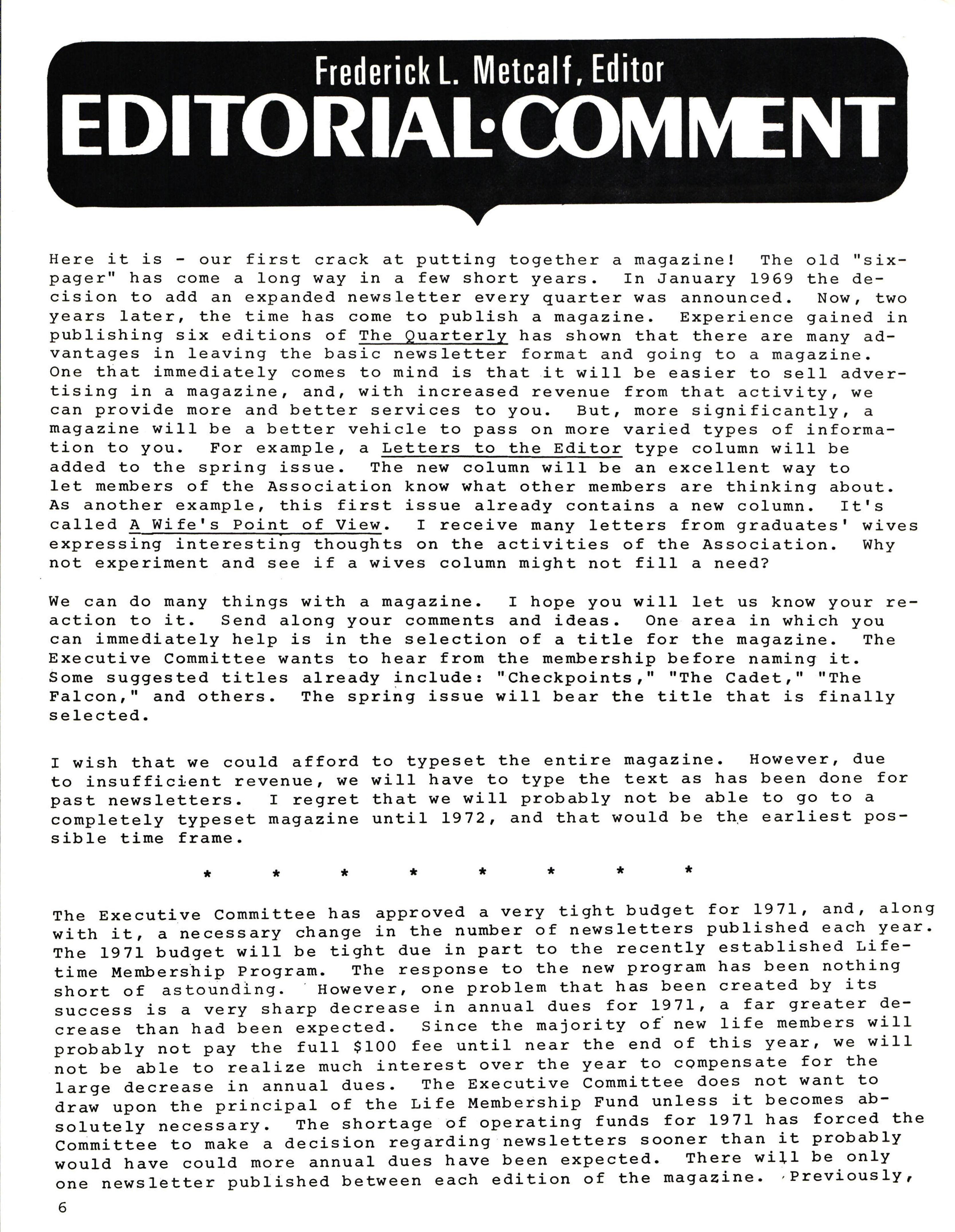 We can do many things with a magazine. I hope you will let us know your reaction to it. Send along your comments and ideas. One area in which you can immediately help is in the selection of a title for the magazine. The Executive Committee wants to hear from the membership before naming it. Some suggested titles already include: "Checkpoints," "The Cadet," "The Falcon," and others. The spring issue will bear the title that is finally selected.