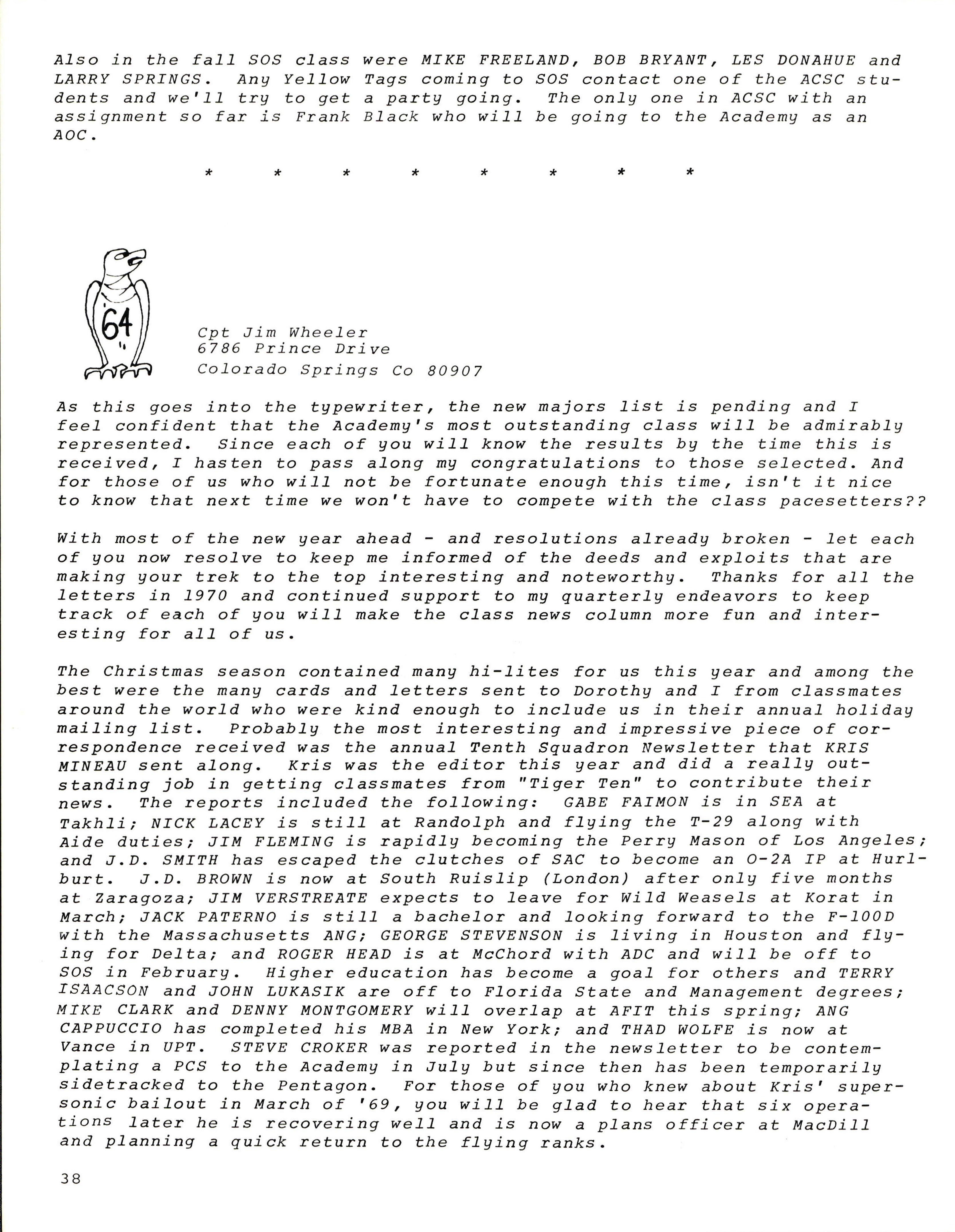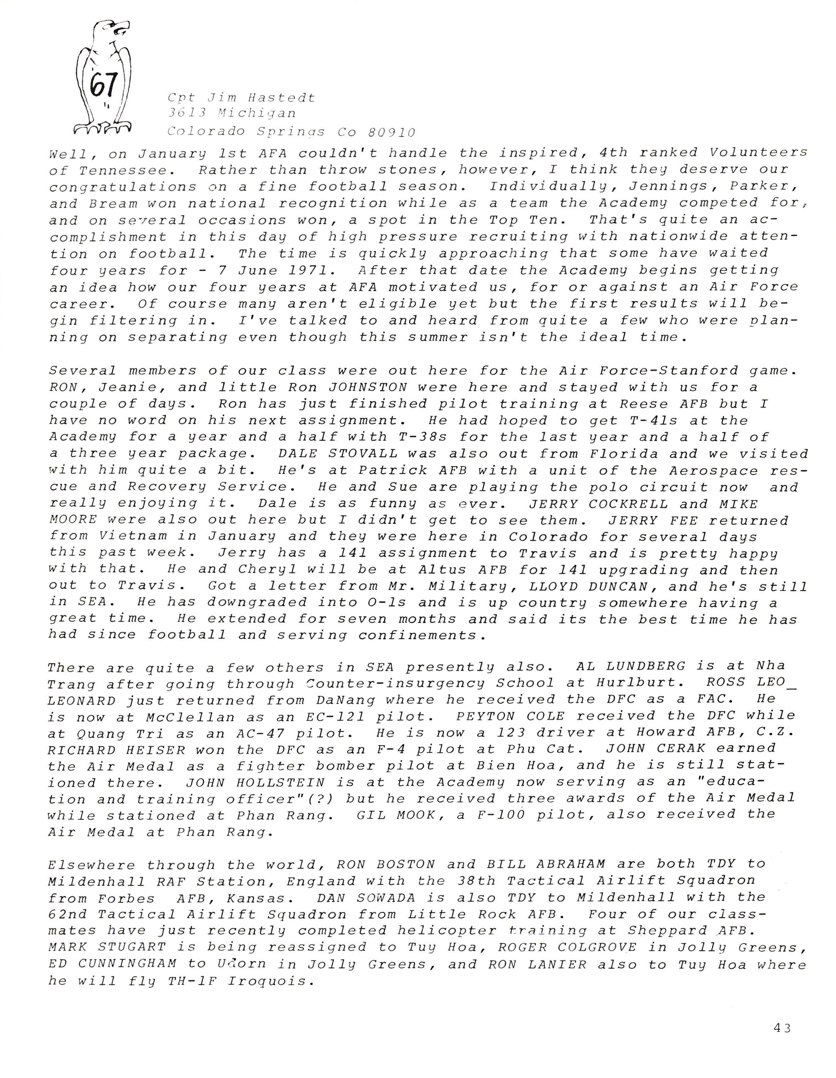 Since I have to pack for a portcall day after tomorrow, I'll stop here. If anyone has any late info for the next Quarterly, please send it to the Association office at the Academy, pending selection of a more permanent class representative. If any of you pass through Colorado and are looking for a place to stay or a warm meal, feel free to drop in. I won't be there but Candy would like the company to keep her busy.