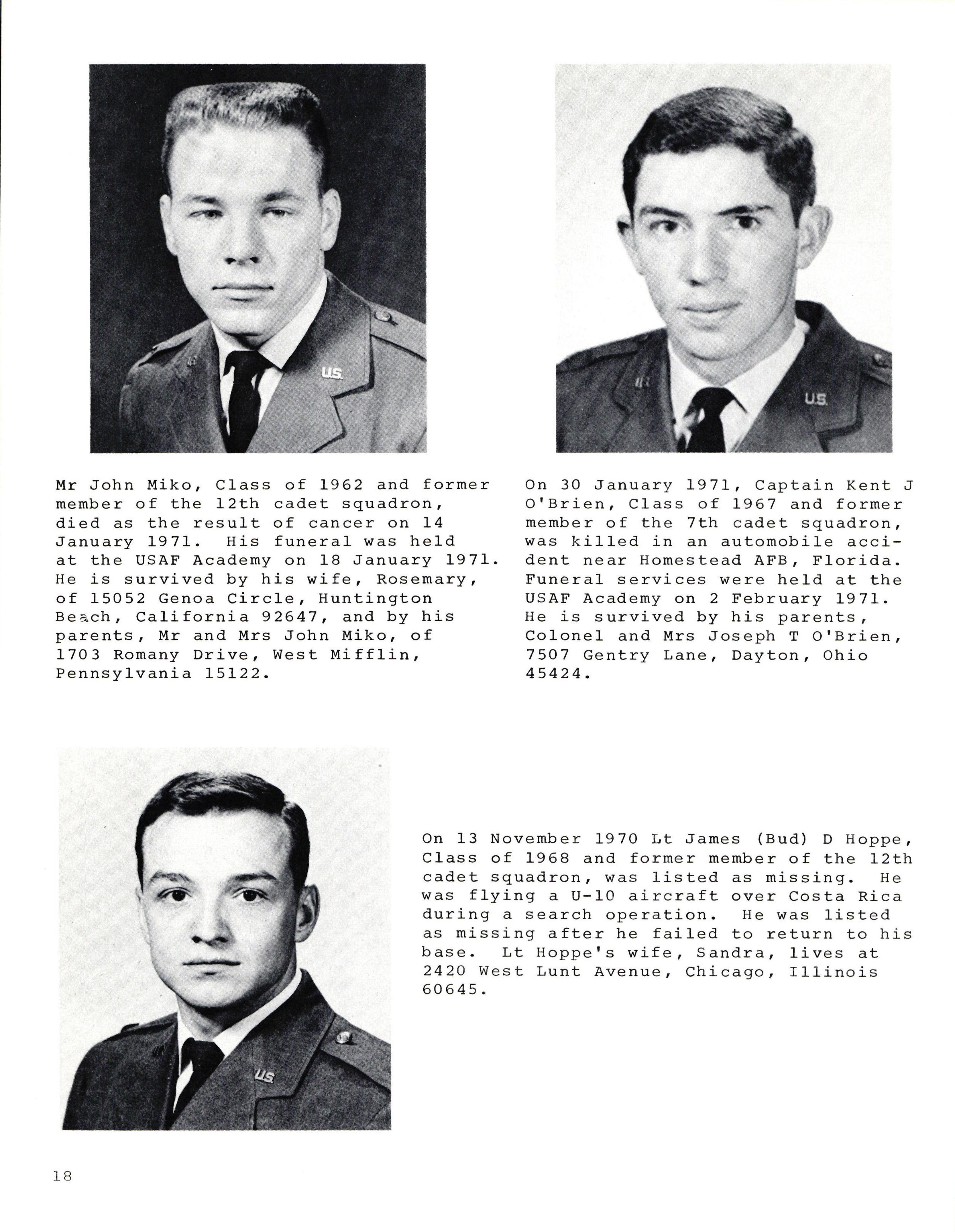 The home town news center has been kind enough to send the following information concerning some of the distinguished military graduates of the class, even if they didn't know that they fell in that category. In the area of medals received, I am sure that 68 will be able to hold its head high, thanks to the efforts of you "real Air Force" types who generally boost the name of such non-combatants as myself. I only have a few this time, but will be glad to provide a special HERO section for all those who would like to share their accomplishments. My first list, in alphabetical order, includes: MIKE ARMSTRONG-Air Medal, MIKE CARTWRIGHT-Distinguished Flying Cross, JOEL GORDES-Air Medal, TOM O'BEIRNE-Purple Heart, and BILL SHEPHERDAir Medal. There is also special recognition given to CHARLEY JACKSON for being included in the 1970 edition of "Outstanding Young Men of America" according to a recent announcement by the Outstanding Americans Foundation. Nice Going Guys!!!