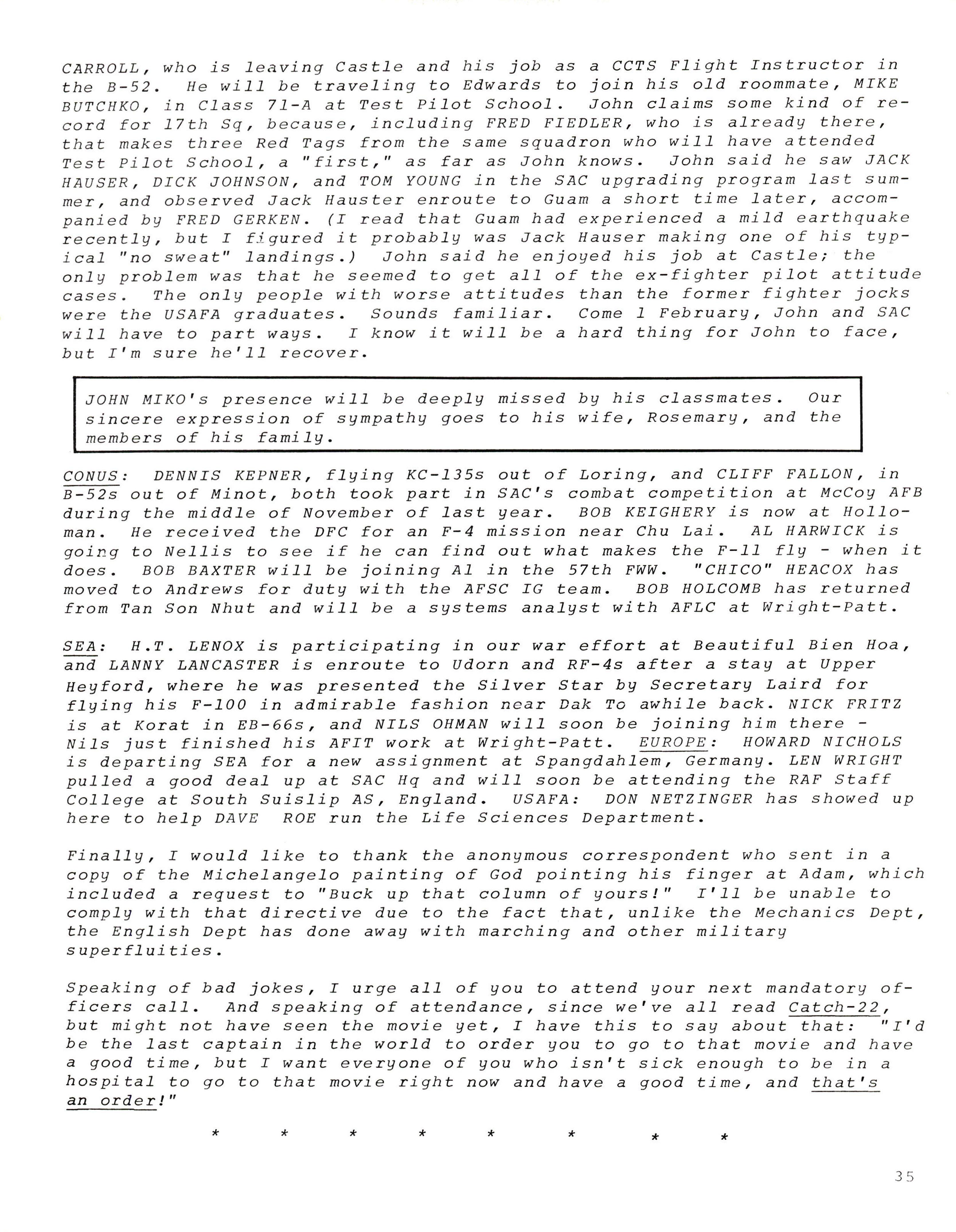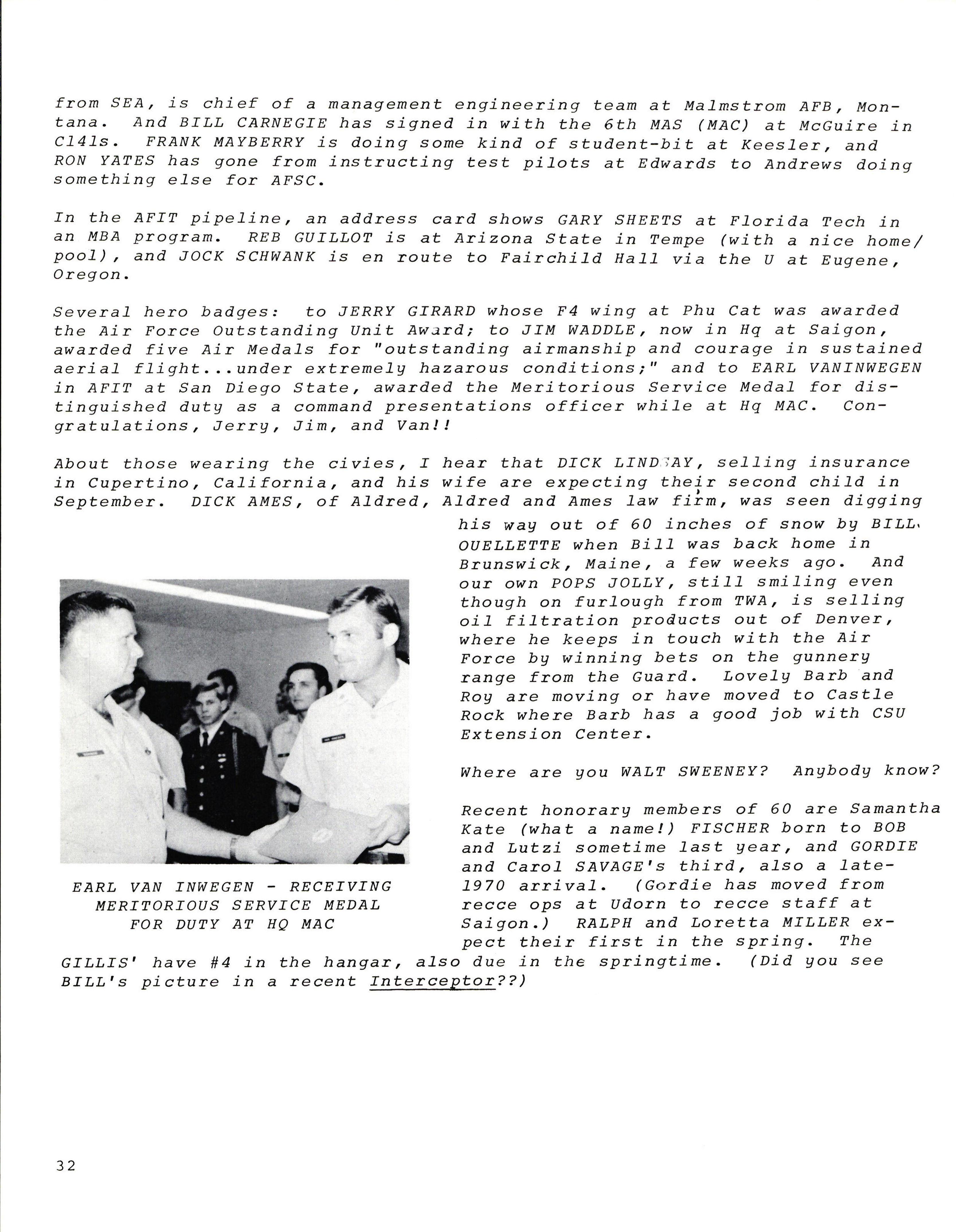 A swift glance around the World, or around my desk as the case may be, finds the following men in the following places and involved in the following jobs ...GARY DIKKERS is leaving SEA for a T-38 IP slot at Laredo, JOHN FERRON is leaving Phan Rang and his 0-2 for Barksdale and a B-52, AL DYER is coming to Pete Field to instruct cadets in the T-41, RIP WORRELL will be an IP at Webb, LARRY MERIDETH is going to SAC Hq to fly the RC-135, and WOODY WOODSIDE will travel to Vance to be a T-38 instructor. LARRY MITCHELL is leaving CRB for a B-52 at Westover AFB, JIM KELSO and TIM MCCLOY are coming to Pete Field to fly the T-41, MIKE MORRISON has a B-52 somewhere (?), and DAN AHERN is going to Yakota, Japan to fly the WC-135. GEORGE ROBERTS, BOB LUTTER, JOHN SWANSON, and ROCKY GAINES are all flying in I Corps and have a few months left before their DEROS. GRANT UHLS, JIM HIX, and CHAD SWEBURG have left their assignments in Vietnam to travel to nearby countries as members of their Air Attache.
