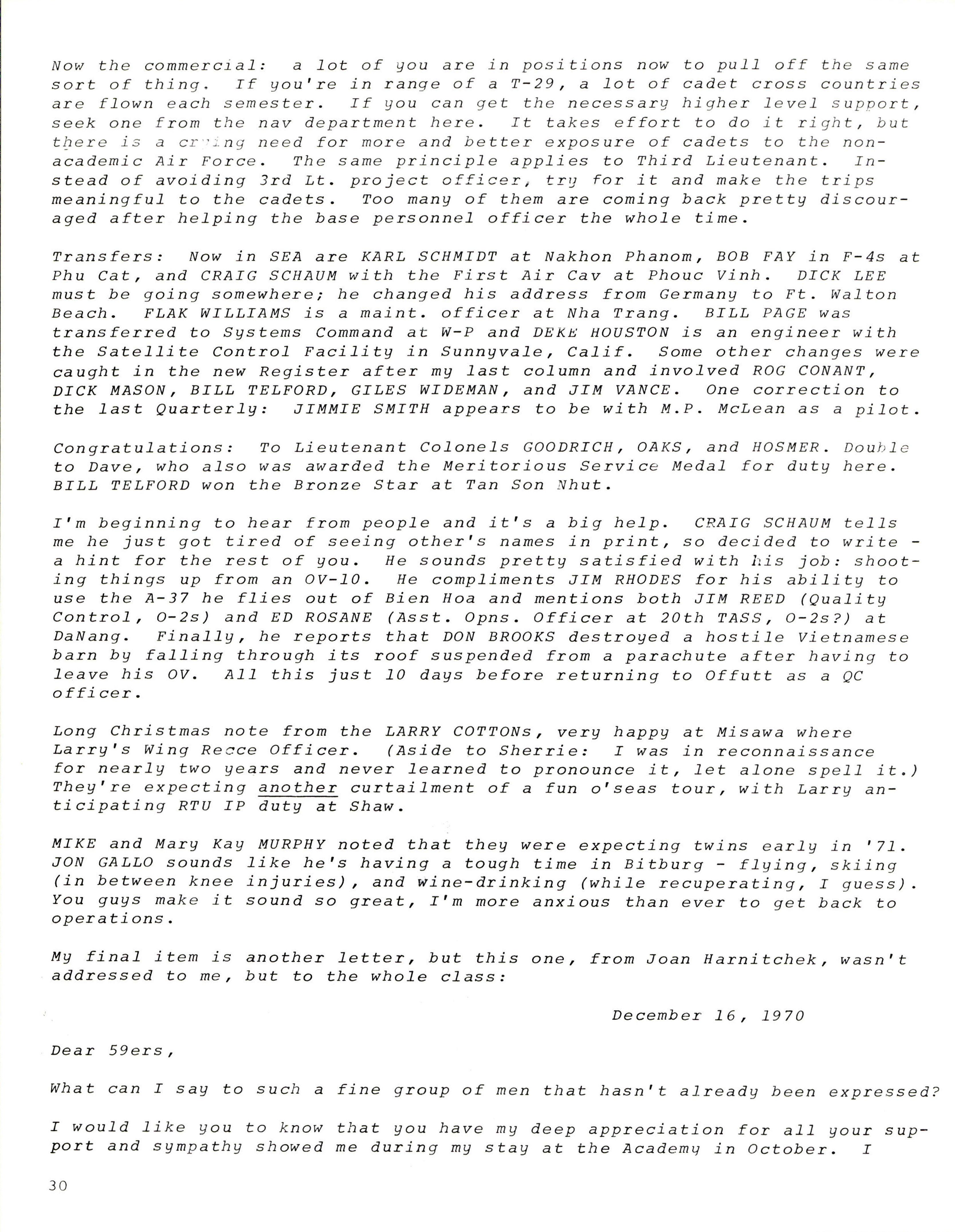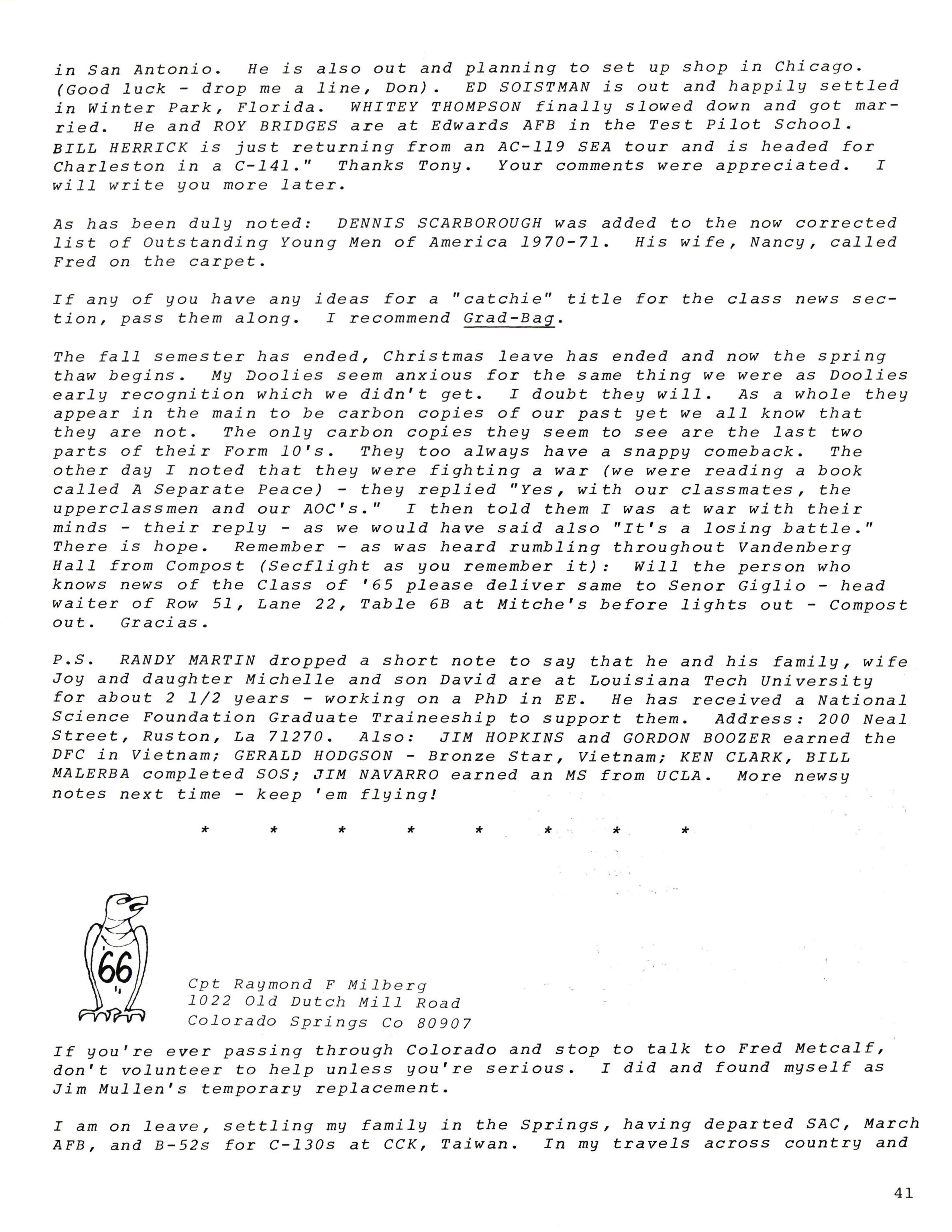 That wraps it up for now, and I want to thank all those that wrote for keep ing us all filled in on the current status of the class. I hope this news finds you all well and happy and already hard at work in the New Year. Until the next edition, best wishes for a happy and prosperous 1971!!!