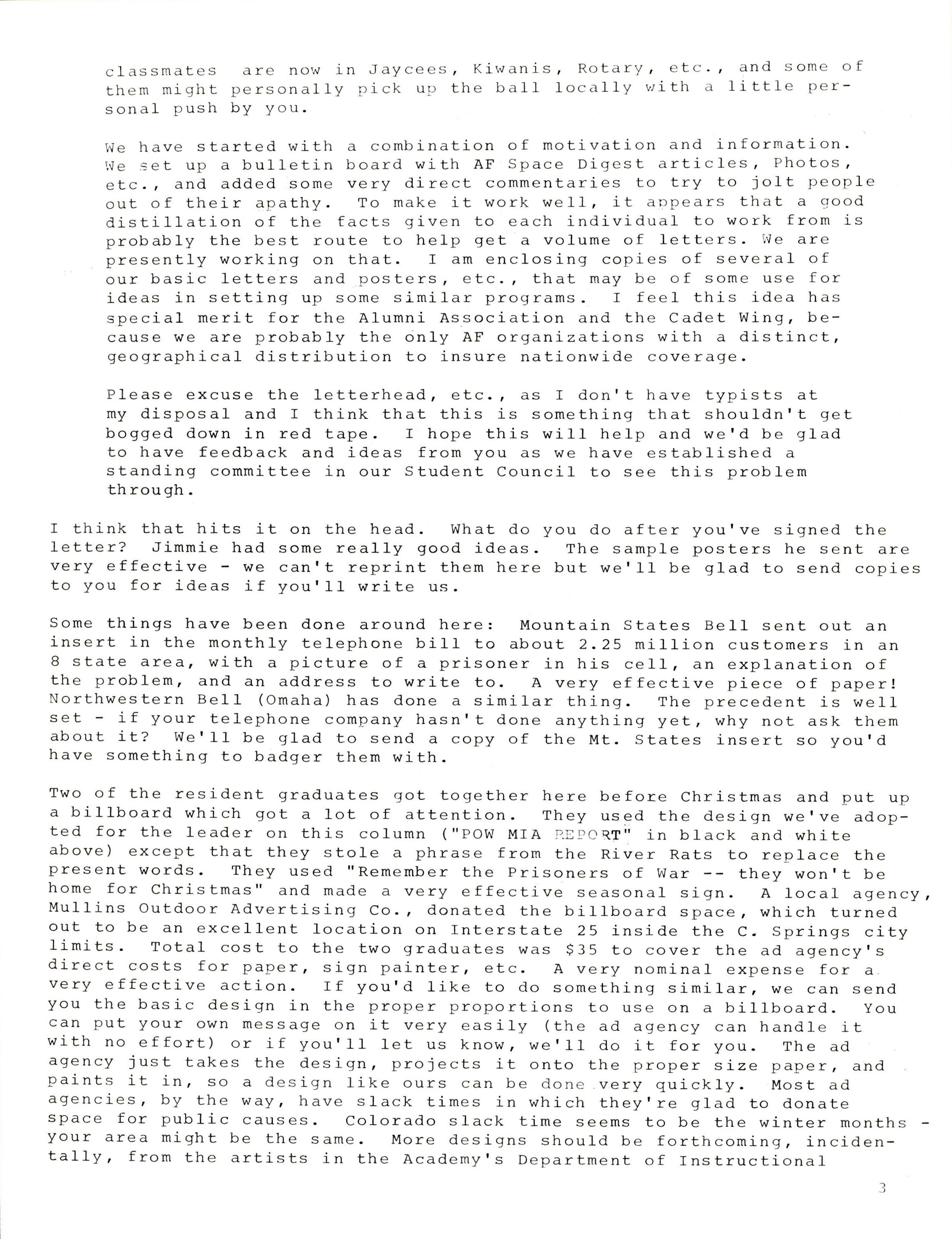 Two of the resident graduates got together here before Christmas and put up a billboard which got a lot of attention. They used the design we've adopted for the leader on this column ("POW7 MIA REPORT" in black and white above) except that they stole a phrase from the River Rats to replace the present words. They used "Remember the Prisoners of War they won't be home for Christmas" and made a very effective seasonal sign. A local agency Mullins Outdoor Advertising Co., donated the billboard space, which turned out to be an excellent location on Interstate 25 inside the C. Springs city limits. Total cost to the two graduates was $35 to cover the ad agency's direct costs for paper, sign painter, etc. A very nominal expense for a very effective action. If you'd like to do something similar, we can send you the basic design in the proper proportions to use on a billboard. You can put your own message on it very easily (the ad agency can handle it with no effort) or if you'll let us know, we'll do it for you. The ad agency just takes the design, projects it onto the proper size paper, and paints it in, so a design like ours can be done very quickly. Most ad agencies, by the way, have slack times in which they're glad to donate space for public causes. Colorado slack time seems to be the winter months your area might be the same. More designs should be forthcoming, incidentally, from the artists in the Academy's Department of Instructional