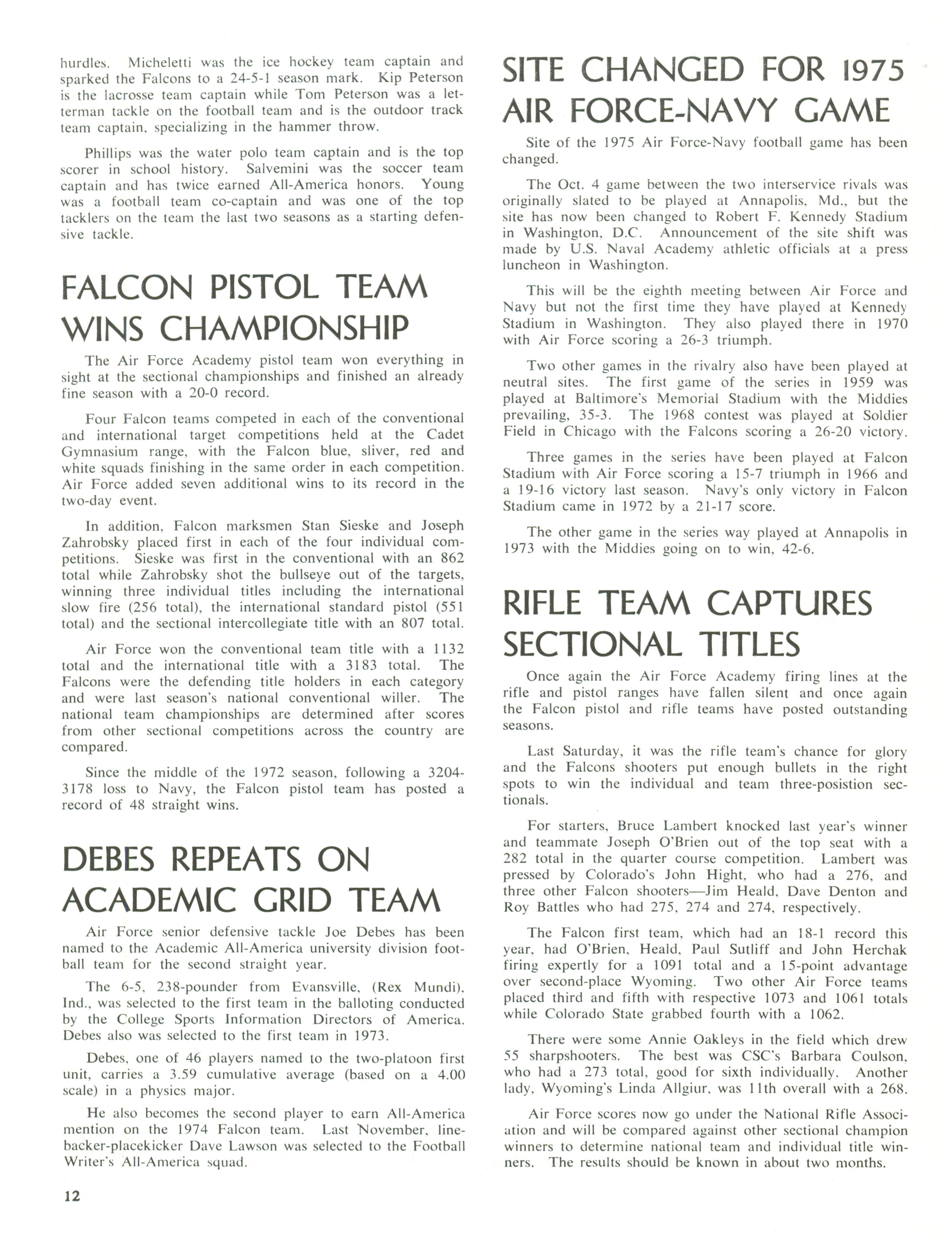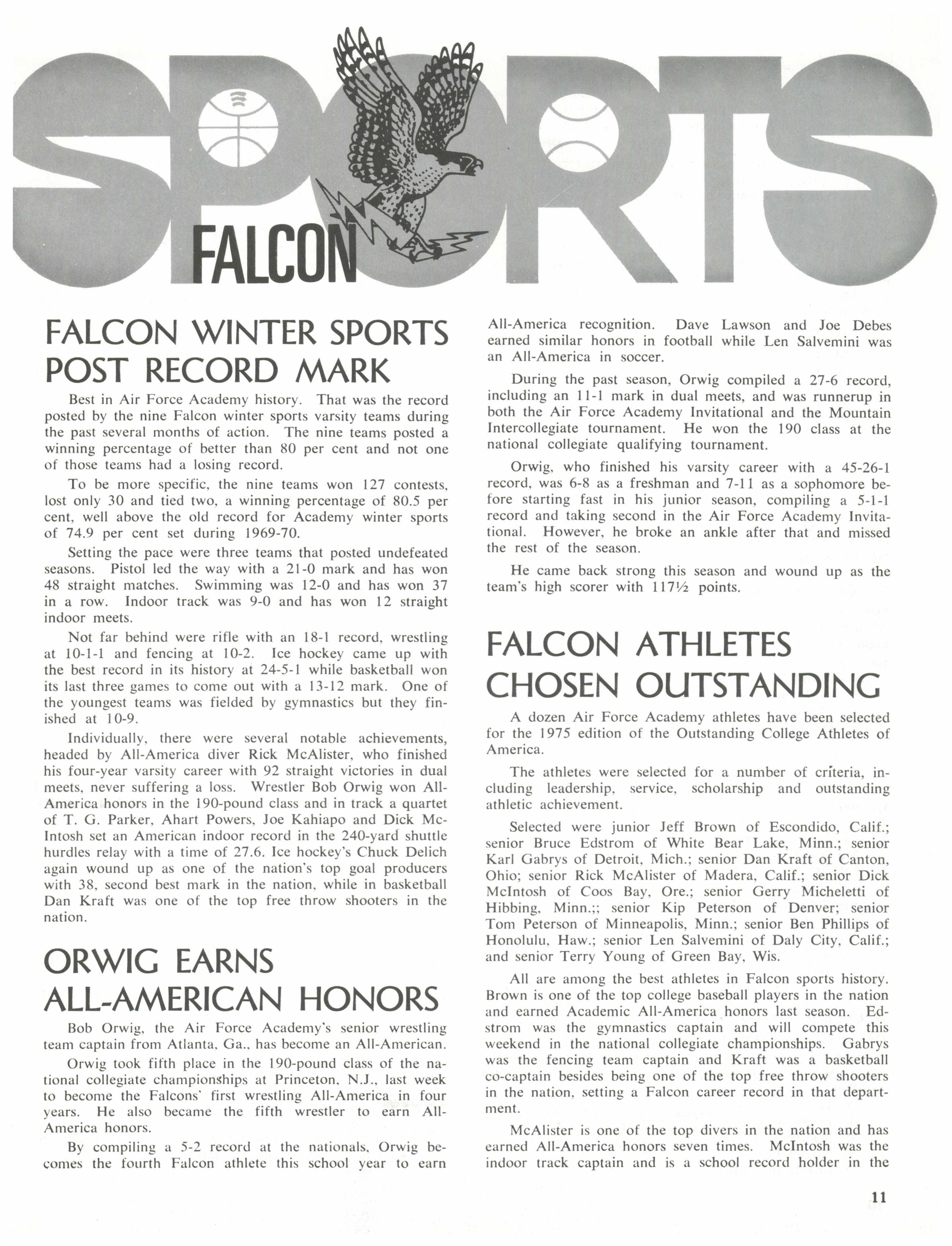 The Academy was fortunate to have completed the most successful winter sports season in our history, with a winning percentage of 80%. The hockey team had one of the best records in the nation, with a 24-5-1 season. The 19 February game with Colorado College was one of the most stirring athletic contests I have ever been privileged to witness. In the last five minutes of the game, the Falcons came from behind to score four goals and to win the contest in sudden-death overtime. This dramatic performance demonstrated the spirit and motivation of the Wing, and the positive benefits which athletic competition lends to leadership training and development of team effort.