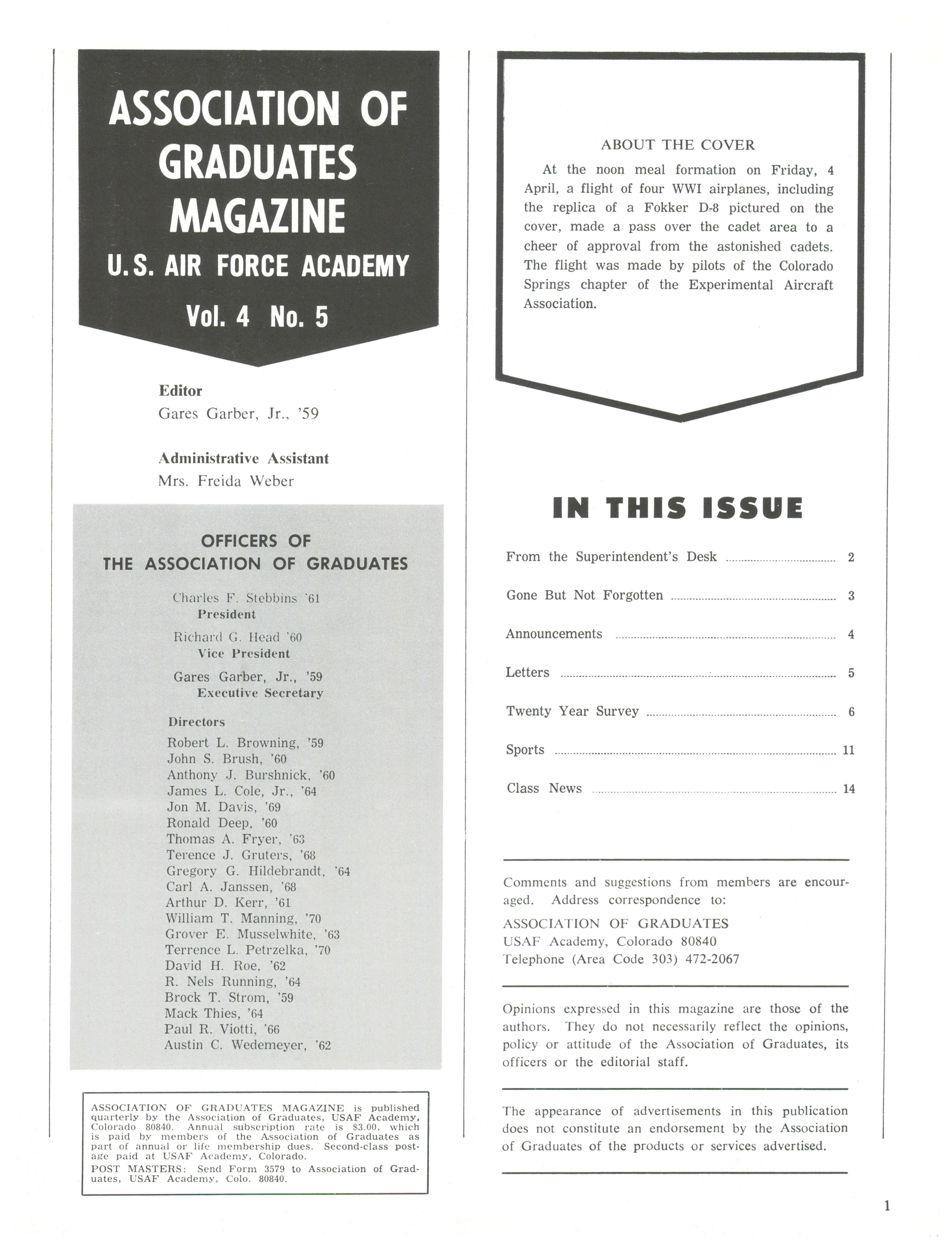 At the noon meal formation on Friday, 4 April, a flight of four WWI airplanes, including the replica of a Fokker D-8 pictured on the cover, made a pass over the cadet area to a cheer of approval from the astonished cadets. The flight was made by pilots of the Colorado Springs chapter of the Experimental Aircraft Association.