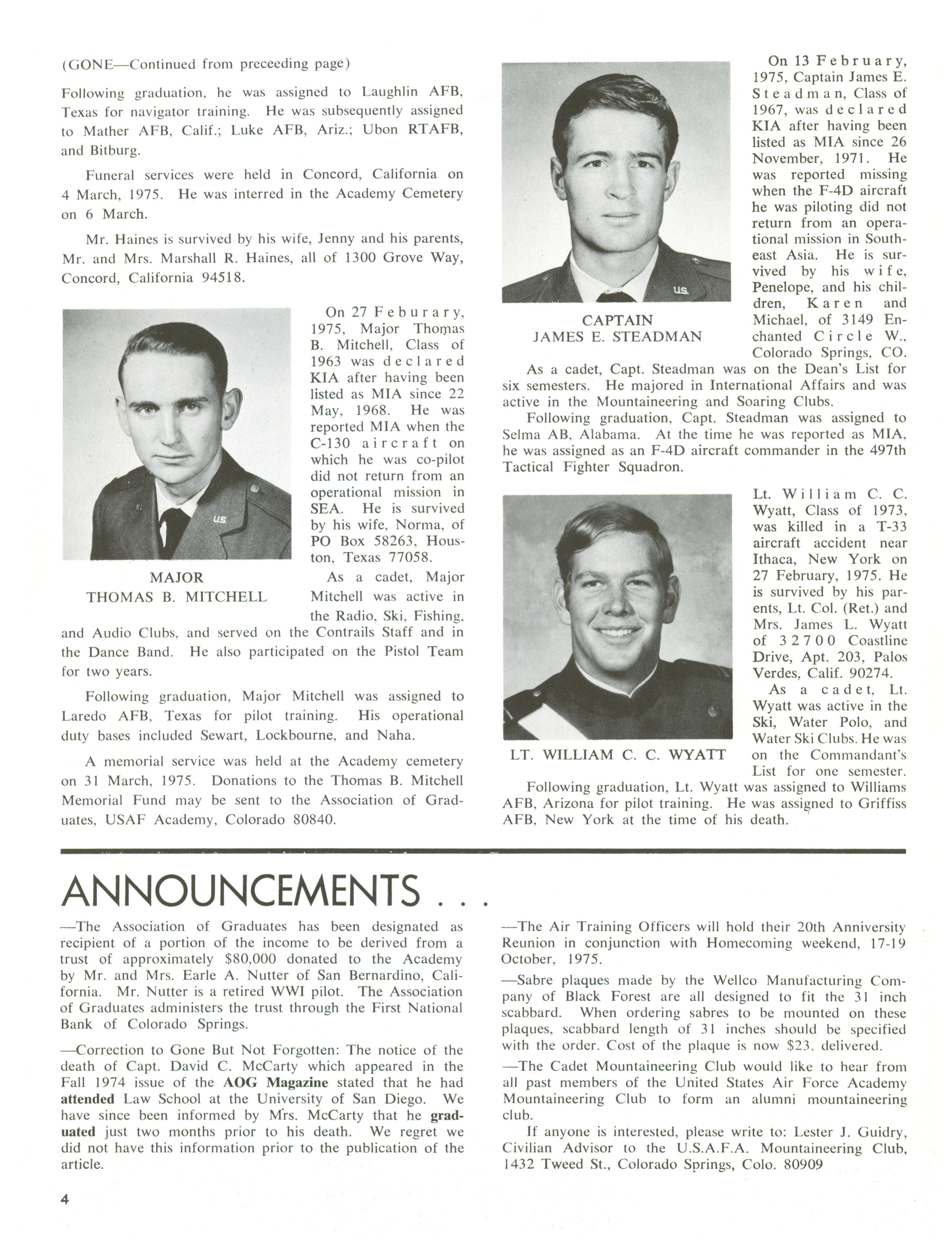 On 27 F e b u r a r y, 1975, Major Thomas B. Mitchell, Class of 1963 was declared KIA after having been listed as MIA since 22 May, 1968. He was reported MIA when the C-l 30 aircraft on which he was co-pilot did not return from an operational mission in SEA, He is survived by his wife, Norma, of PO Box 58263, Houston, Texas 77058.