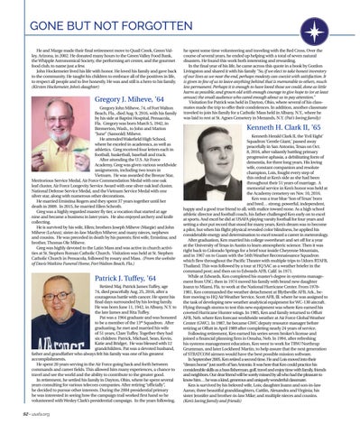 Gregory J. Miheve, ’64 Gregory John Miheve, 74, of Fort Walton Beach, Fla., died Aug. 9, 2916, with his family by his side at Baptist Hospital, Pensacola, Fla. Gregory was born March 5, 1942, in Bremerton, Wash., to John and Marion “June” (Saxwold) Miheve. He attended Wakefield High School, where he exceled in academics, as well as athletics. Greg received four letters each in football, basketball, baseball and track. After attending the U.S. Air Force Academy, Greg was given various worldwide assignments, including two tours in Vietnam. He was awarded the Bronze Star, Meritorious Service Medal, Air Force Commendation Medal with one oak leaf cluster, Air Force Longevity Service Award with one silver oak leaf cluster, National Defense Service Medal, and the Vietnam Service Medal with one silver star, along with numerous other decorations. He married Ernistina Rogers and they spent 37 years together until her death in 2009. In 2015, he married Ellen Schroth. Greg was a highly regarded master fly tier, a vocation that started at age nine and became a business in later years. He also enjoyed archery and knife collecting. He is survived by his wife, Ellen; brothers Joseph Miheve (Margie) and John Miheve (LeAnn); sister-in-law Marilyn Miheve; and many nieces, nephews and cousins. He was preceded in death by his parents; first wife, Ernistina; and brother, Thomas Ole Miheve. Greg was highly devoted to the Latin Mass and was active in church activities at St. Stephen Roman Catholic Church. Visitation was held at St. Stephen Catholic Church in Pensacola, followed by rosary and Mass. (From the website of Davis Watkins Funeral Home, Fort Walton Beach, Fla.)