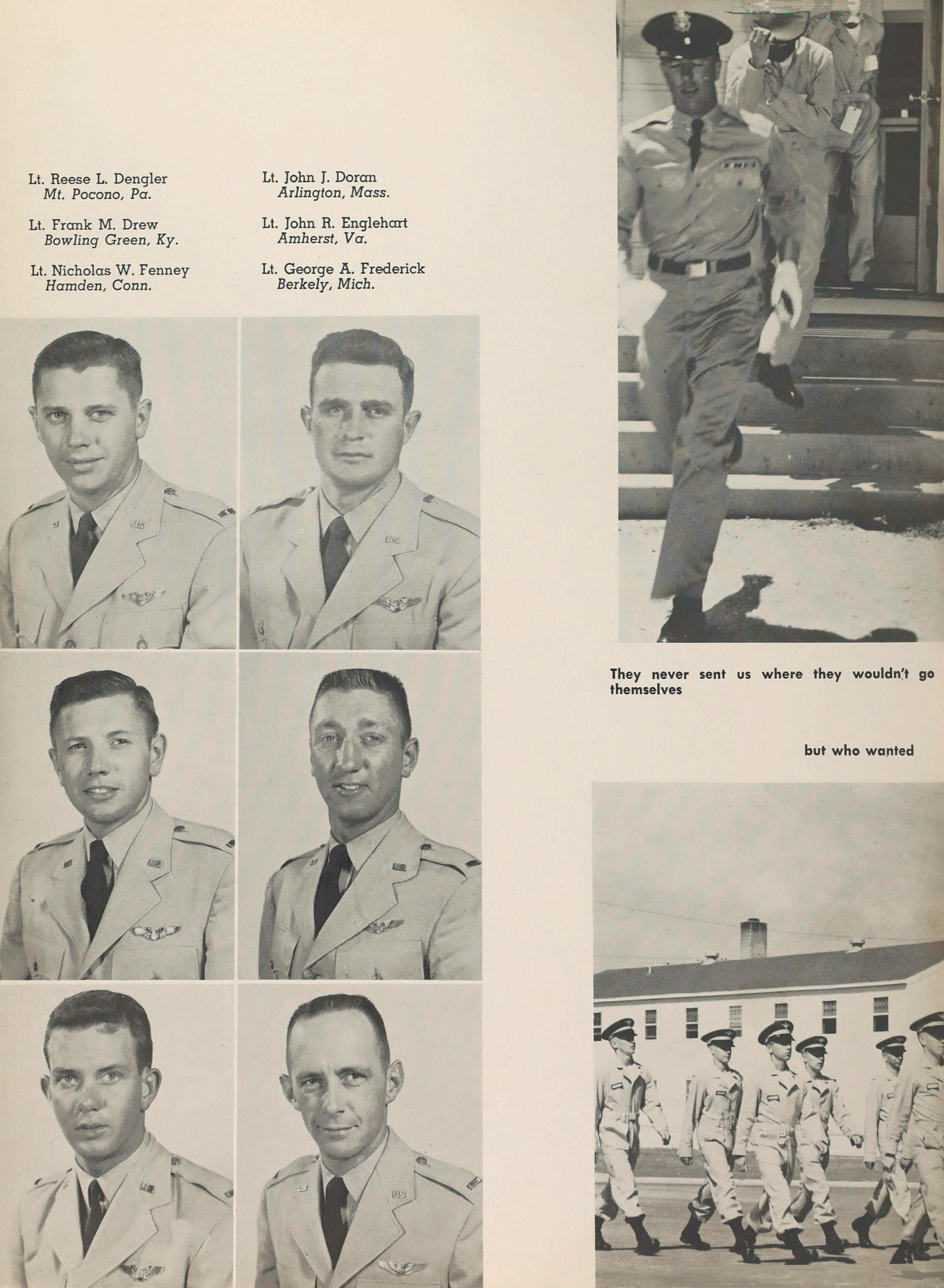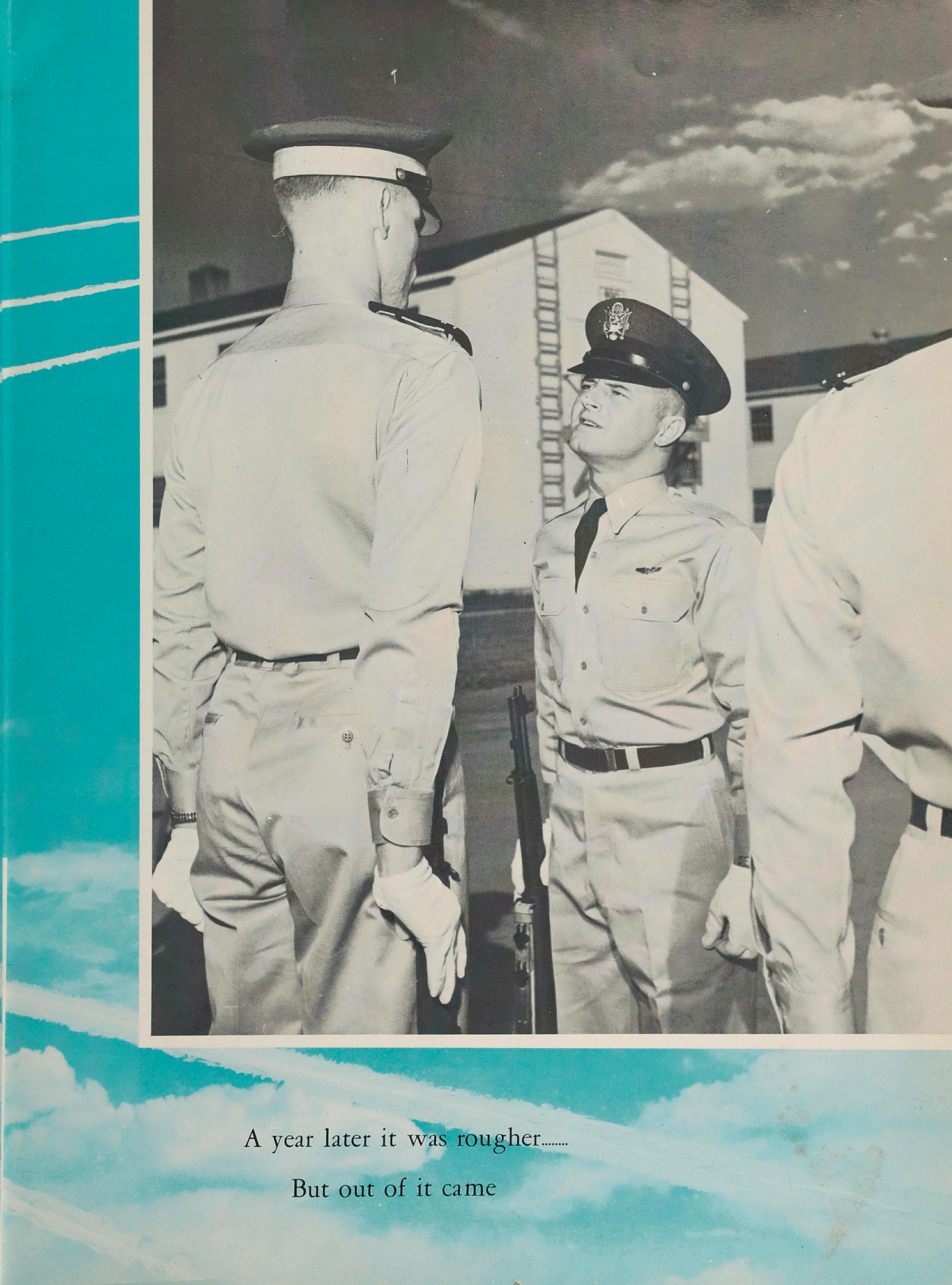 The name “Downwind” is the first title in a series of three which will bring us up to the first big yearbook of 1959. The 1957 book will be called “Base Leg and the 1958 book will be called “Final Approach.” The naming of the fourth-year book a name which will become permanent has been postponed until 1959 in order to give as many cadets as possible a chance to choose the name of this first full-size book which will become part of the Academy tradition.