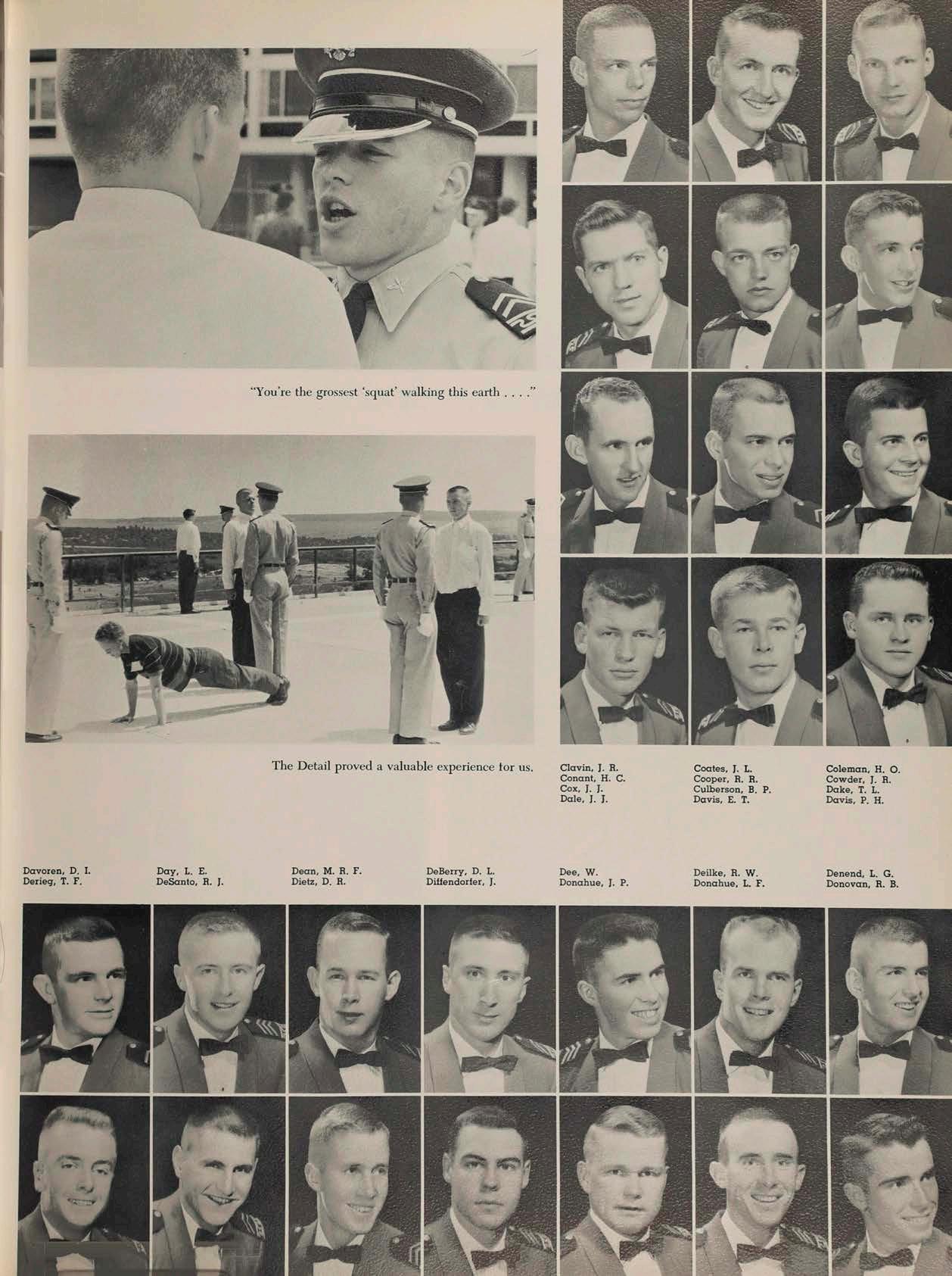 From a still high on a Chattanooga Hill, Don entered the Academy with a serious speech impediment—a Southern accent. He adjusted to this civilized life well, obtcrining high grades, the Pop Warner AllAmerica Scholastic Football Award, and a hatred of academics. His talents include a neat interpretation of an Alpine avalanche while asleep, as well as a 1000% record of defeats against Leo Johnson at handball. A 4th Class Christmas engagement destroyed any possibilities of exploiting his bachelor traits.