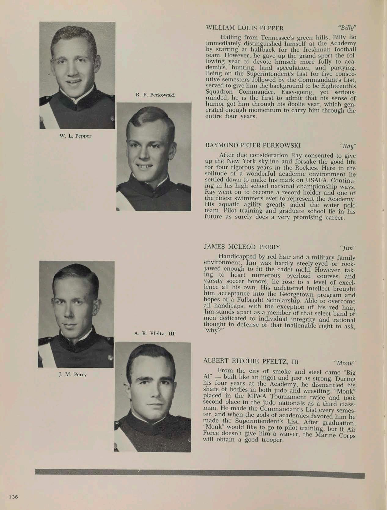 Lew came to USAFA after two years of study at a small college in Ohio. His ready wit and charming sense of humor quickly made him many friends at the Academy. He soon proved that he was the master of the academic program, making the Dean’s List five times out of the first six semesters. His high level of motivation and leadership potential placed him on the Commandant’s List one semester. He played freshman football his first semester and since then has been an invaluable asset to his squadron’s intramural teams. His all-around development during his stay at the Academy should insure his future success in the Air Force.