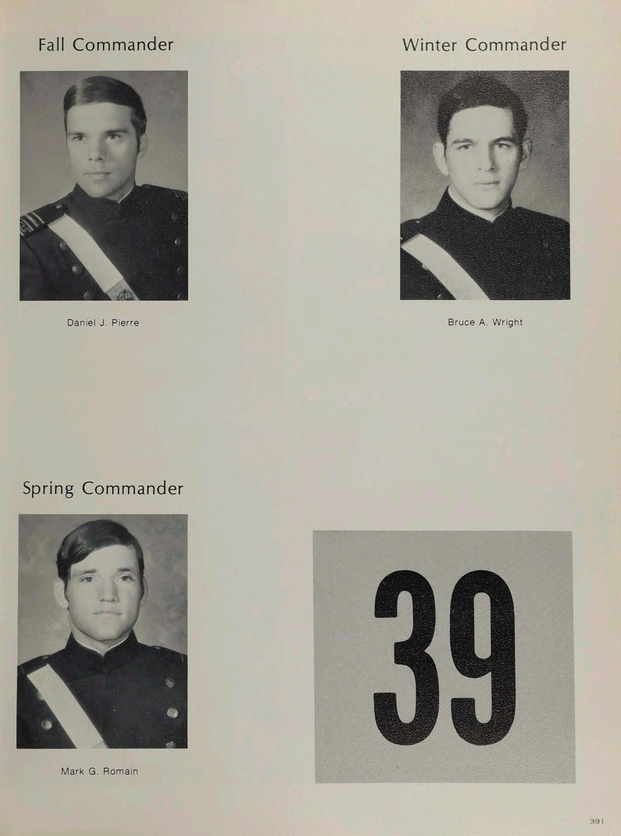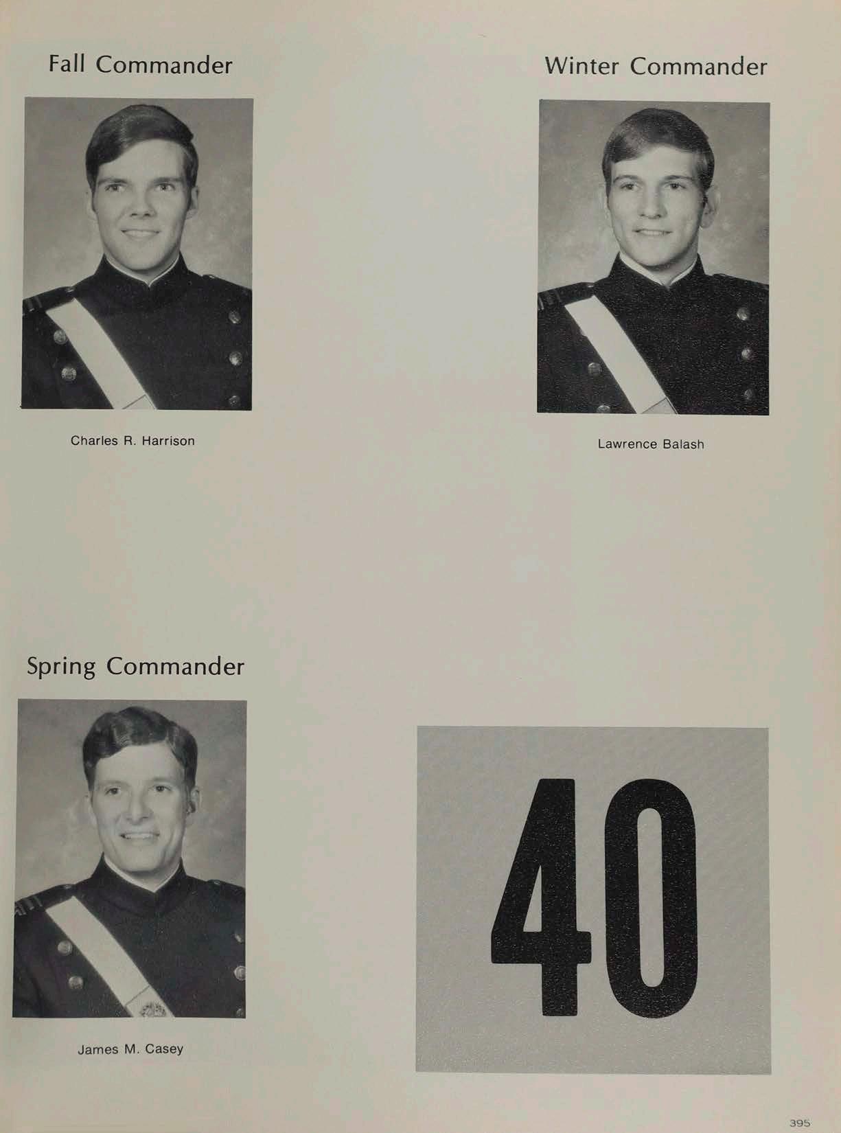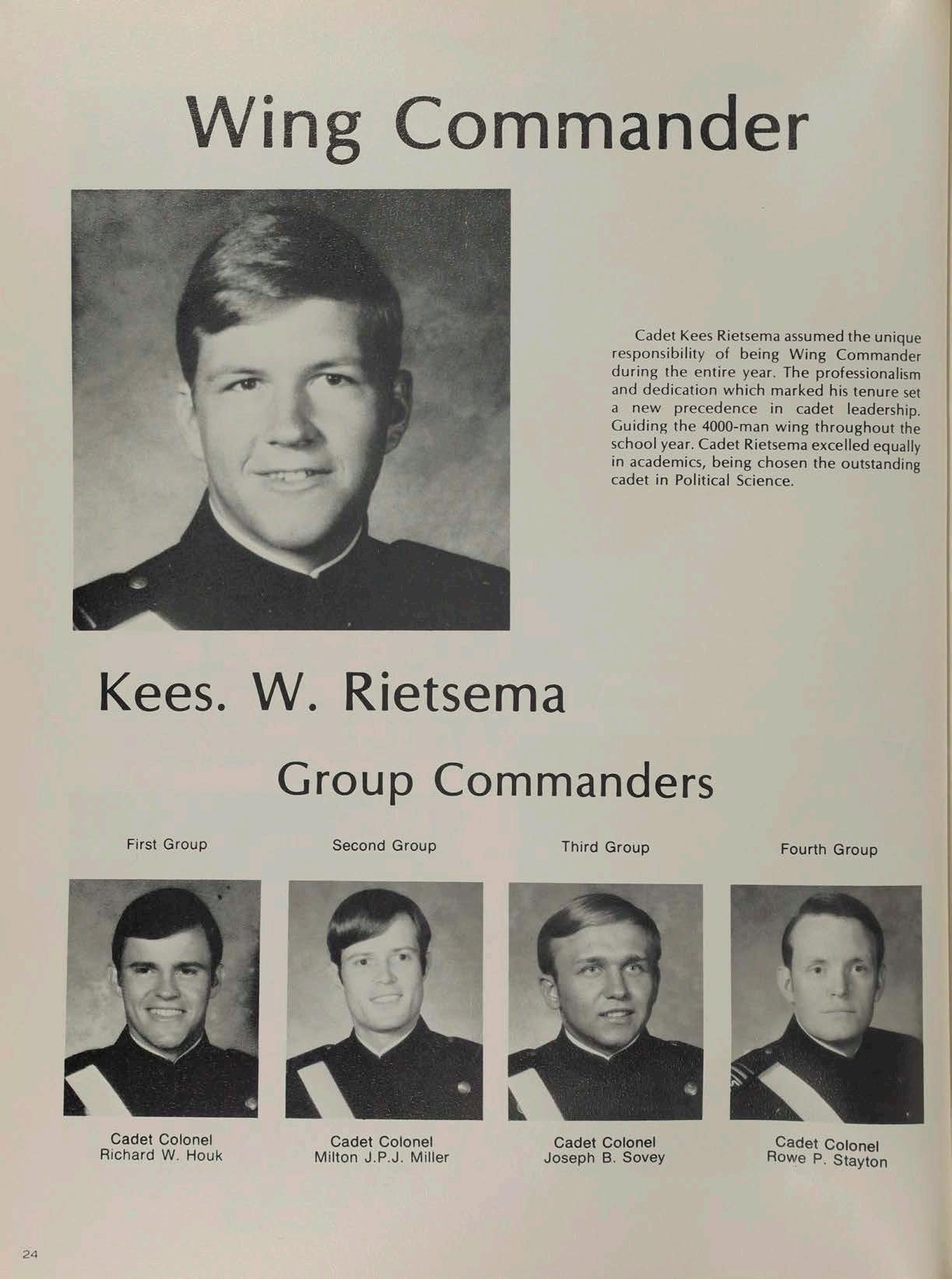 Cadet Kees Rietsema assumed the unique responsibility of being Wing Commander during the entire year. The professionalism and dedication which marked his tenure set a new precedence in cadet leadership. Guiding the 4000-man wing throughout the school year. Cadet Rietsema excelled equally in academics, being chosen the outstanding cadet in Political Science.