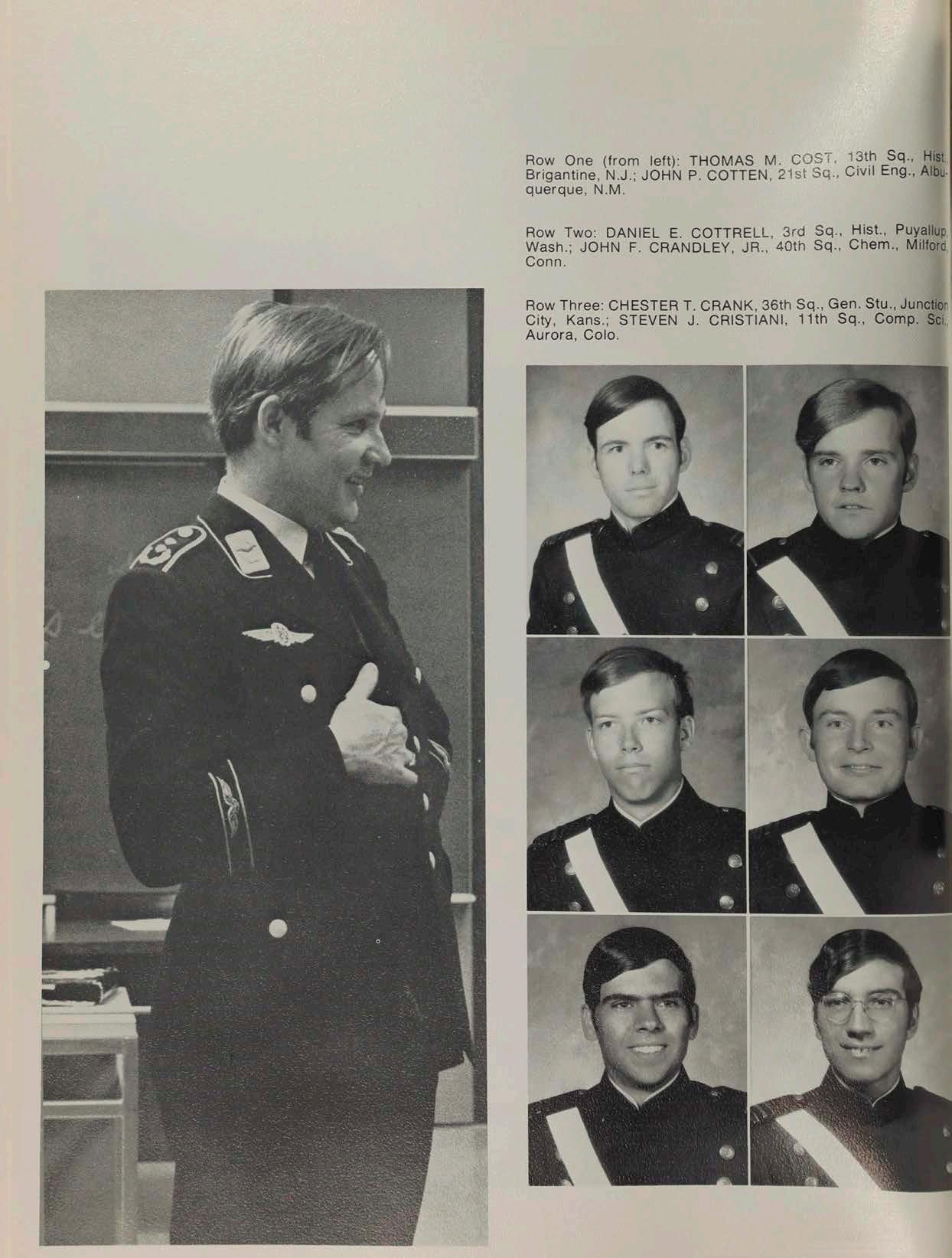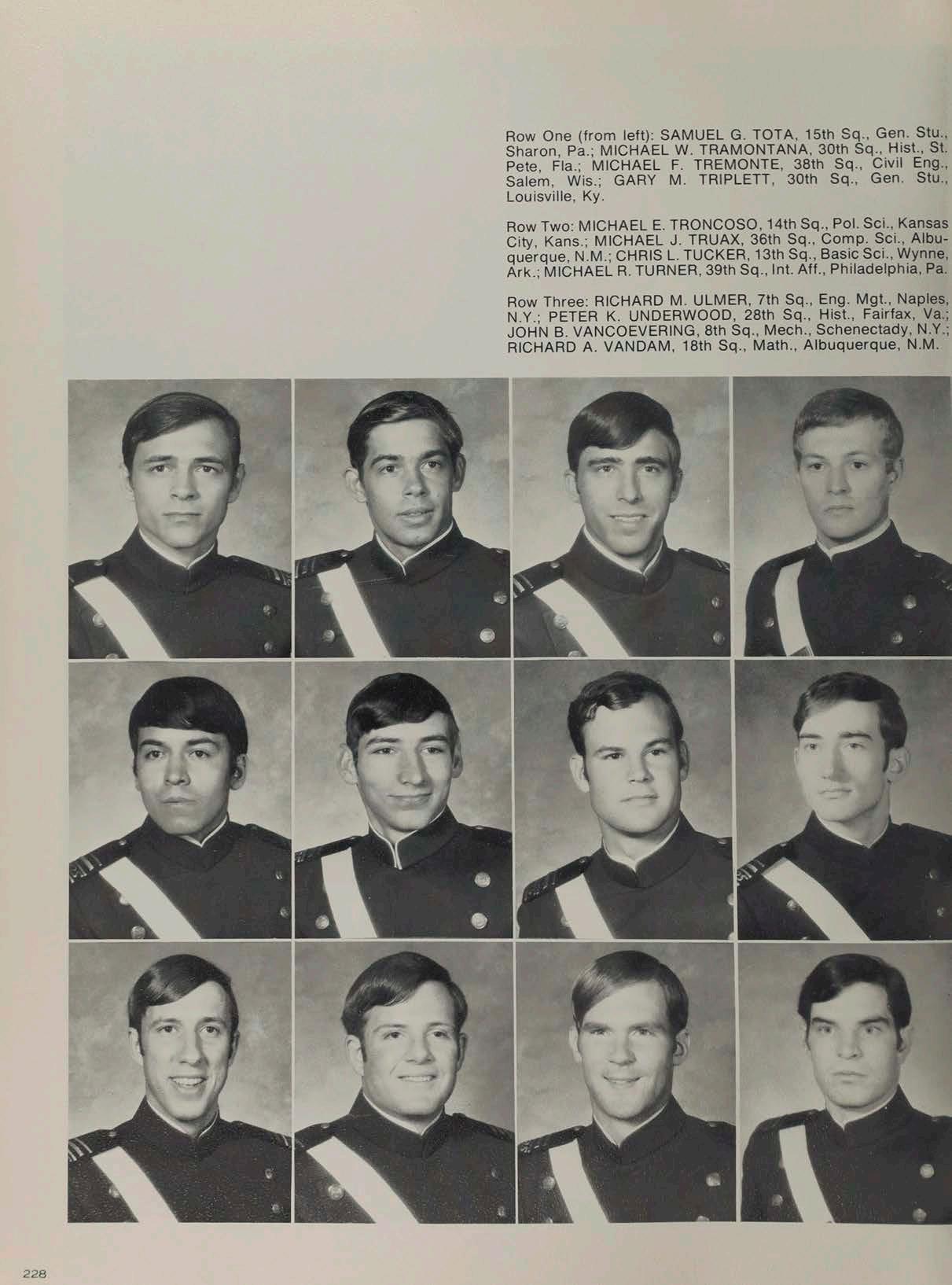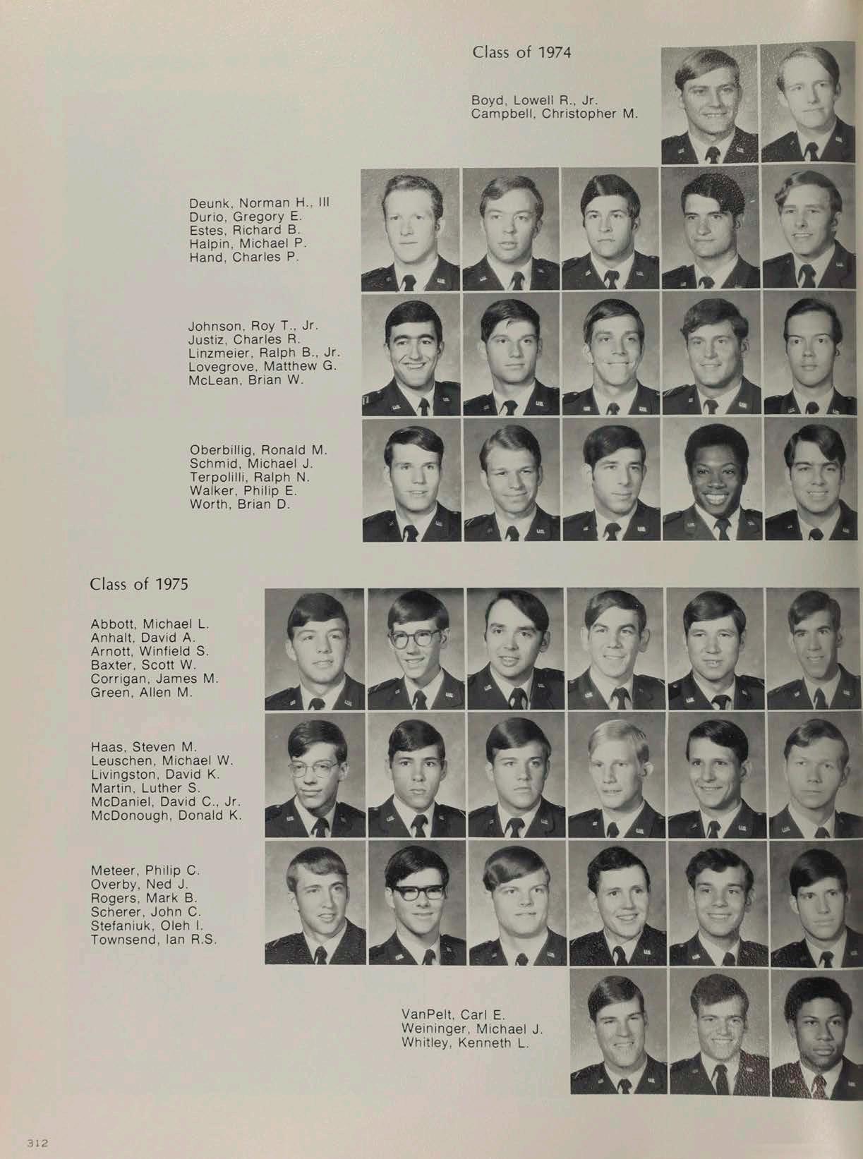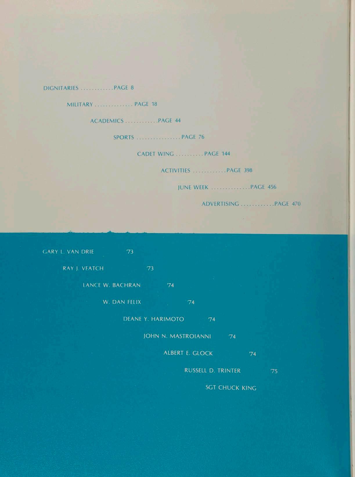 DIGNITARIES PAGE 8 MILITARY ACADEMICS SPORTS PAGE 18 PAGE 44 PAGE 76 CADET WING PAGE 144 ACTIVITIES PAGE 398 JUNE WEEK PAGE 456 ADVERTISING PAGE 470 GARY L. VAN DRIE 73 RAY J. VEATCH 73 LANCE W. BACHRAN 74 W. DAN FELIX 74 DEANE Y. HARIMOTO 74 JOHN N. MASTROIANNI ALBERT E. GLOCK RUSSELL D. SGT CHUCK KING