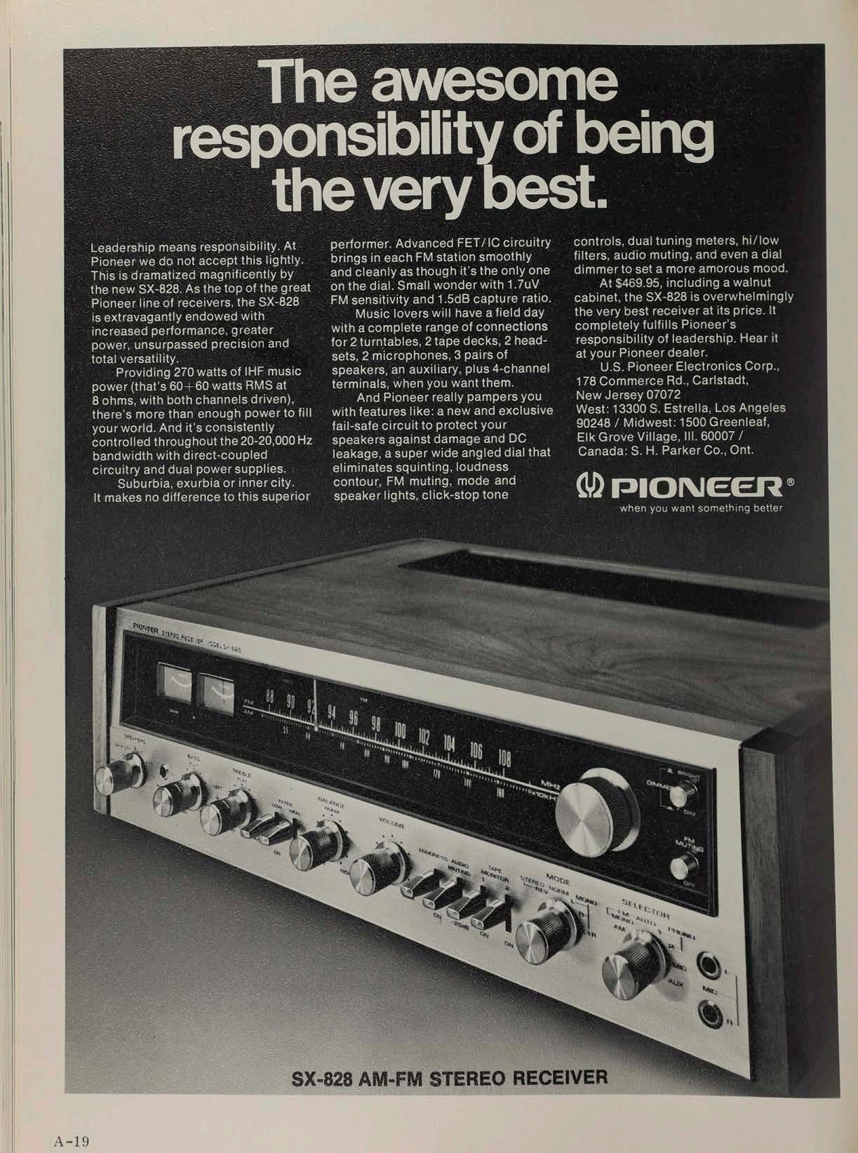 Leadership means responsibility. At Pioneer we do not accept this lightly. This is dramatized magnificently by the new SX-828. As the top of the great Pioneer line of receivers, the SX-828 is extravagantly endowed with increased performance, greater power, unsurpassed precision and total versatility.