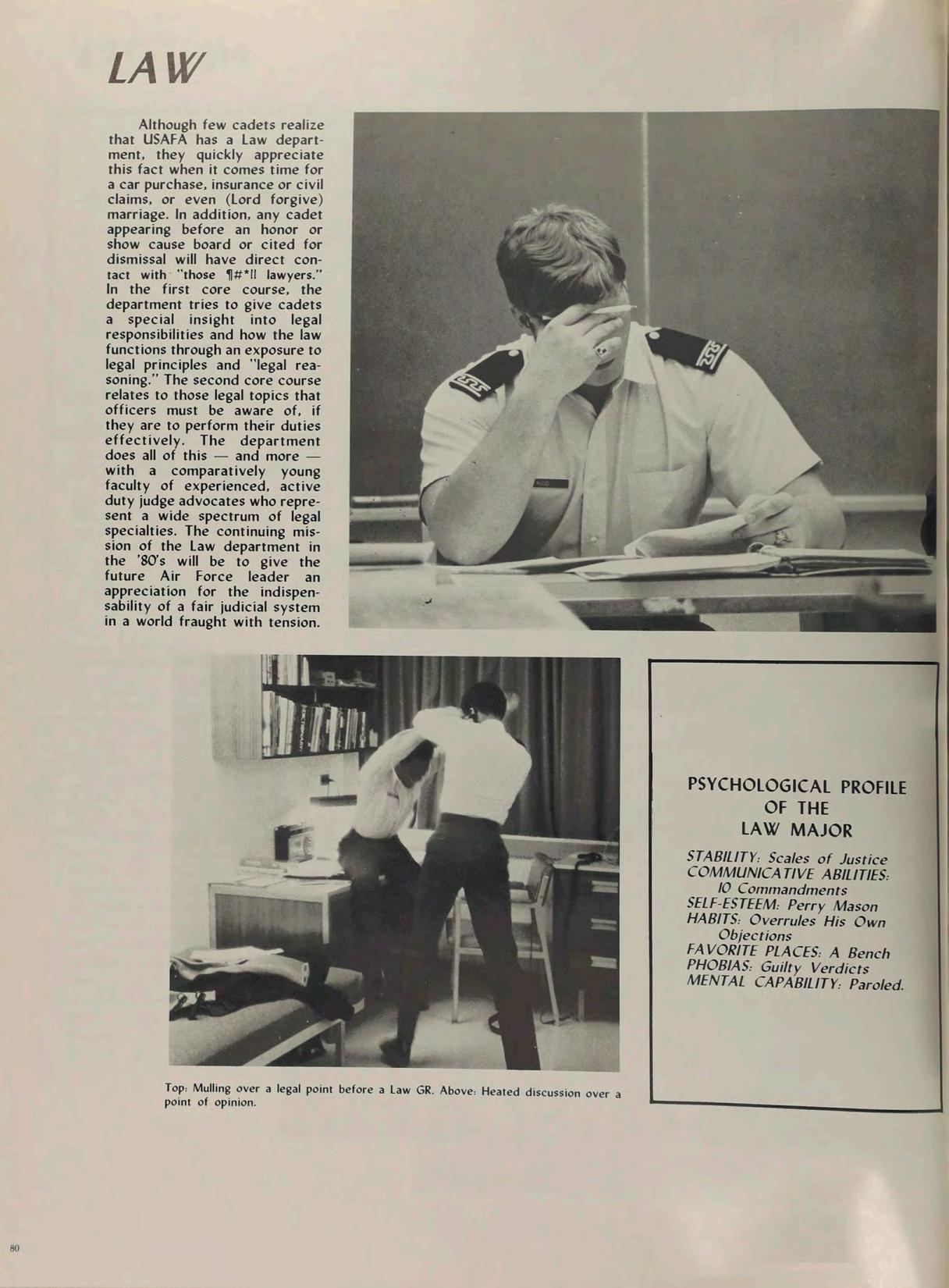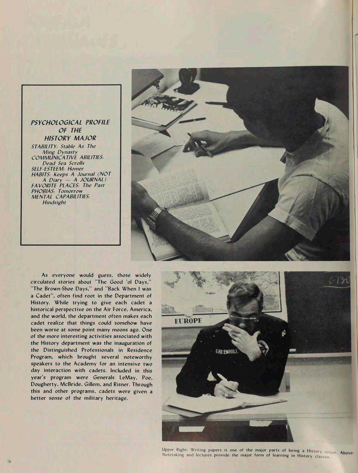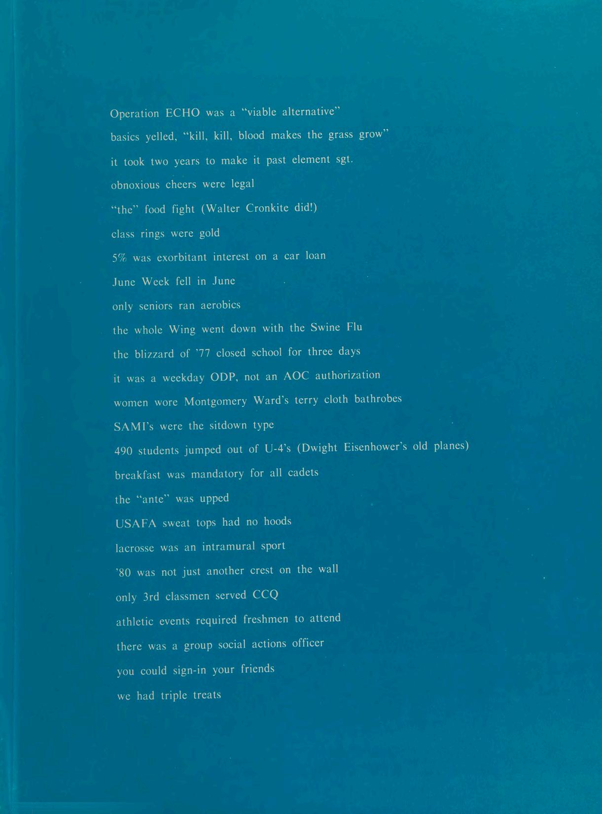 As we enter the new decade, society as well as the Air Force Academy has begun to realize that change is imminent. These changes can be seen directly with each year’s entering class. As Vietnam had a marked effect on classes from the early and mid-seventies, Iran will probably change some attitudes in the next few classes also.
