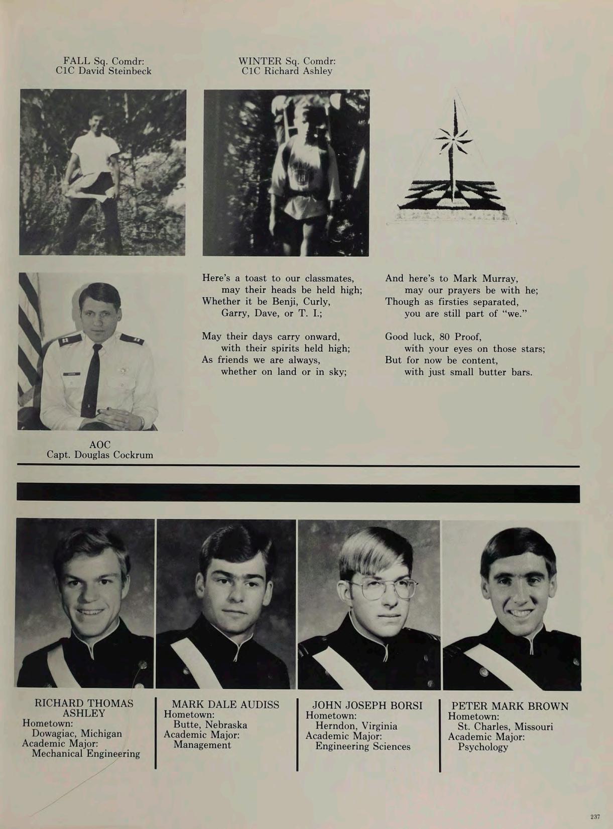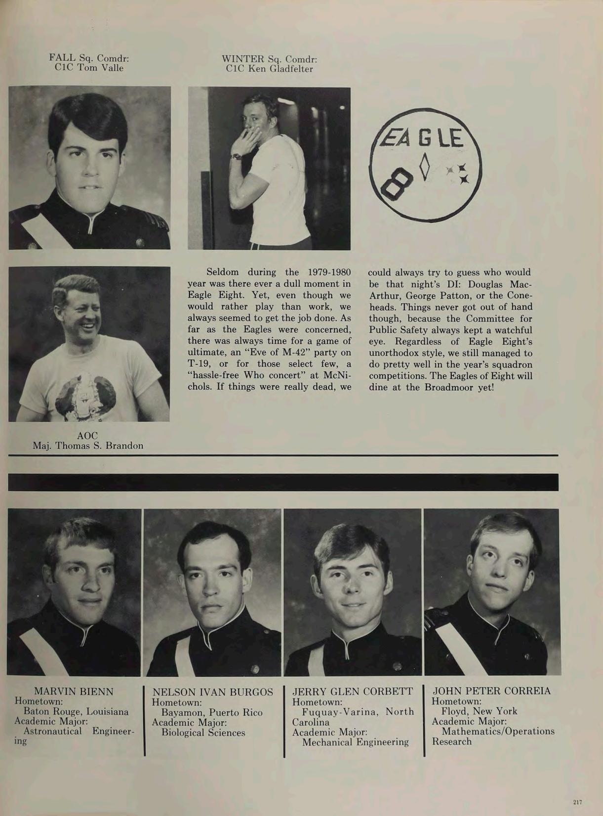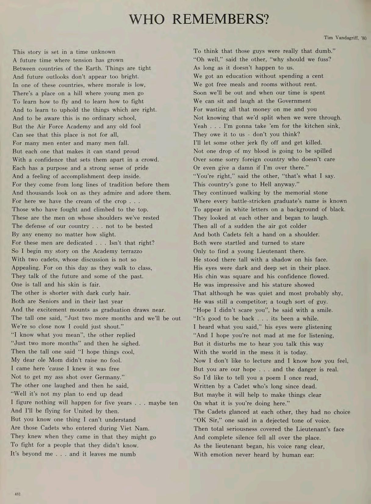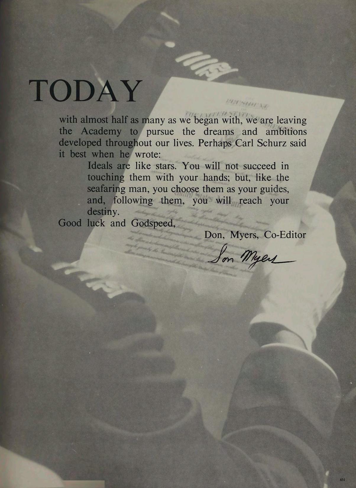 Donald N. Myers Co-Editor 1980 POLARISAt times, this may sound very idealistic; however, my faith in fellow man is optimistic. I have gained that faith from the cadets I have known over the past four years; young people who will be the backbone of tomorrow’s society. If you have lost respect for your classmates over the four years, or havebecome apathetic, or worse still, just do not care about anything that happens anymore stop. Remember that your children will criticize our generation the same way we chastise our parents’ generation, unless we are willing to make and accept the changes that are occurring now.