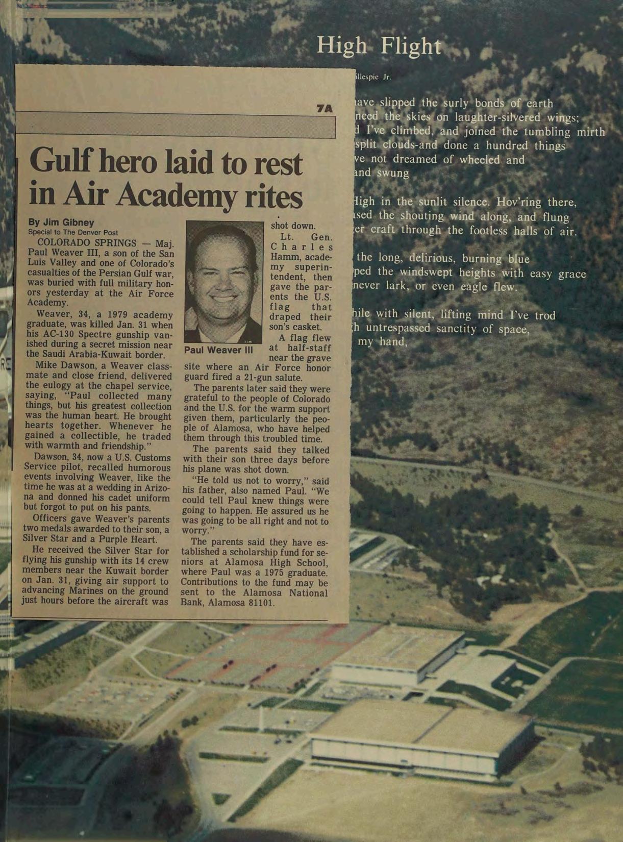 Paul Weaver III, a son of the San Luis Valley and one of Colorado’s casualties of the Persian Gulf war, was buried with full military honors yesterday at the Air Force Academy.
